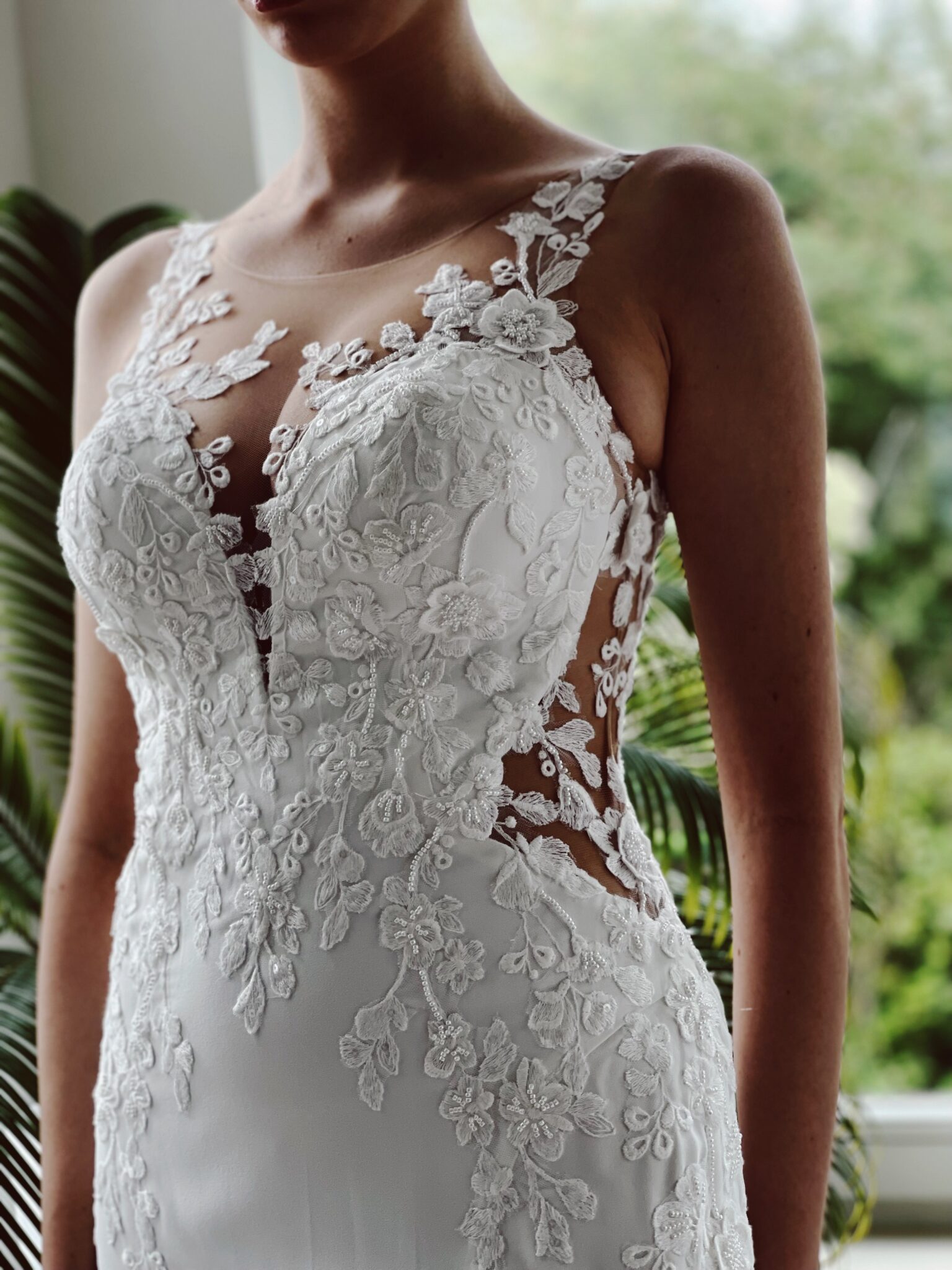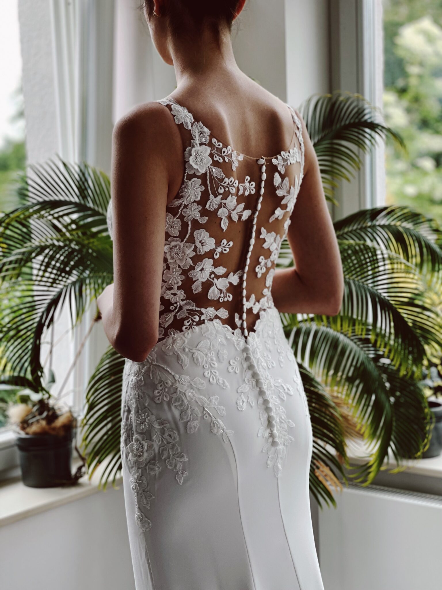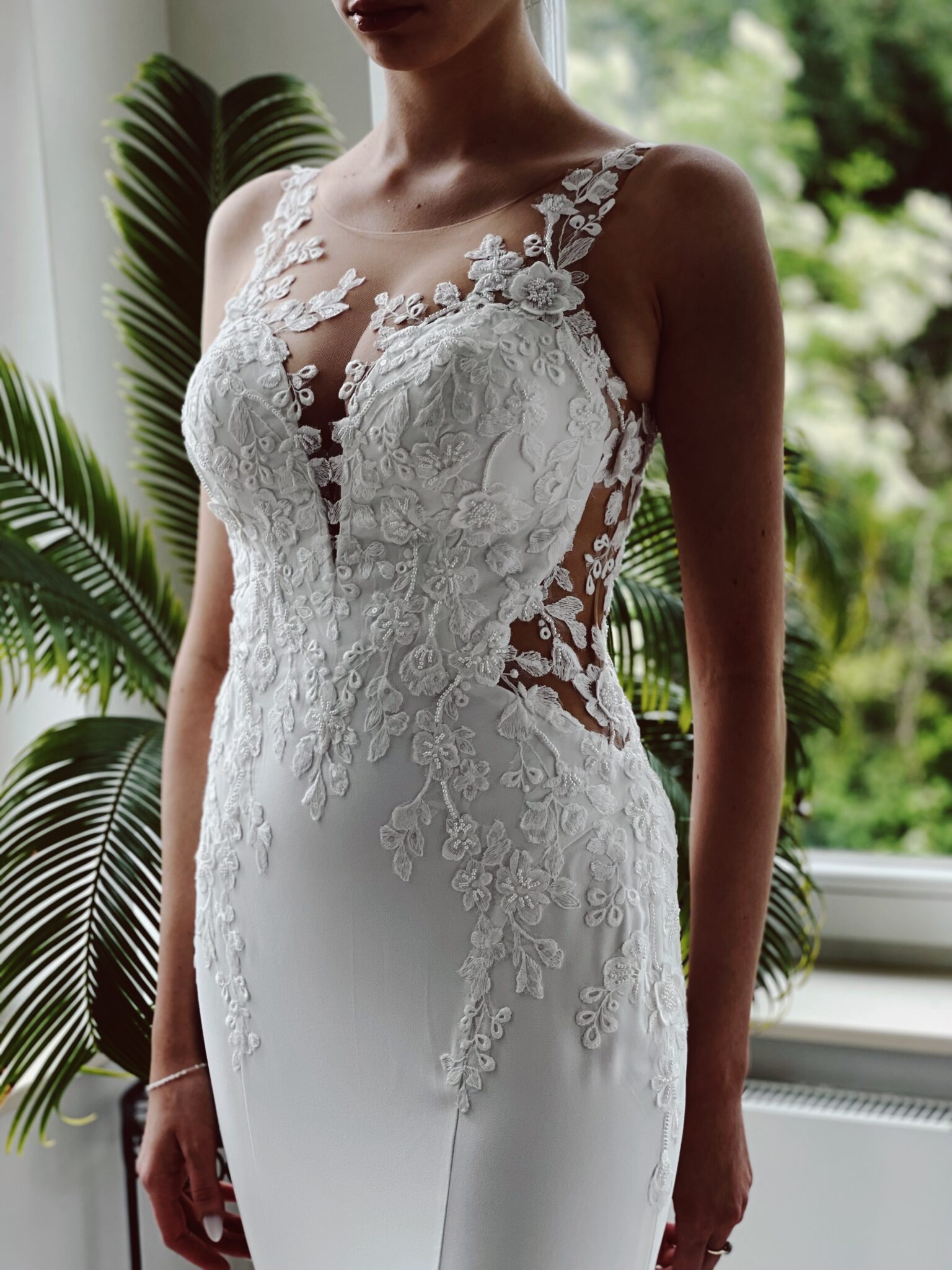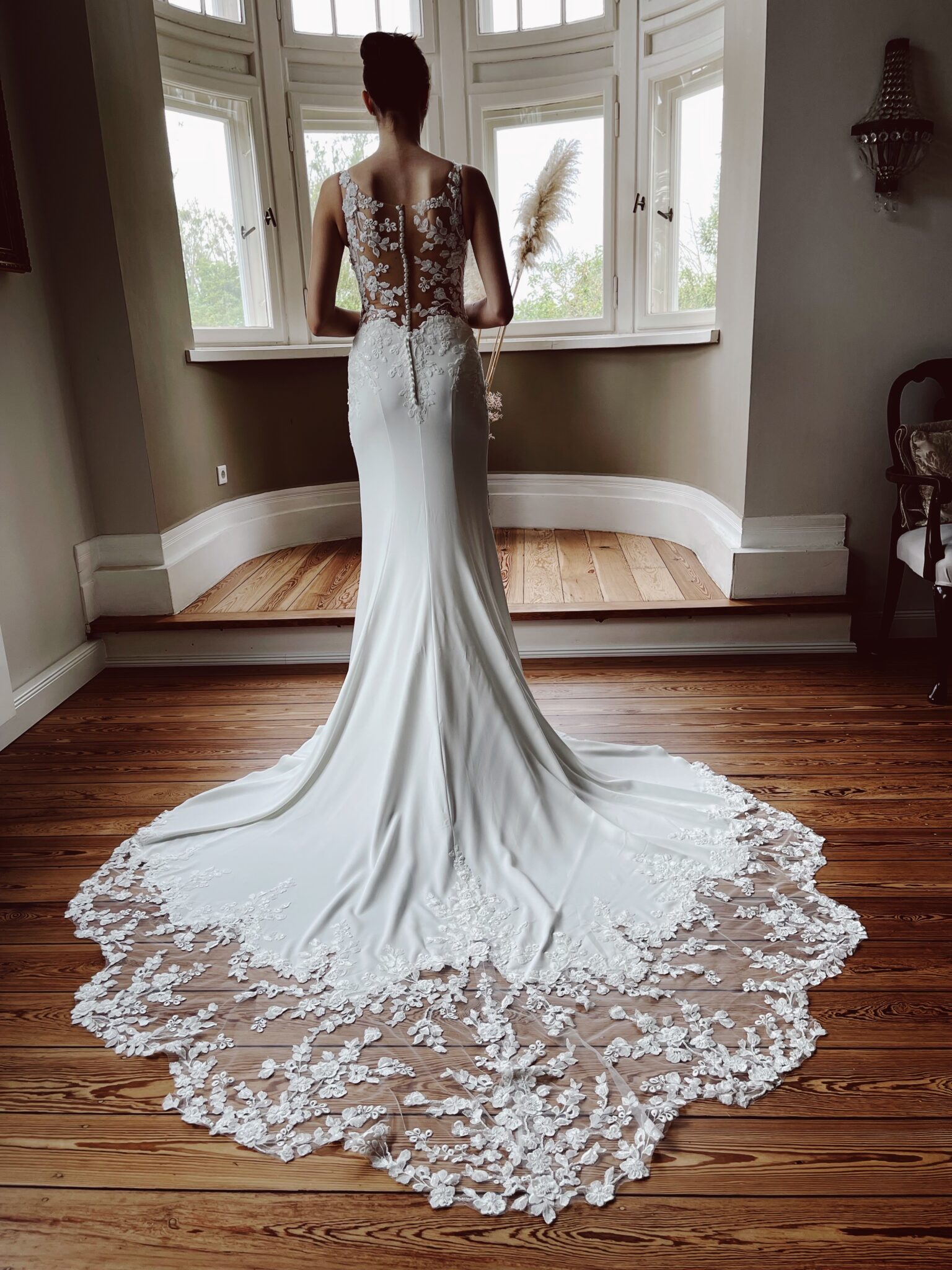 Fit & flare Brautkeid mit cut outs, floralen Spitzenapplikationen und einem geschlossenen Rücken in Tattoo-Optik. Unser Model ist 1,78 m, trägt Gr. 36/38 und hat Körbchengröße: 75E mit den Maßen: B: 89cm, T: 66cm, H:97cm.