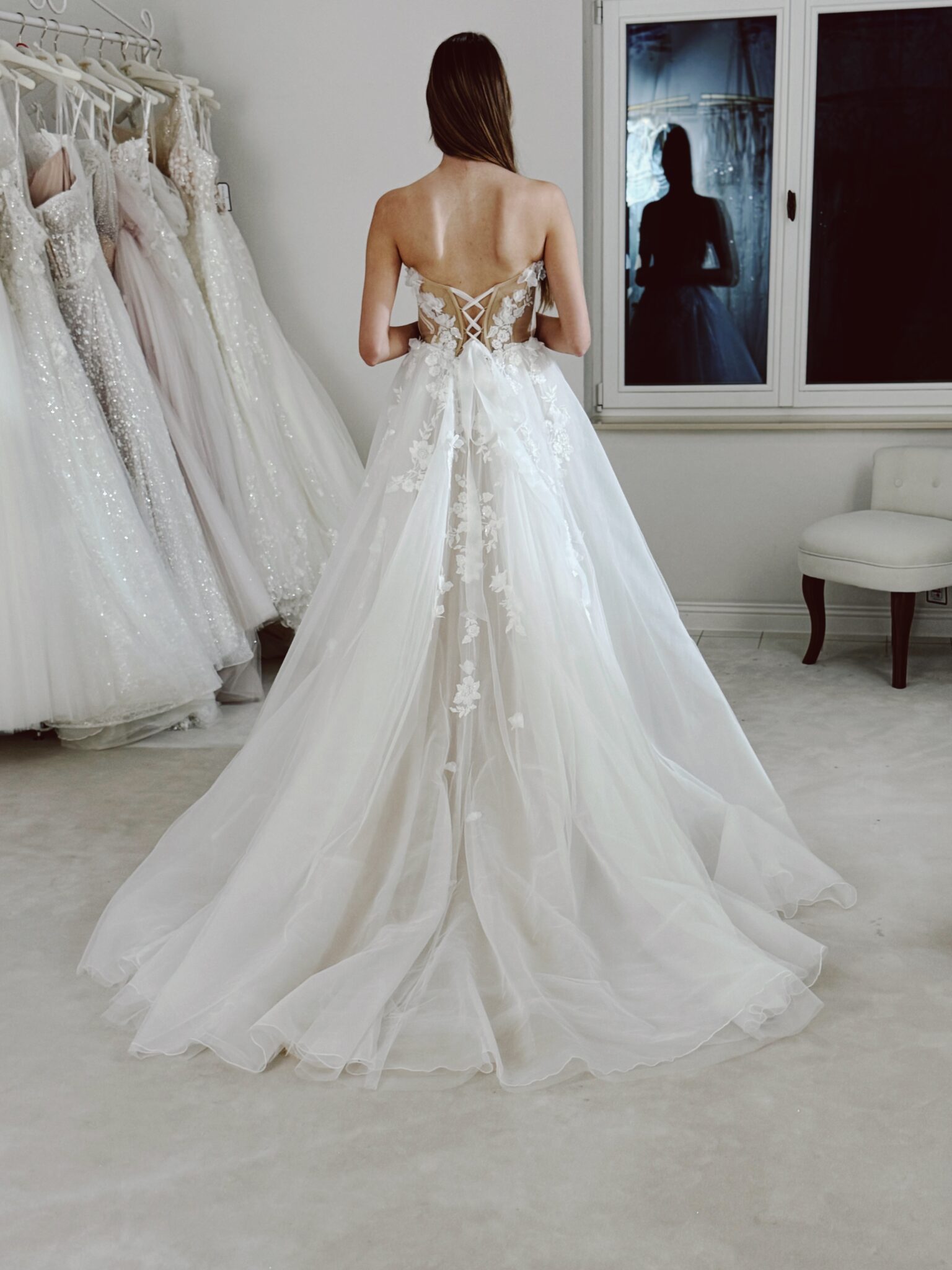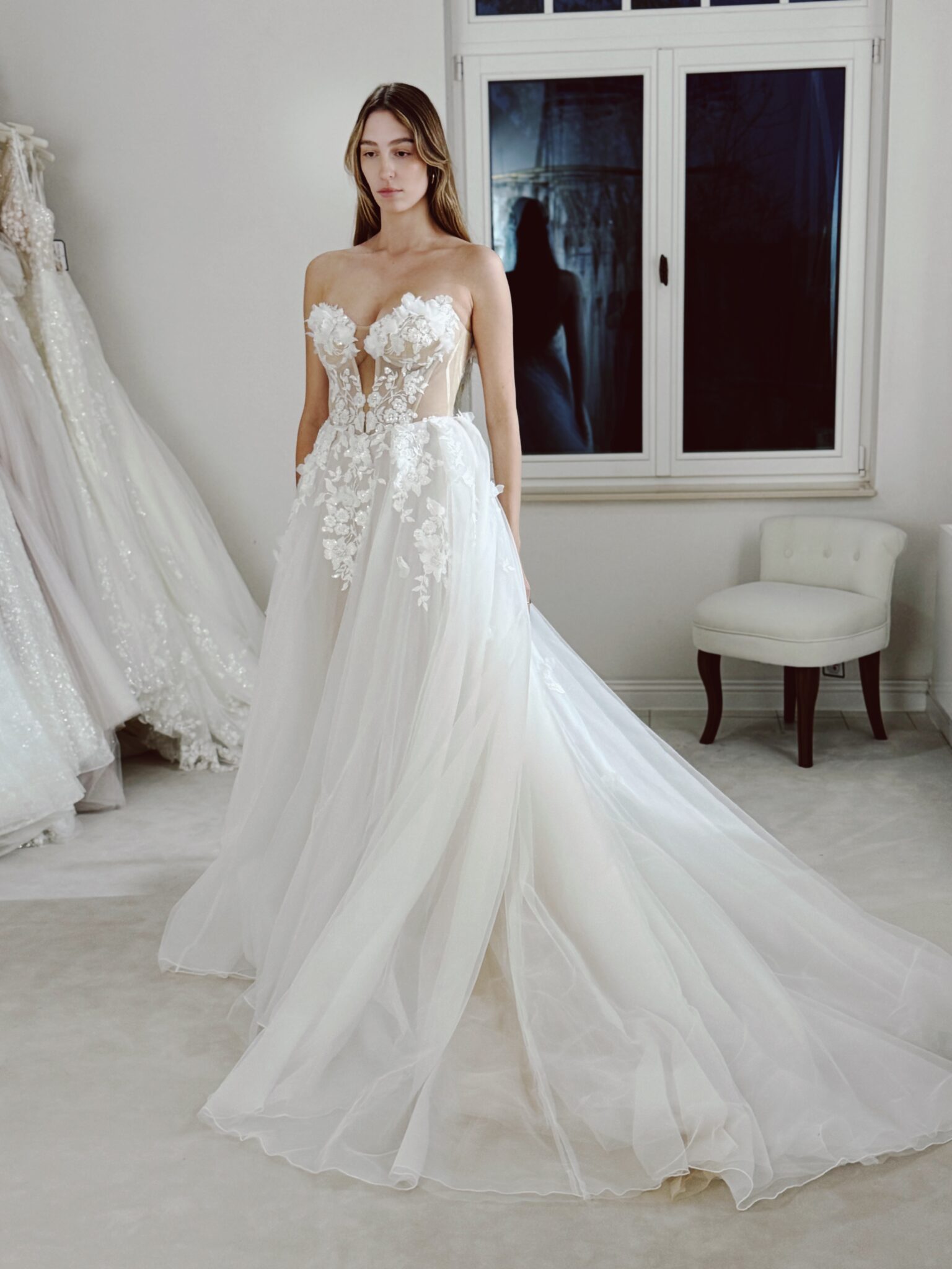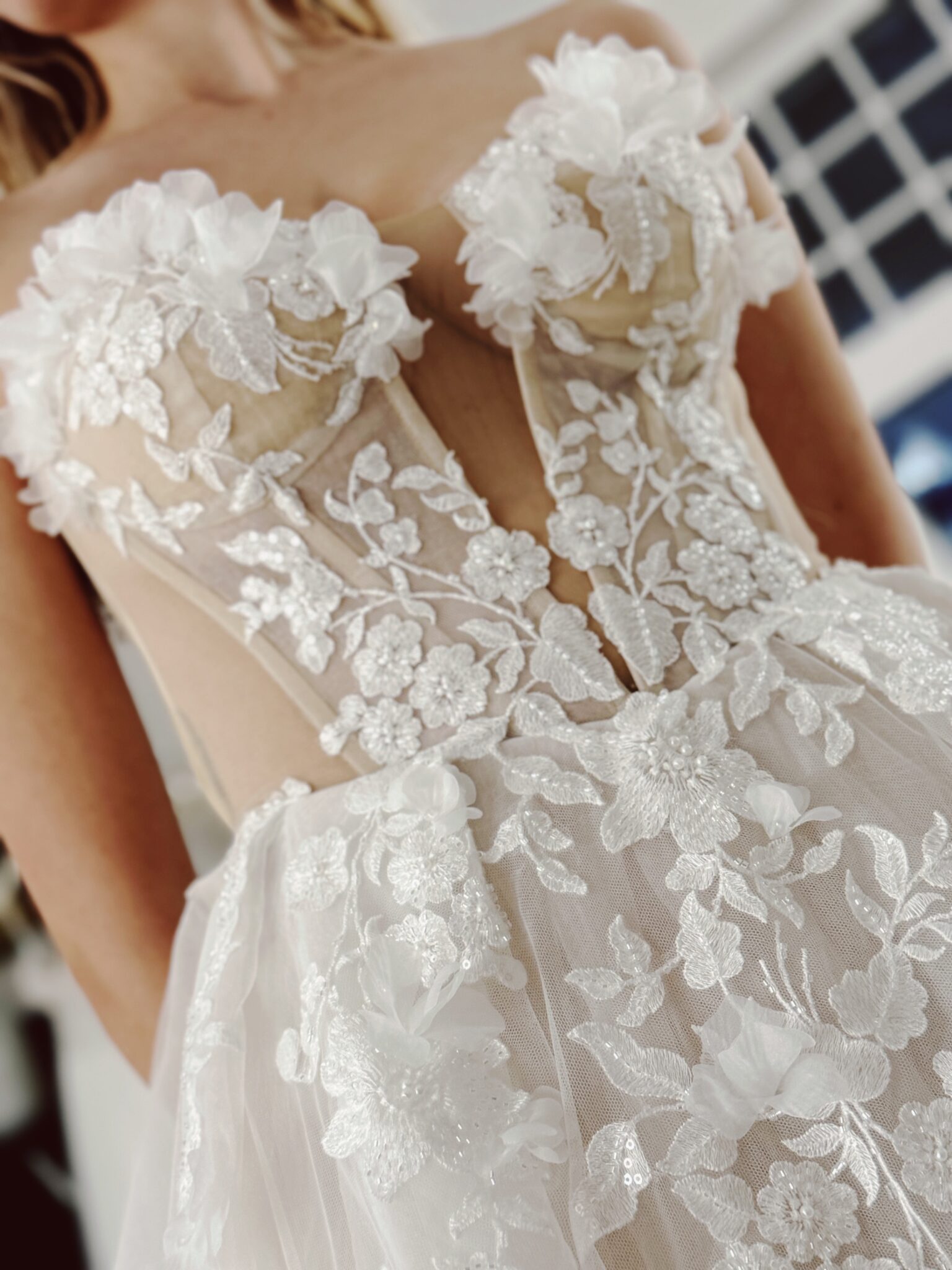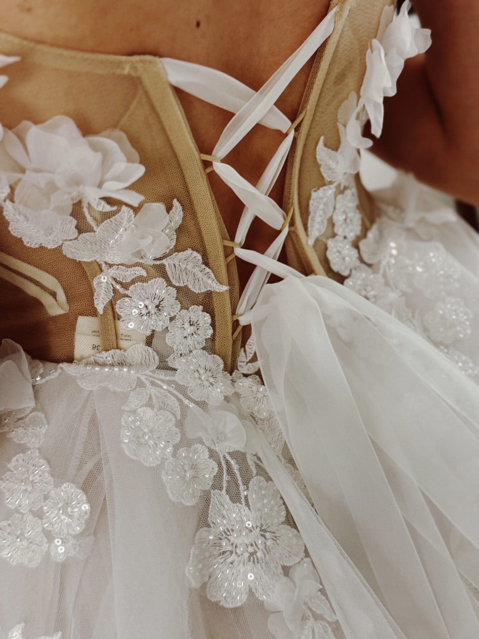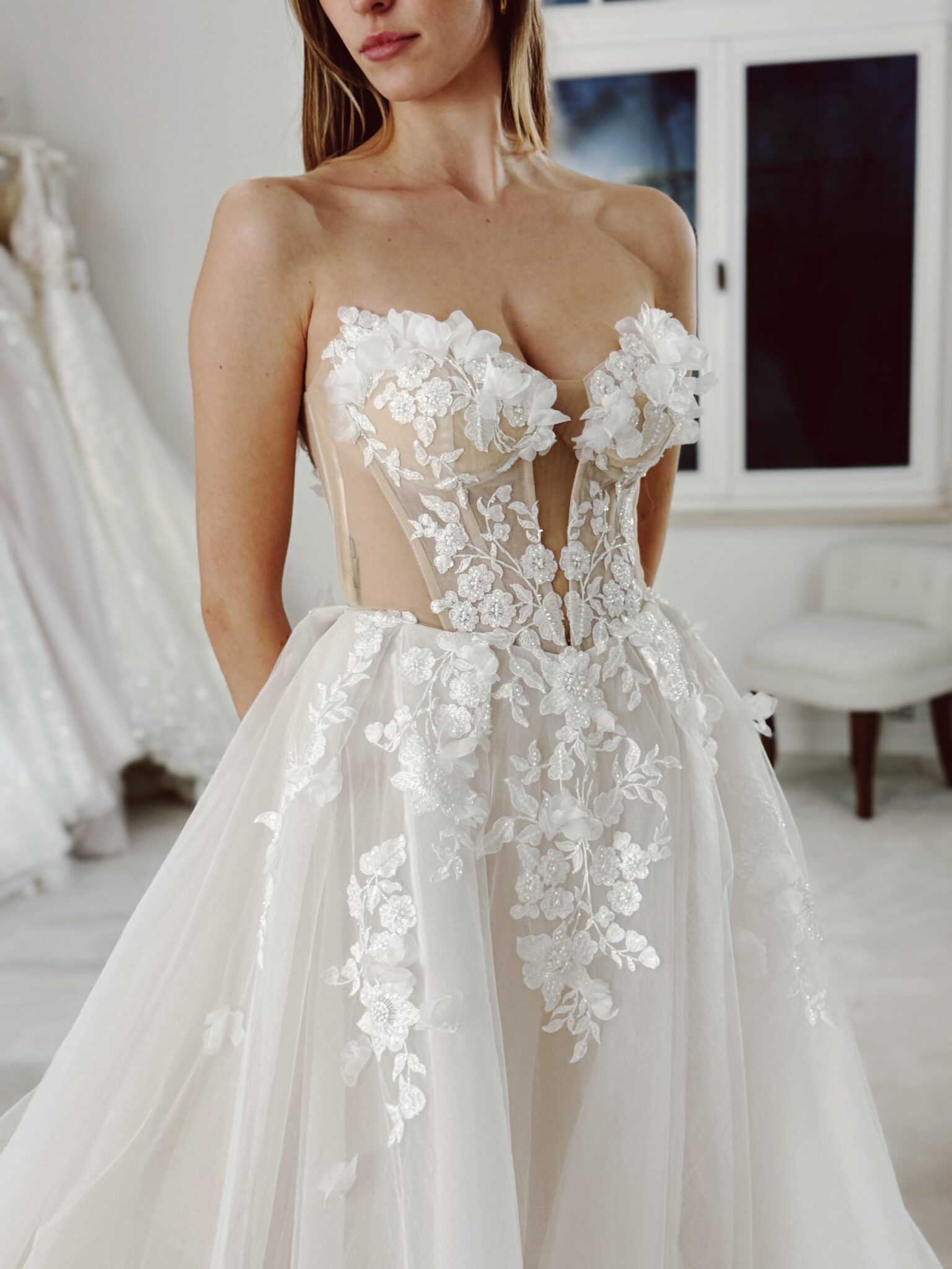 A-Linie mit einem herzförmigen Ausschnitt im Dekolleté, Cut Outs vorne und an den Seiten, mit 3D-Blumen bestickt und einer offenen Schnürung im Rücken. Das Kleid in Gr. 34 passte: Unser Model ist 1,78 m, trägt Gr. 36/38 und hat Körbchengröße: 75E mit den Maßen: B: 89cm, T: 66cm, H:97cm.