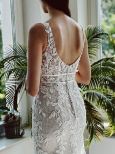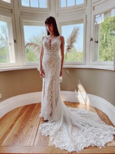 Fit & flare Brautkleid in ivory/sand, mit groben floralen Spitzenapplikationen, graphischen Paillettenmusterstoff in der 2. Lage, zwei abnehmbaren Taillenbändern. Unser Model ist 1,78 m, trägt Gr. 36/38 und hat Körbchengröße: 75E mit den Maßen: B: 89cm, T: 66cm, H:97cm.