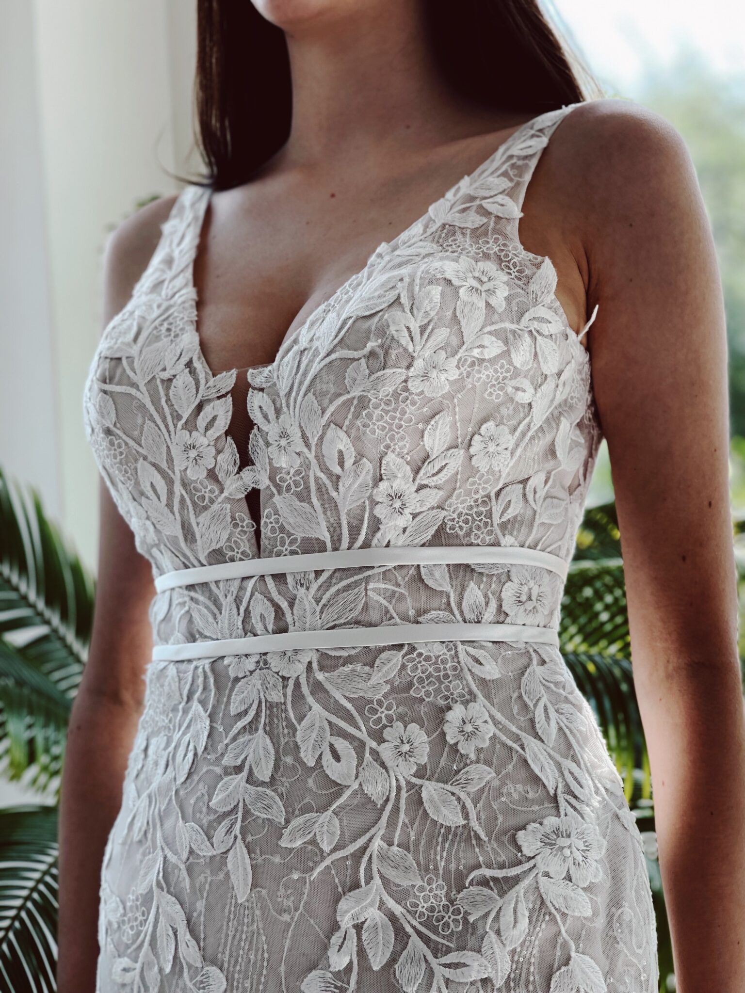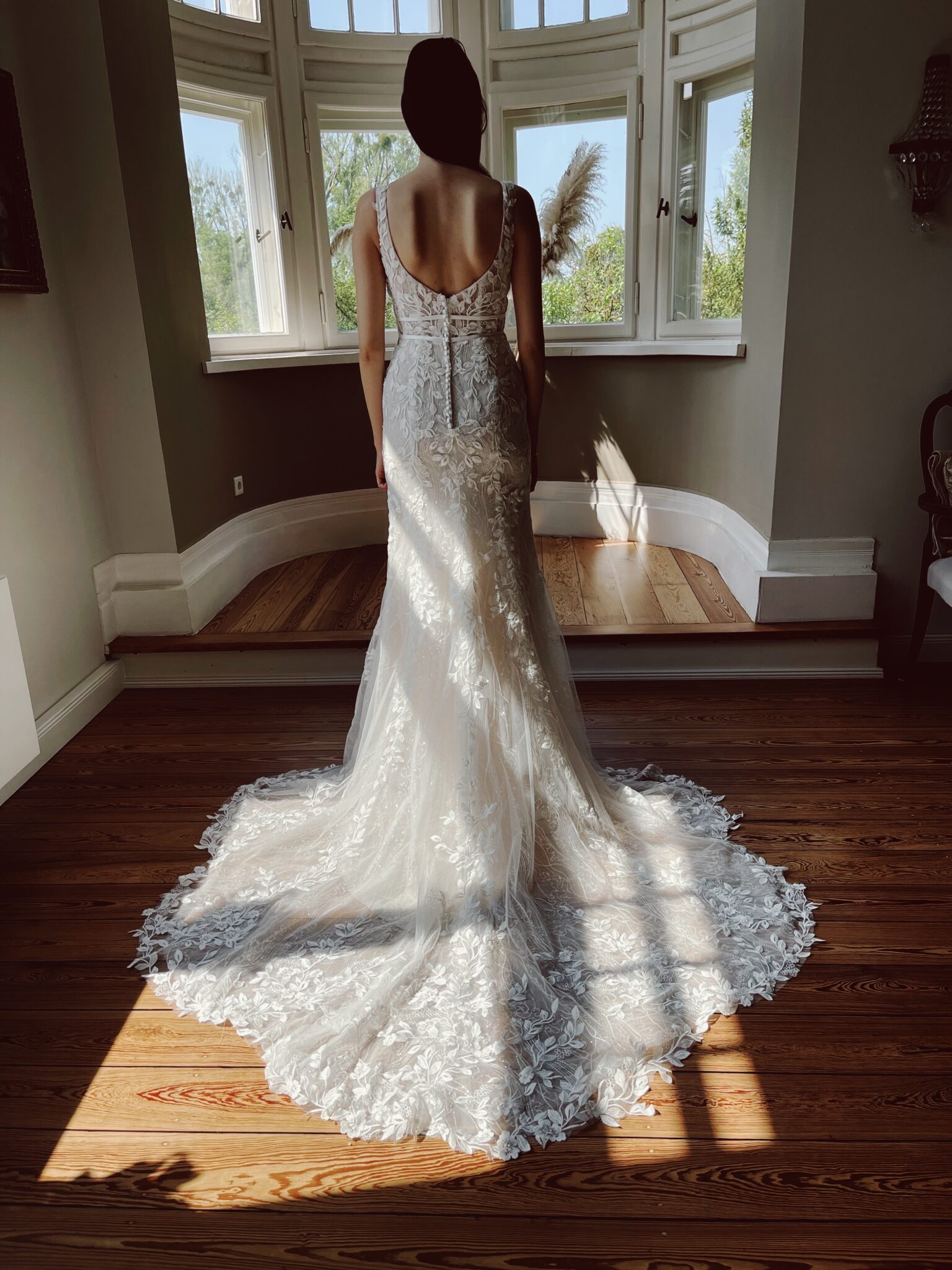 Fit & flare Brautkleid in ivory/sand, mit groben floralen Spitzenapplikationen, graphischen Paillettenmusterstoff in der 2. Lage, zwei abnehmbaren Taillenbändern. Unser Model ist 1,78 m, trägt Gr. 36/38 und hat Körbchengröße: 75E mit den Maßen: B: 89cm, T: 66cm, H:97cm.