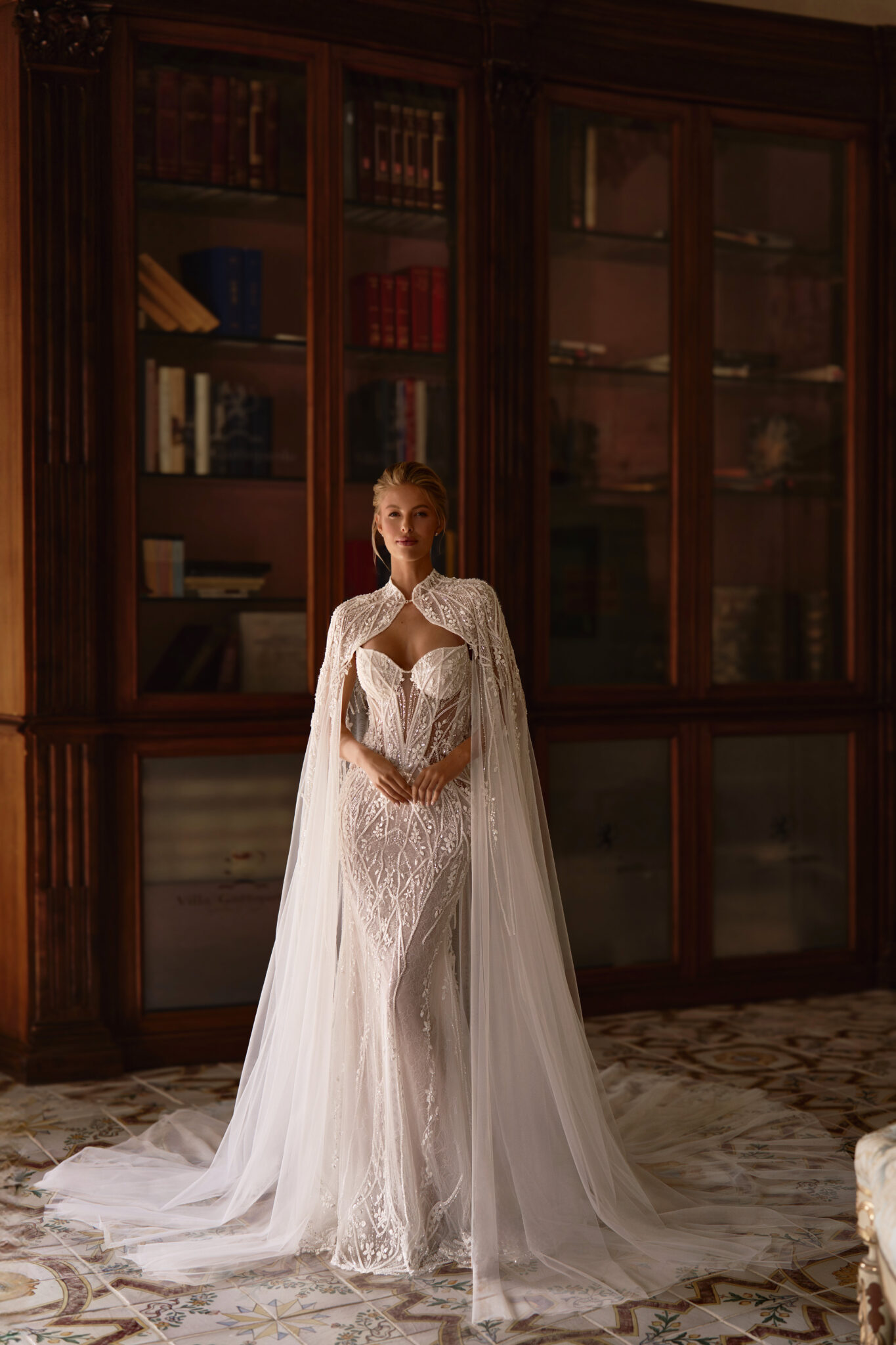 Fit and Flare von Anna Sposa - CITRINA aus floraler Spitze mit Perlen & Pailetten, mit zarten Spaghettiträgern und einem abnehmbaren Umhang. Das Kleid in Gr. 38 passte gut: Unser Model ist 1,78 m, trägt Gr. 36/38 und hat Körbchengröße: 75E mit den Maßen: B: 89cm, T: 66cm, H:97cm.