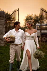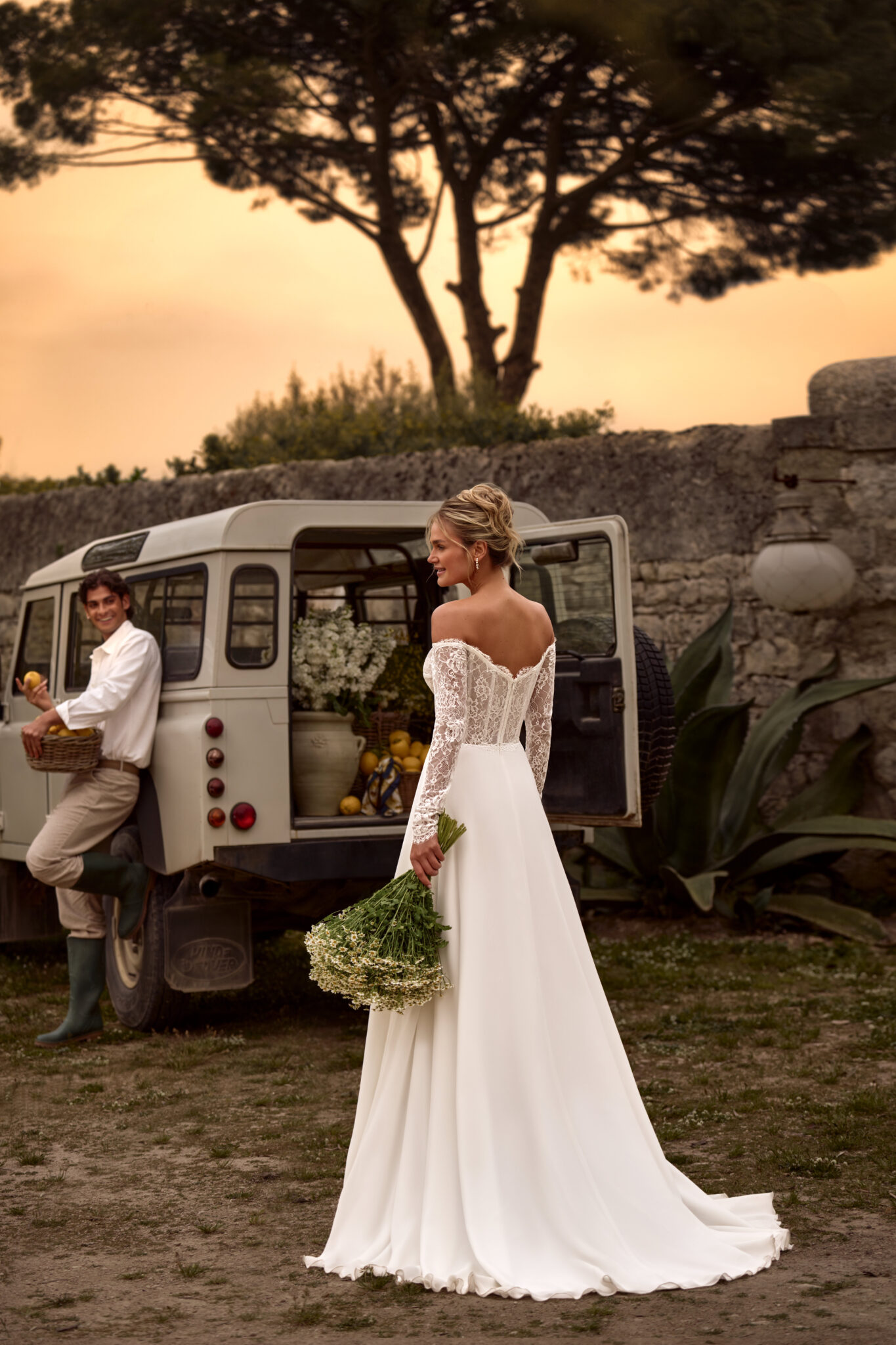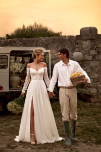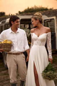 A-Linie von Anna Sposa - GERHART aus einem Chiffon-Rock, mit langen Off-Shoulder-Spitzenärmeln und transprenter Korsage. Das Kleid in Gr. 38 passte gut: Unser Model ist 1,78 m, trägt Gr. 36/38 und hat Körbchengröße: 75E mit den Maßen: B: 89cm, T: 66cm, H:97cm.