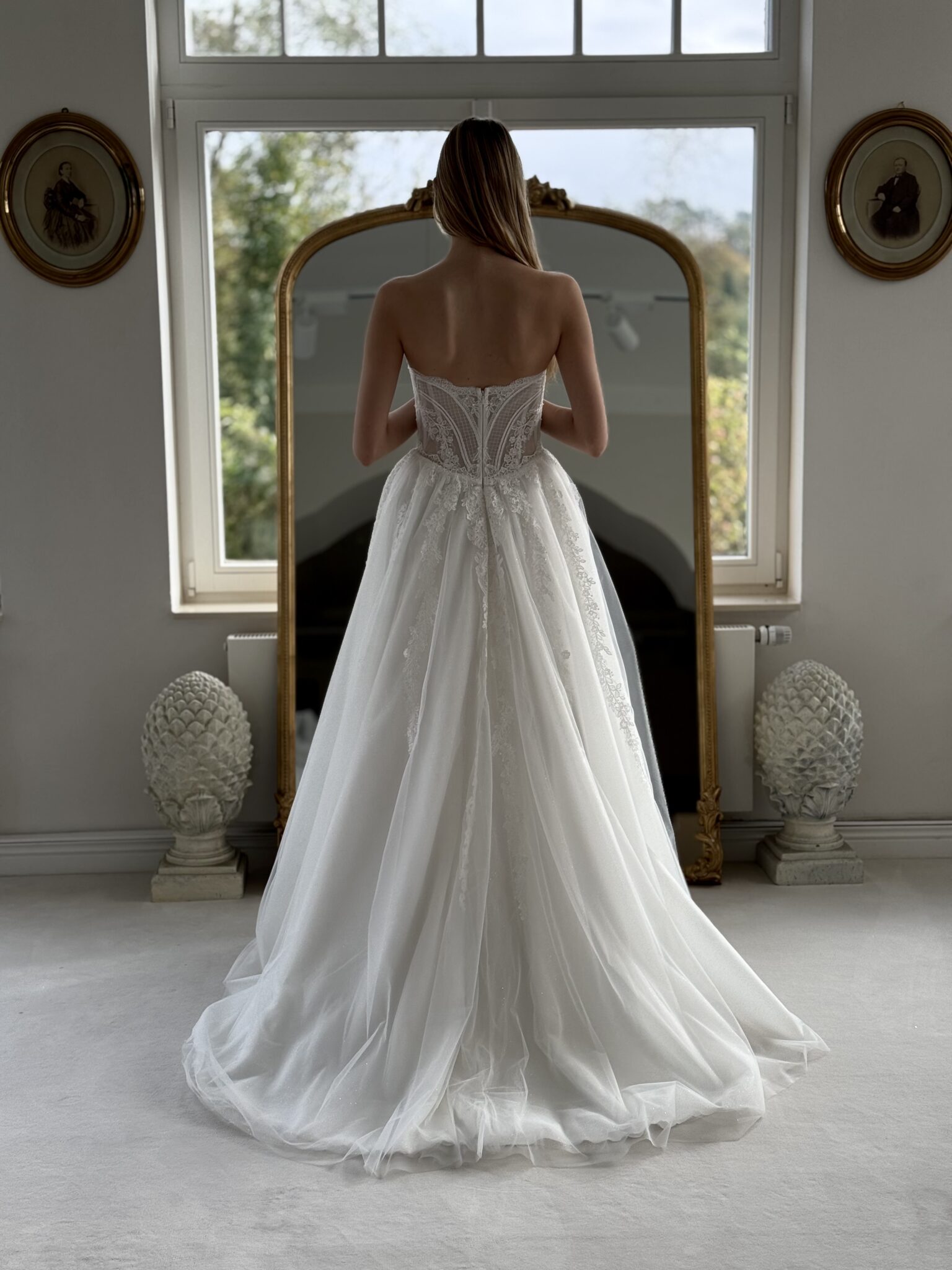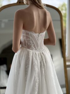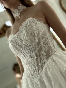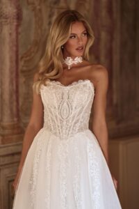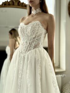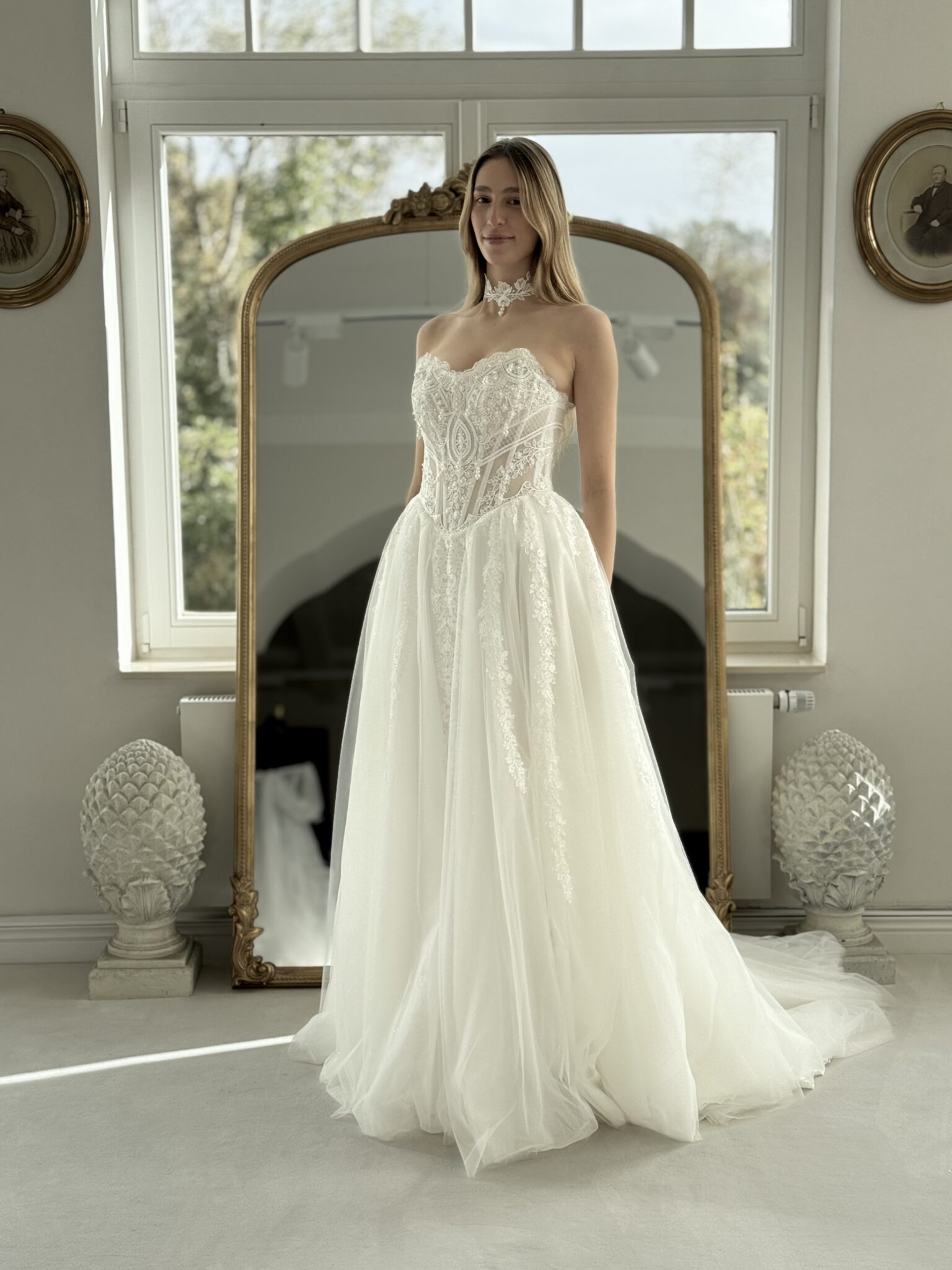 A-Linie von Anna Sposa - KARAVELLA mit einer zarten Spitzenkorsage, Perlen-Details und einer Choker Halskette. Das Kleid in Gr. 40 war ein wenig zu groß: Unser Model ist 1,78 m, trägt Gr. 36/38 und hat Körbchengröße: 75E mit den Maßen: B: 89cm, T:66cm, H:97cm.