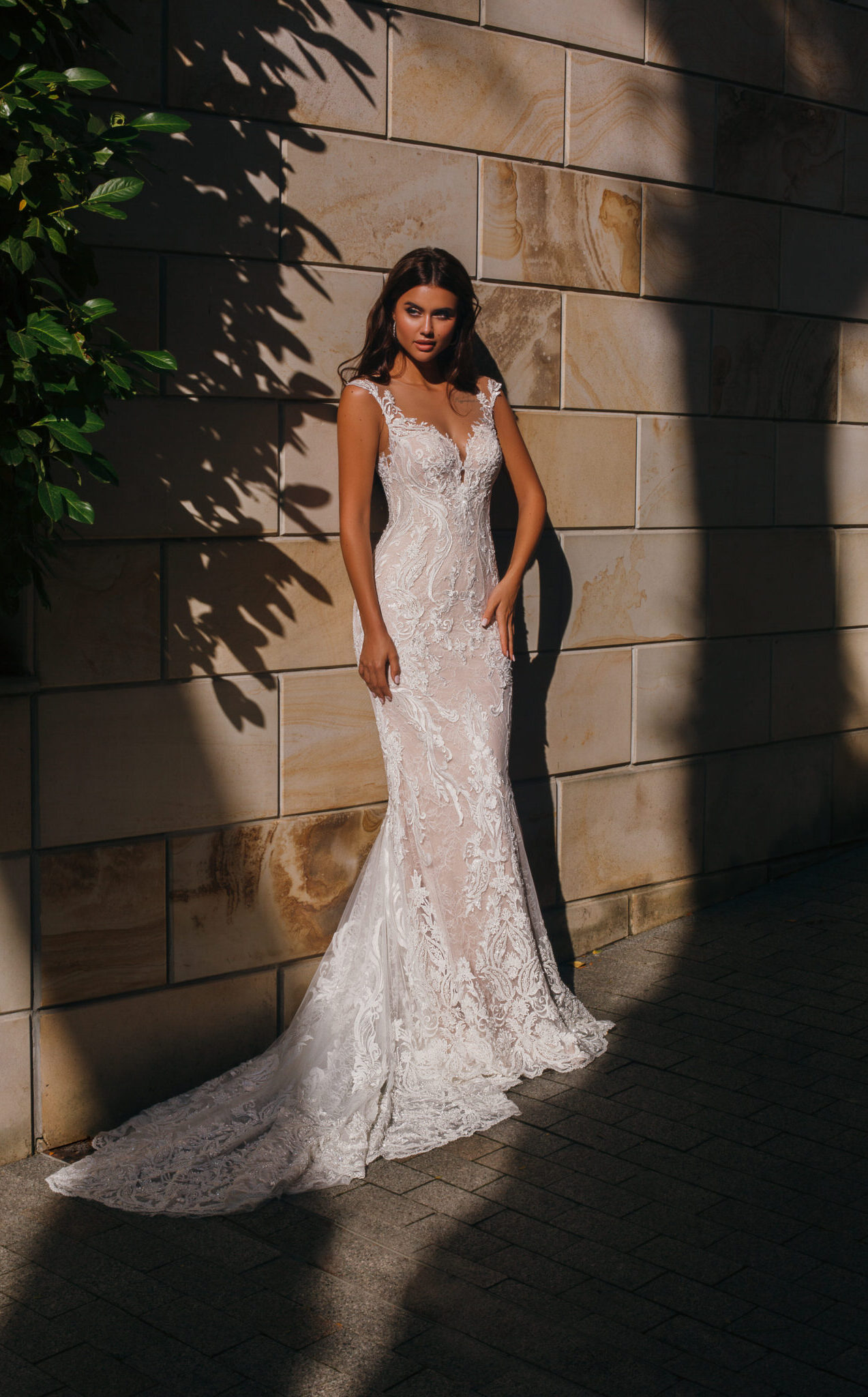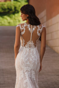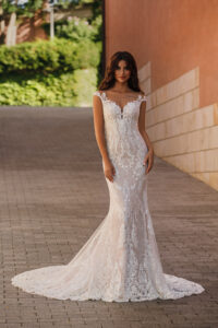 Figurbetontes Brautkleid im Meerjungfrauenstil aus feiner Spitze, das die Silhouette elegant betont. Das transparente Oberteil mit V-Ausschnitt und zarten Trägern wird durch filigrane Stickereien ergänzt. Eine leichte Schleppe und der transparente Rücken mit Knopfleiste setzen besondere Akzente.