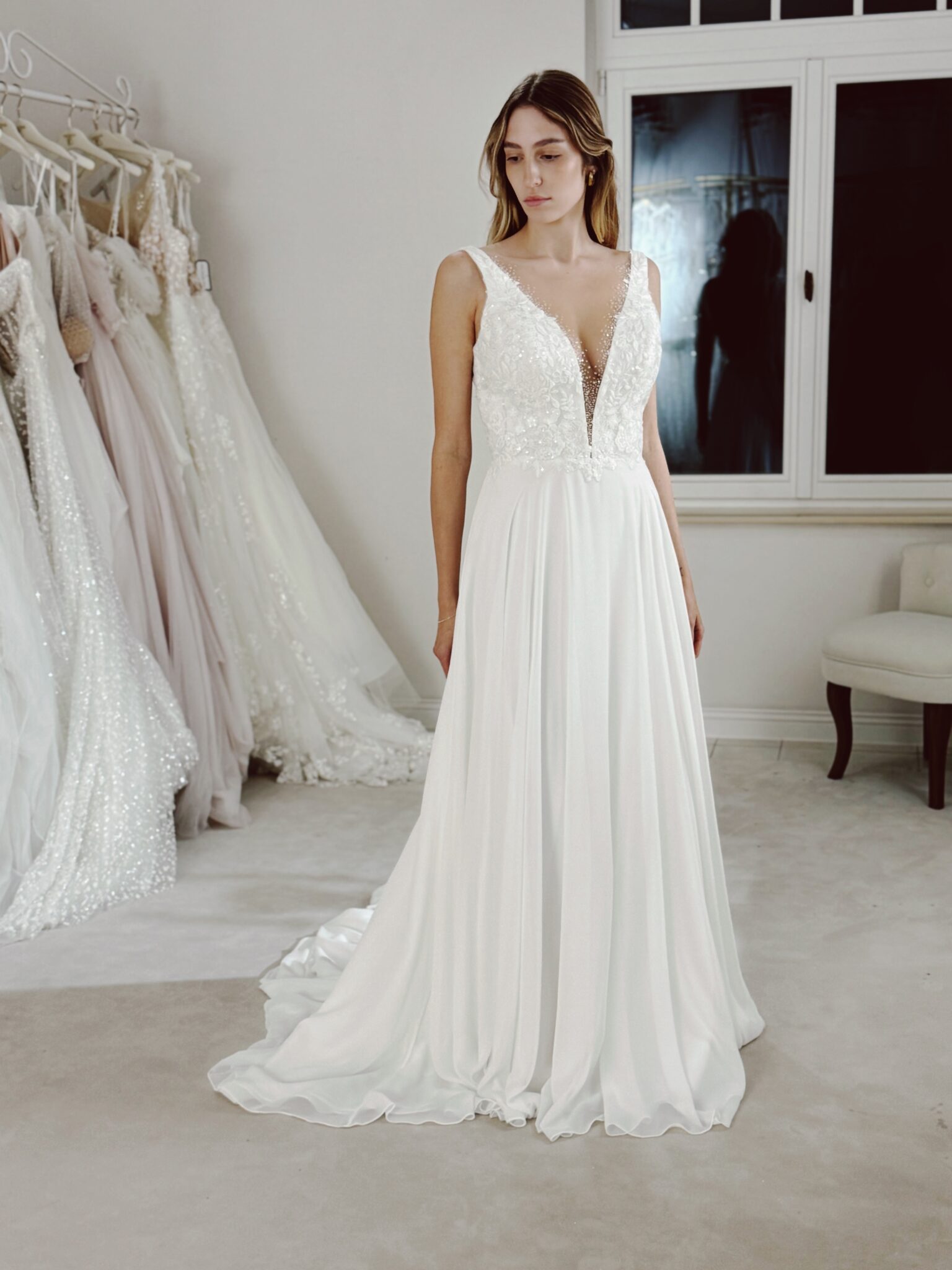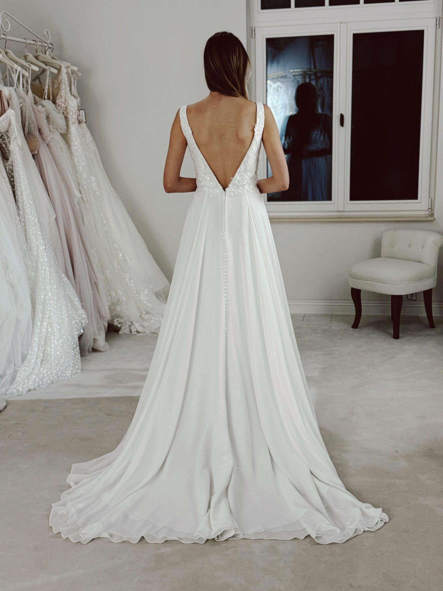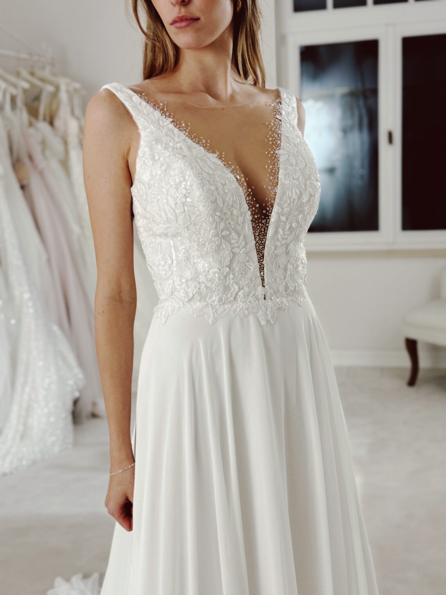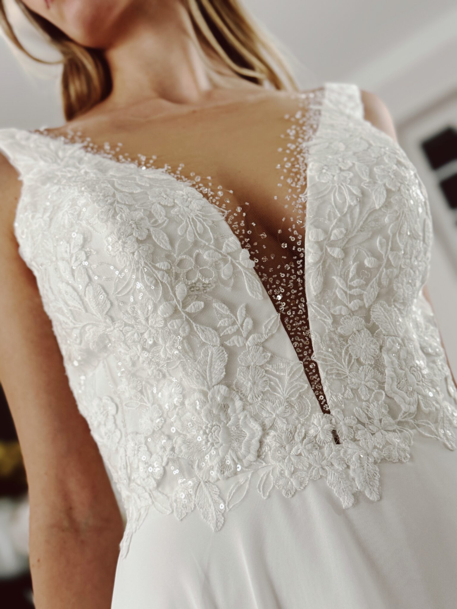 Chiffon A-Linie mit Cut Out im Dekolleté, welcher mit Pailletten und Perlen bestickt ist und floralen Spitzenapplikationen in der Corsage. Das Kleid in Gr. 40 war zu groß: Unser Model ist 1,78 m, trägt Gr. 36/38 und hat Körbchengröße: 75E mit den Maßen: B: 89cm, T: 66cm, H:97cm.