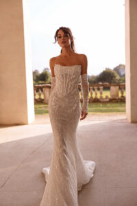 Fit and flare Kleid mit allover Pailetten-Perlen-Applikationen und einem Lingerie-Effekt in der Korsage. Das Kleid in Gr. 38 passte: Unser Model ist 1,78 m, trägt Gr. 36/38 und hat Körbchengröße: 75E mit den Maßen: B: 89cm, T: 66cm, H:97cm.