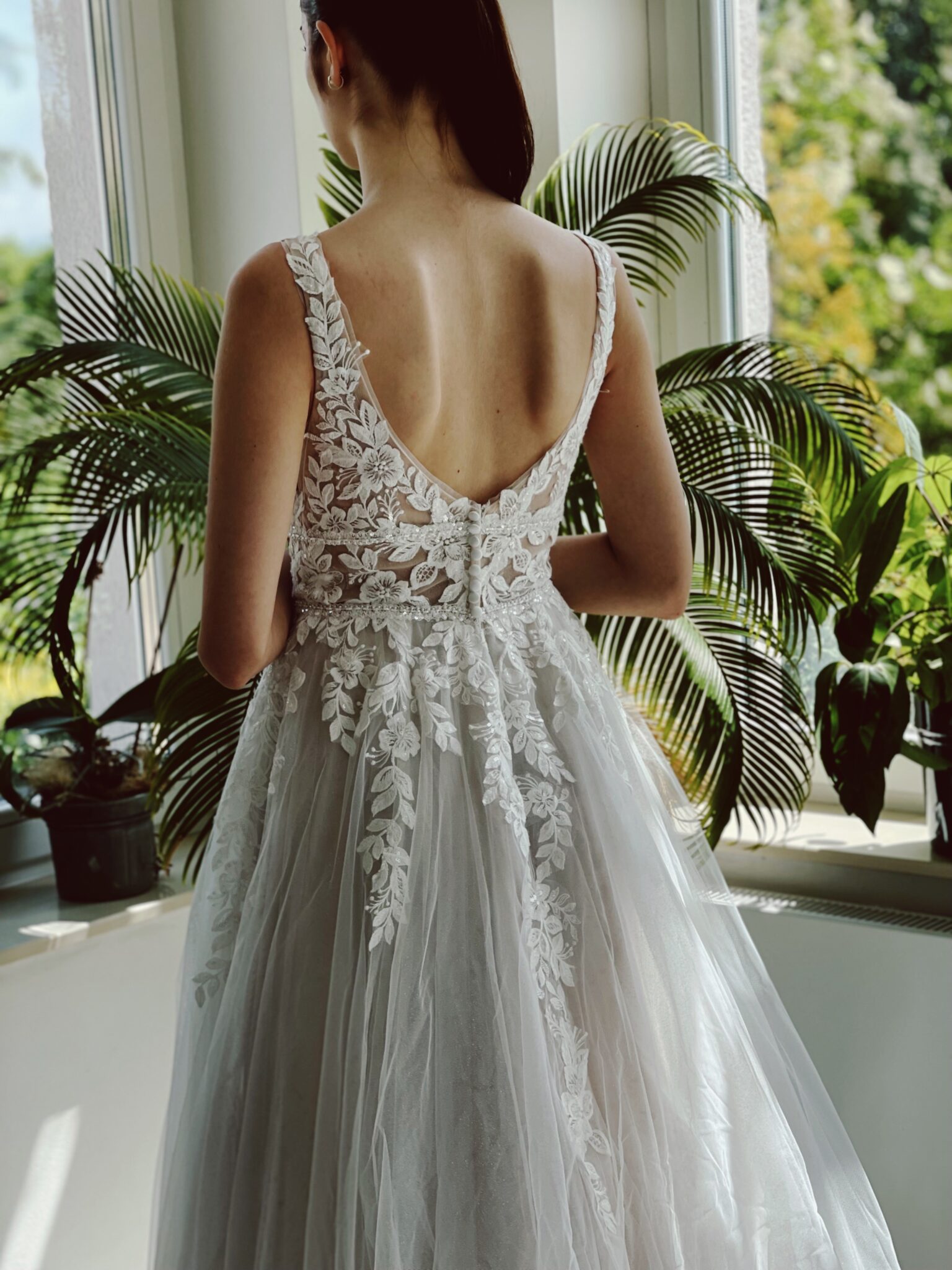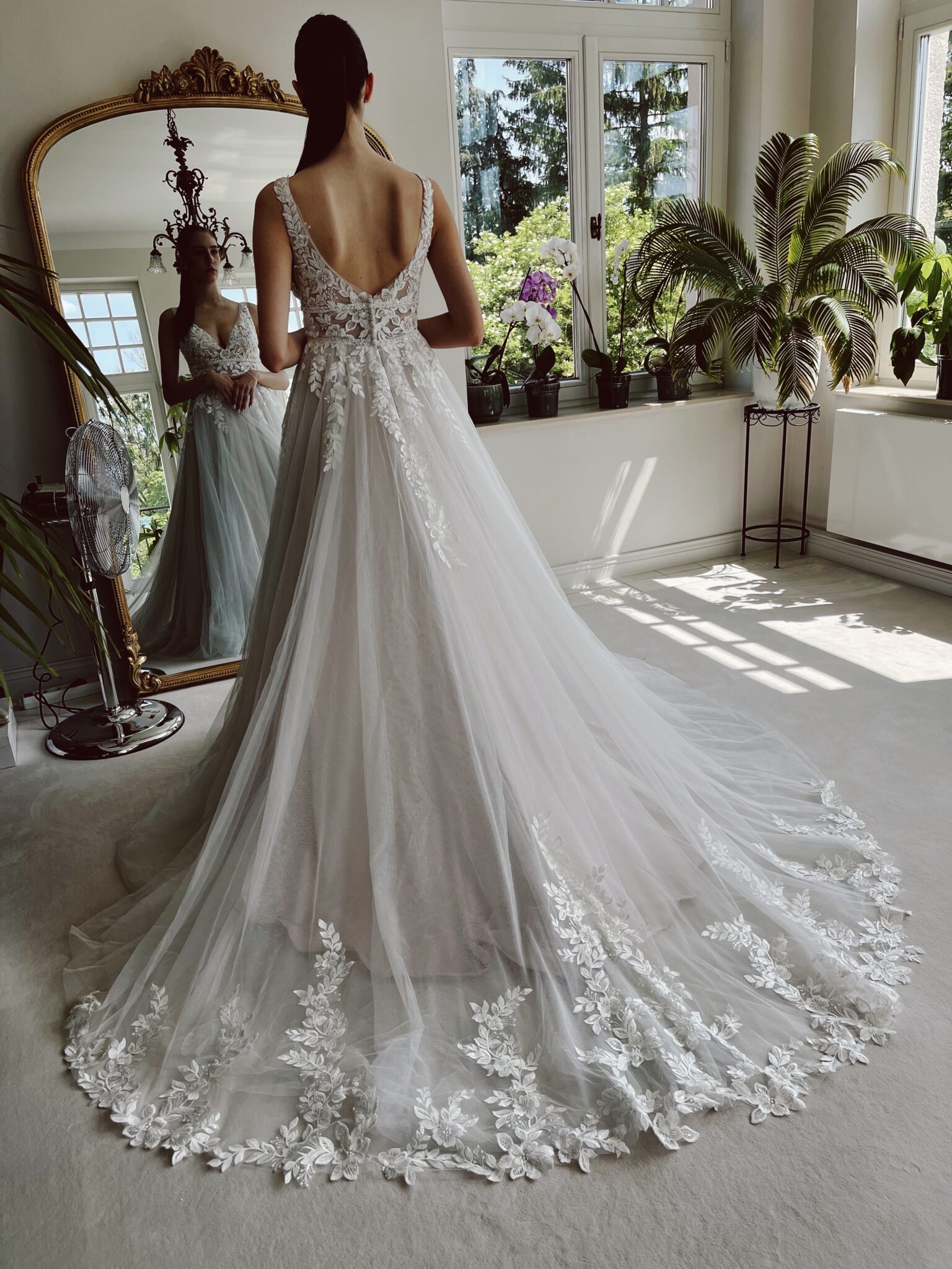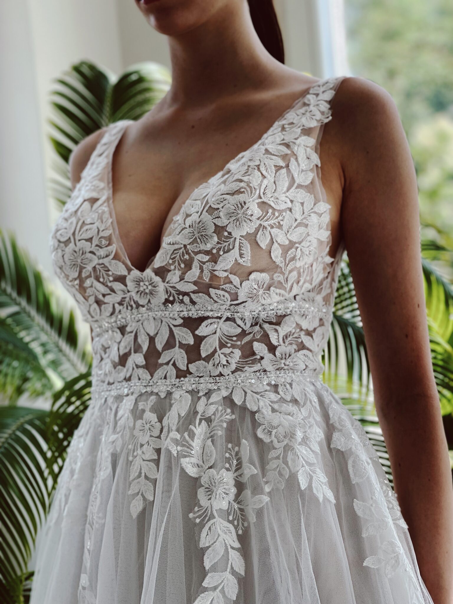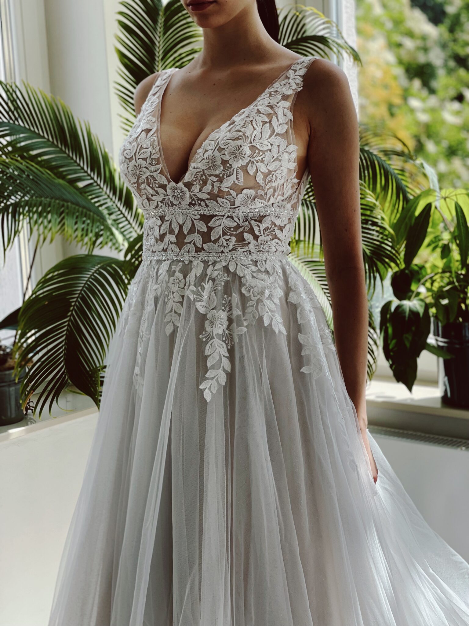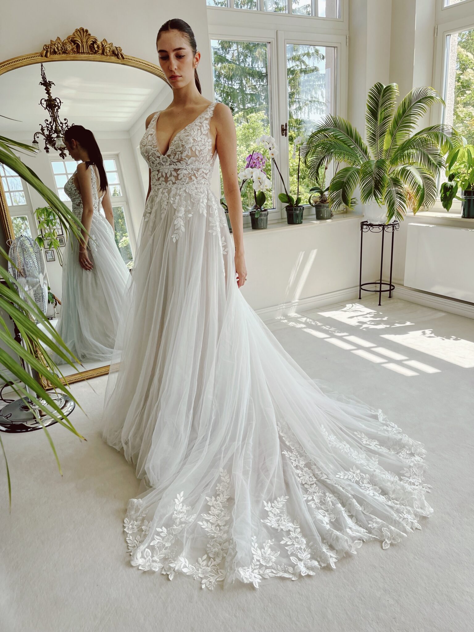 A-Linie mit Boho-Elementen, floralen Glitzer-Spitzenapplikationen & schlichtem Tüllrock. Farbe: ivory/sand. Das Kleid ist zu groß und wurde leicht abgesteckt: Unser Model ist 1,78 m, trägt Gr. 36/38 und hat Körbchengröße: 75E mit den Maßen: B: 89cm, T: 66cm, H:97cm.