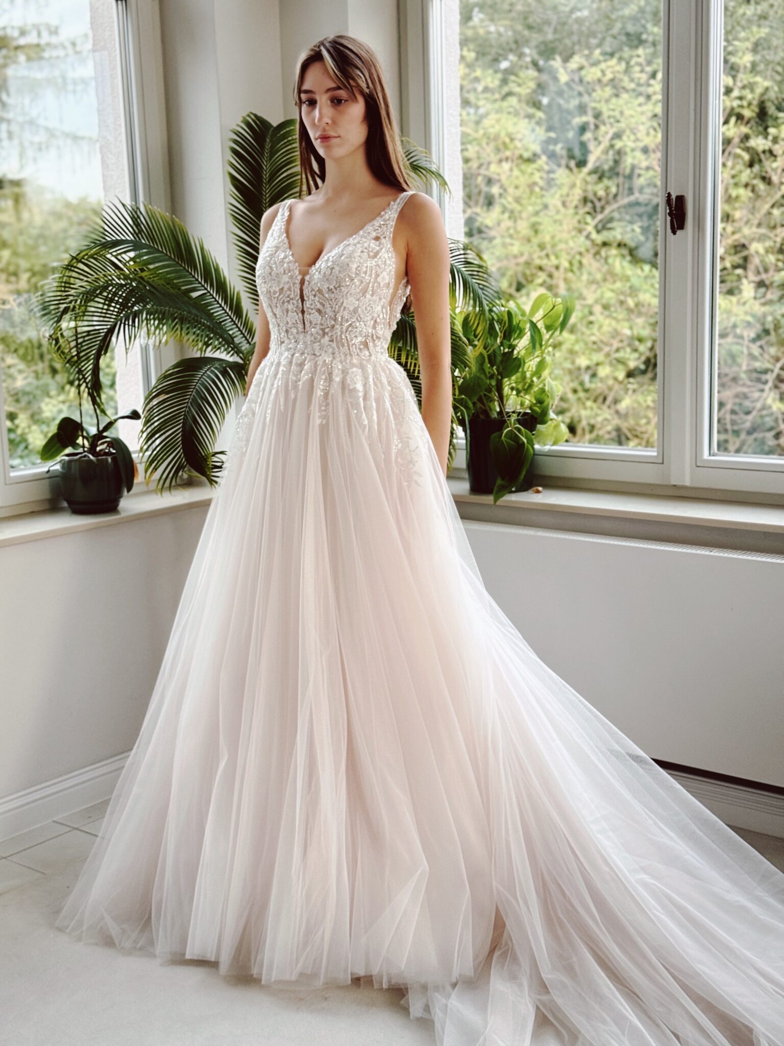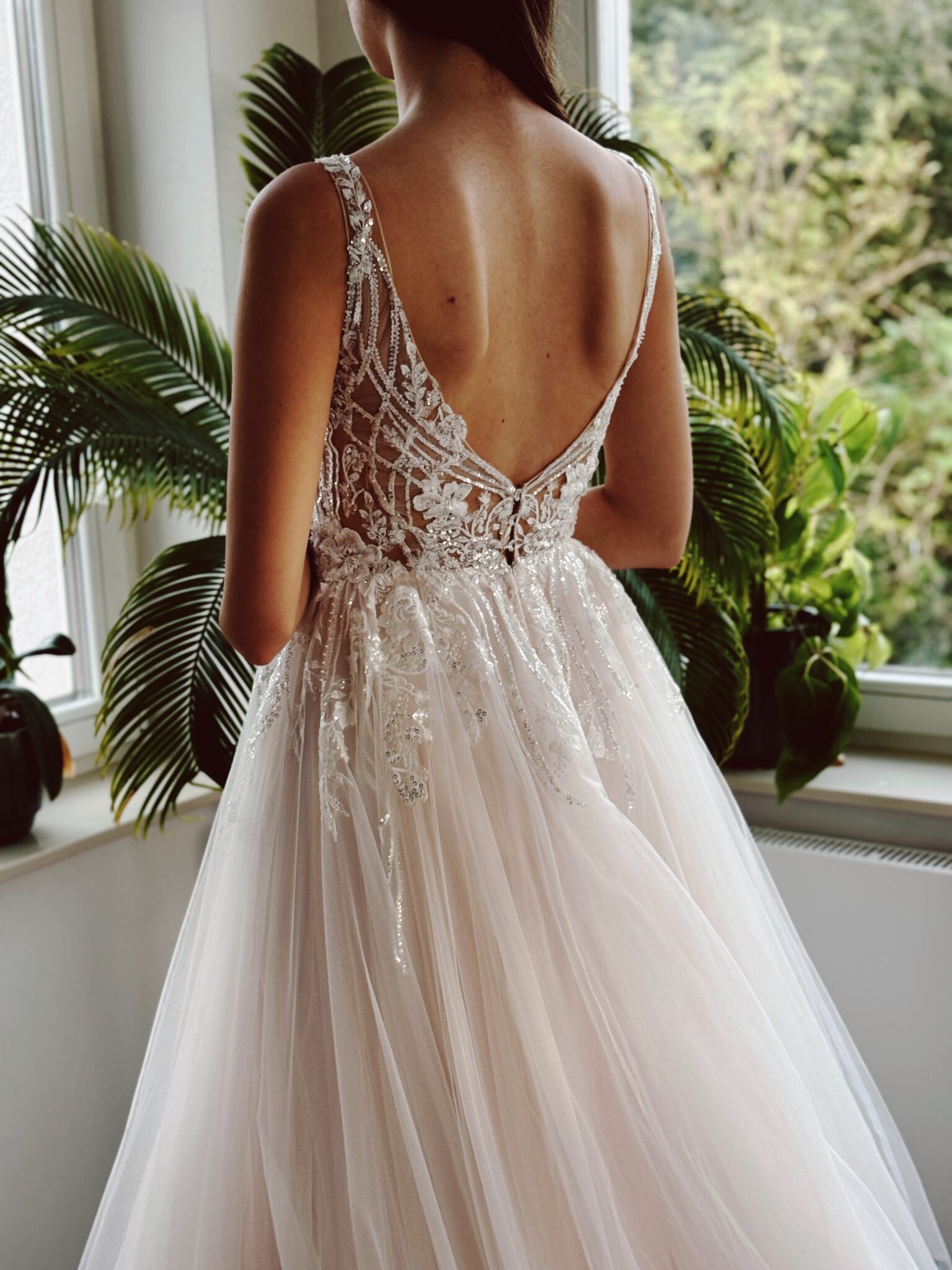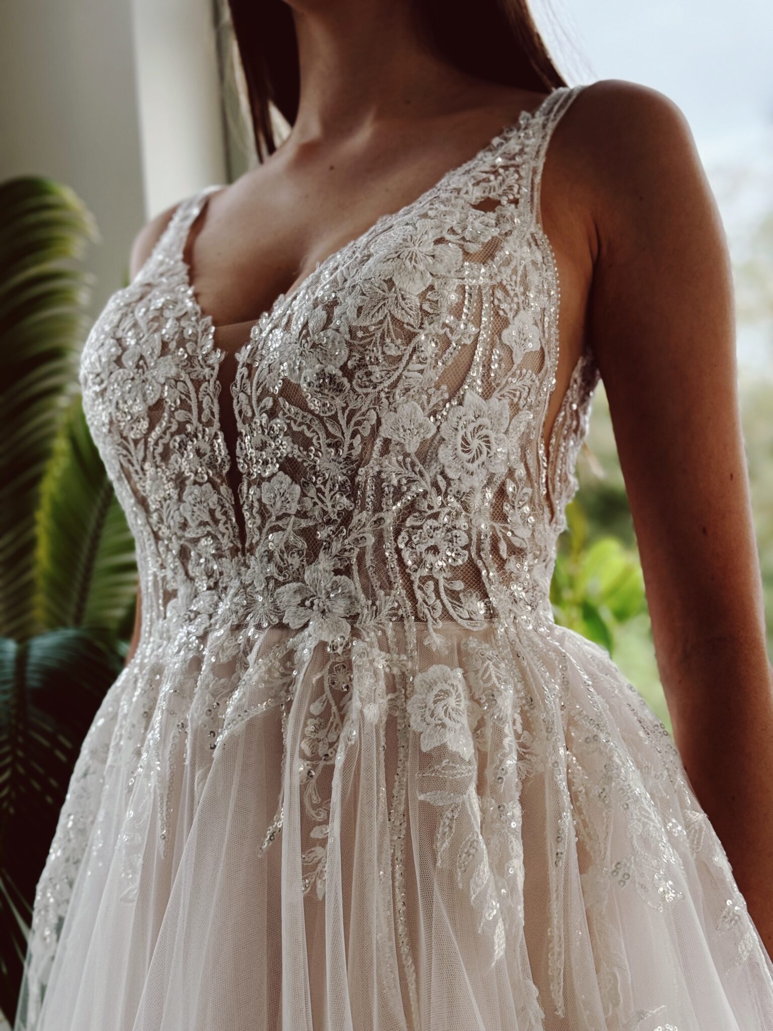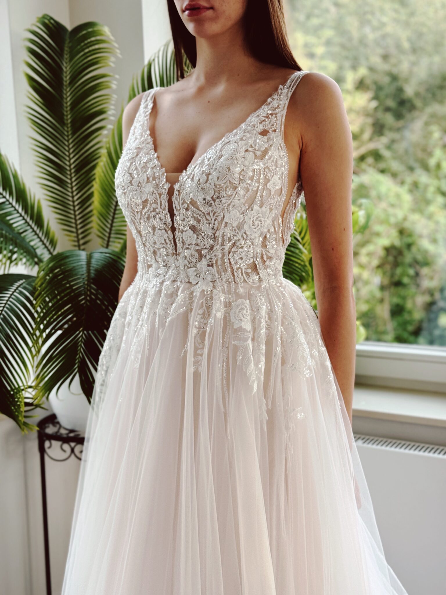 A-Linie mit Glitzer-Spitzenapplikationen, kleinem Cut Out im Dekolleté und an den Seiten & Tattoo-Effekt im Rücken. Farbe: ivory/champ. Unser Model ist 1,78 m, trägt Gr. 36/38 und hat Körbchengröße: 75E mit den Maßen: B: 89cm, T: 66cm, H:97cm.
