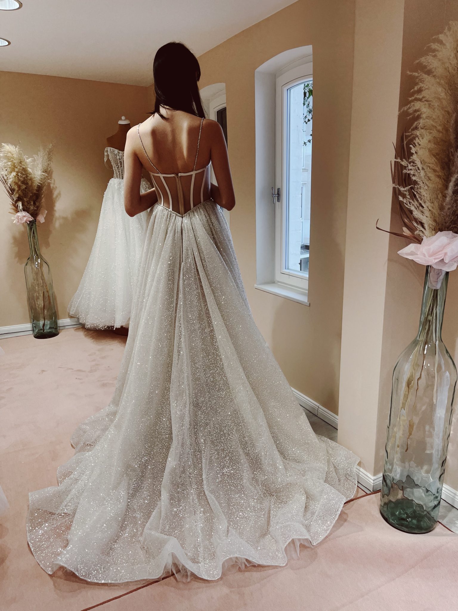 Atemberaubendes Glitzer-Kleid in Lingerie-Optik mit Beinschlitz und Body. Gewagt aber auf jeden Fall unvergesslich. Unser Model ist 1,78 m, trägt Gr. 36/38 und hat Körbchengröße: 75E mit den Maßen: B: 89cm, T: 66cm, H:97cm.