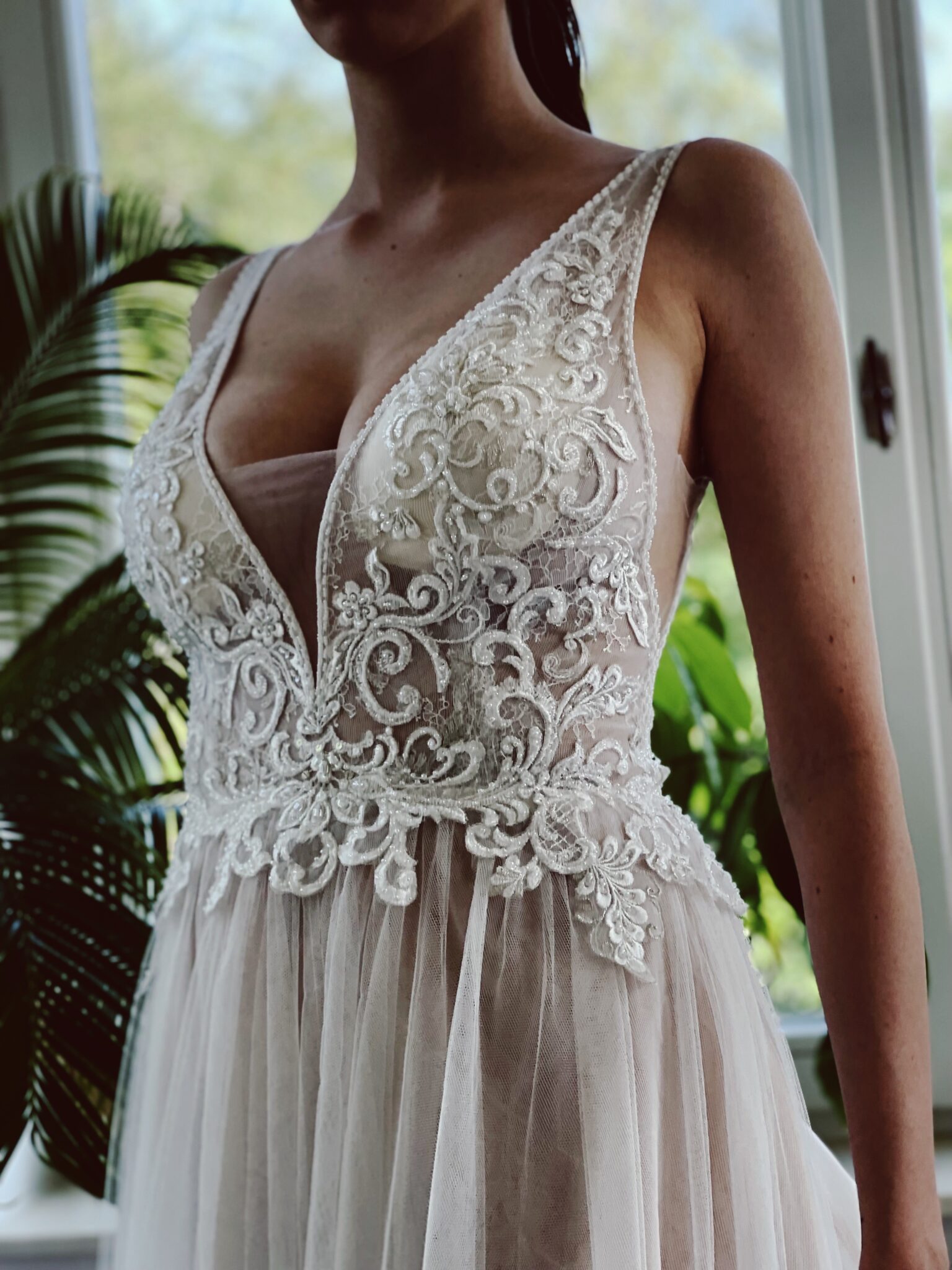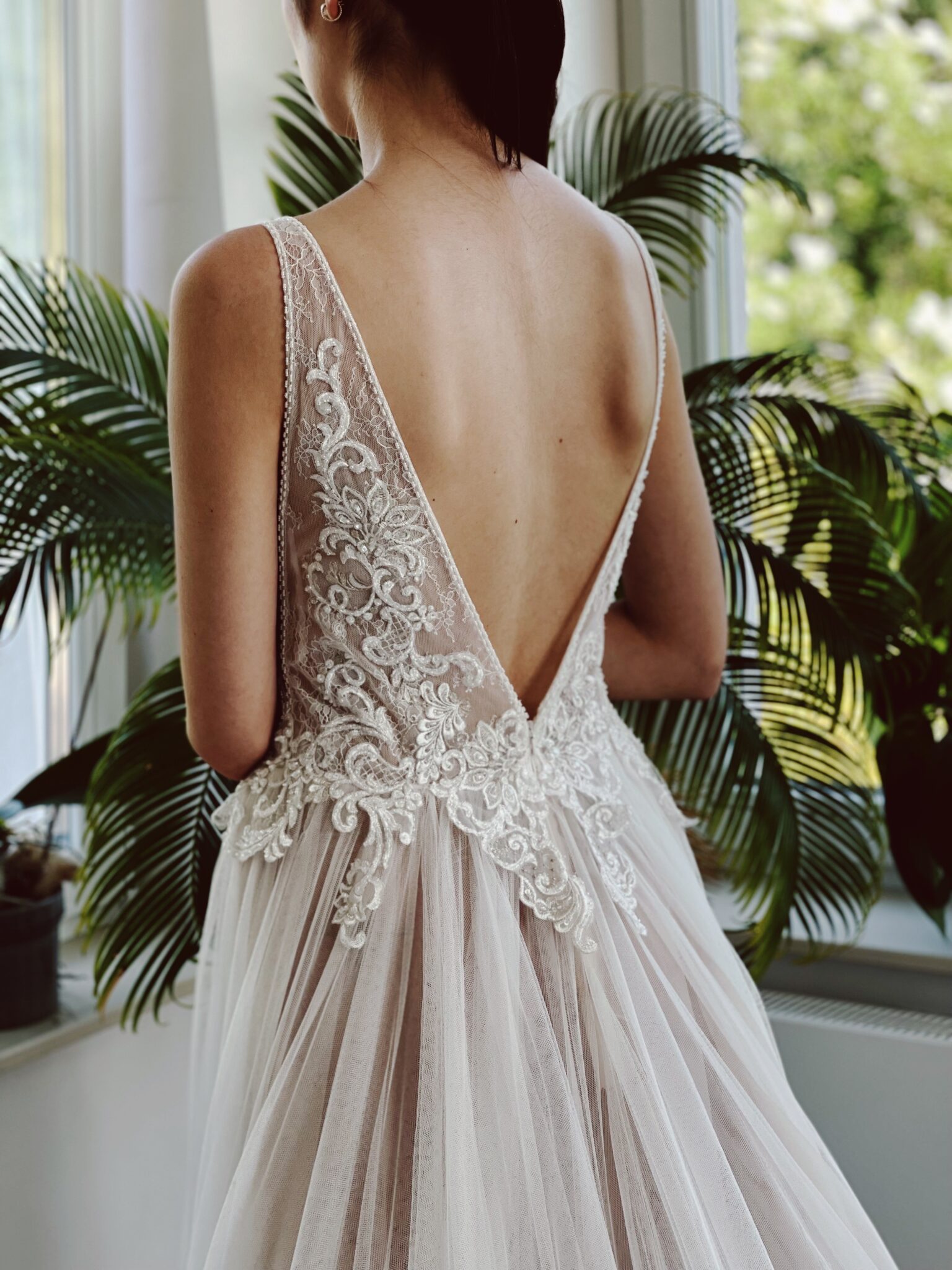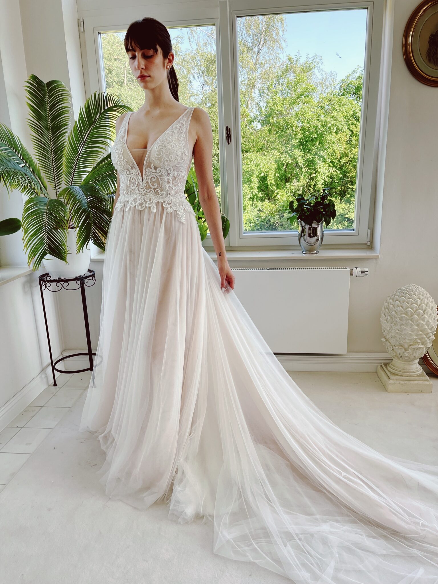 Leicht fallende Softtüll A-Linie mit Glitzer-Spitzenapplikationen in der Korsage & tiefem Rücken. Farbe: ivory/nude. Das Kleid ist zu groß und wurde entsprechend abgesteckt: Unser Model ist 1,78 m, trägt Gr. 36/38 und hat Körbchengröße: 75E mit den Maßen: B: 89cm, T: 66cm, H:97cm.