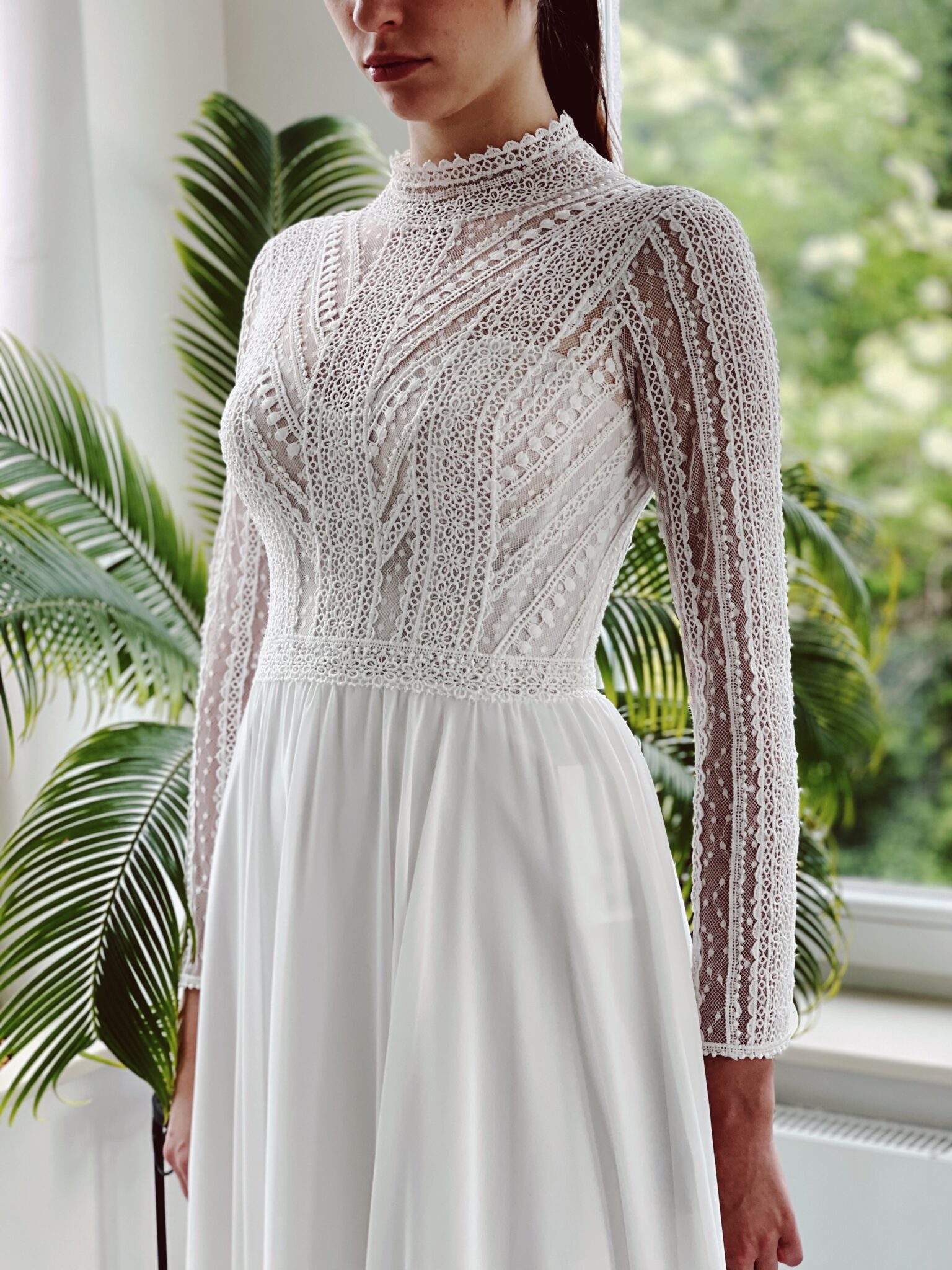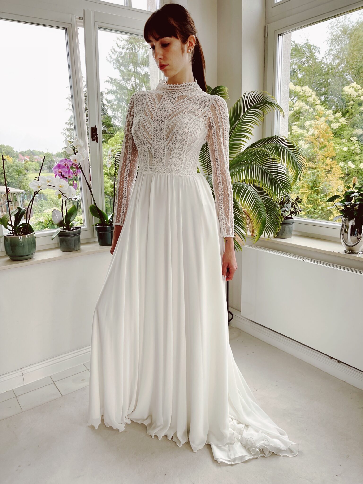 Leicht fallende Chiffon-A-Linie mit einer hochgeschlossenen Korsage aus Boho-Spitze, einer innenliegenden Schnürung für eine perfekte Passform und Knopfleiste im Rücken. Unser Model ist 1,78 m, trägt Gr. 36/38 und hat Körbchengröße: 75E mit den Maßen: B: 89cm, T: 66cm, H:97cm. Das Kleid ist zu klein und ließ sich im Rücken nicht verschließen.