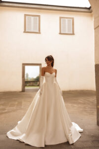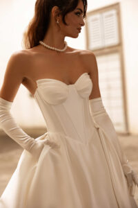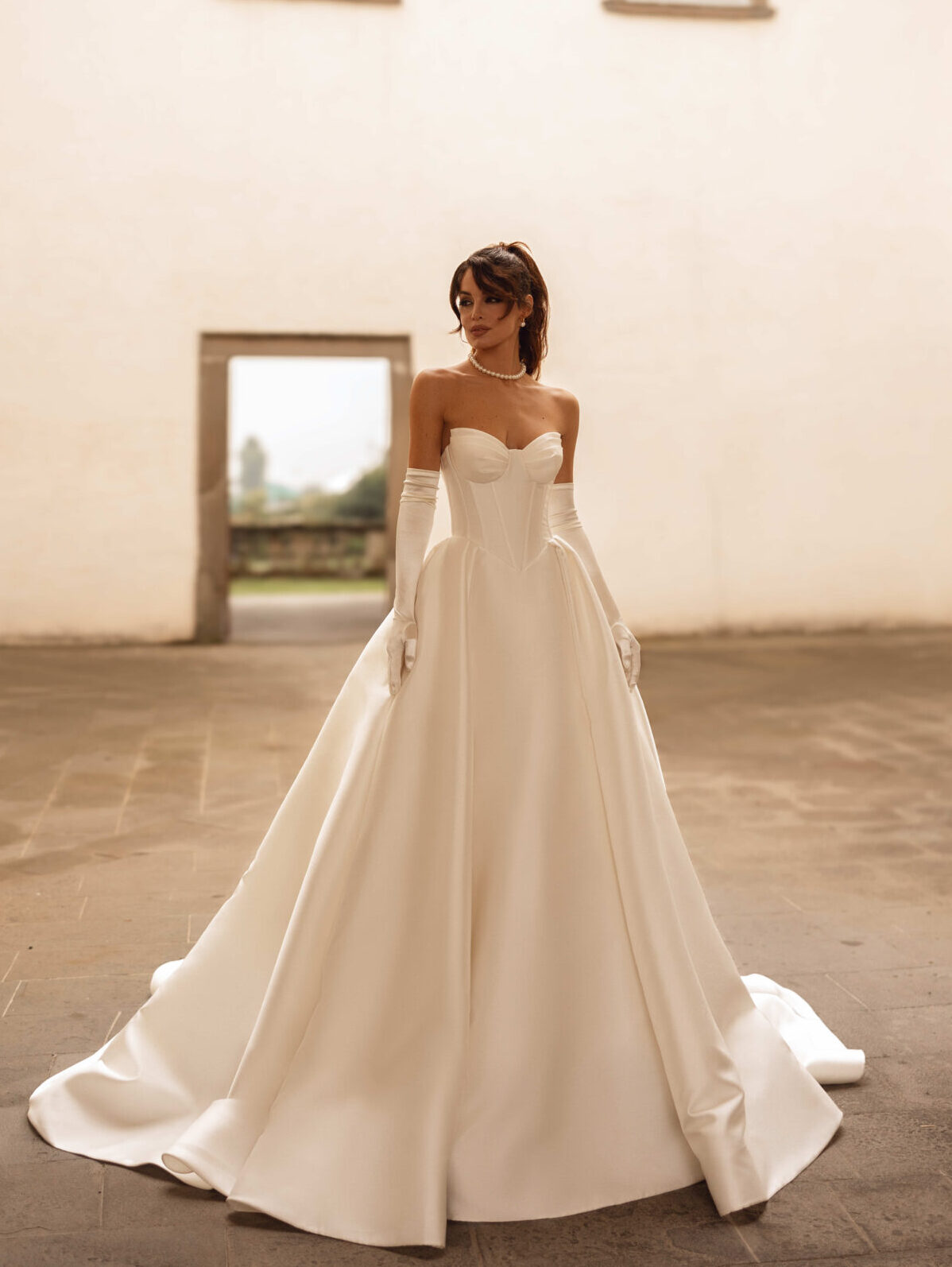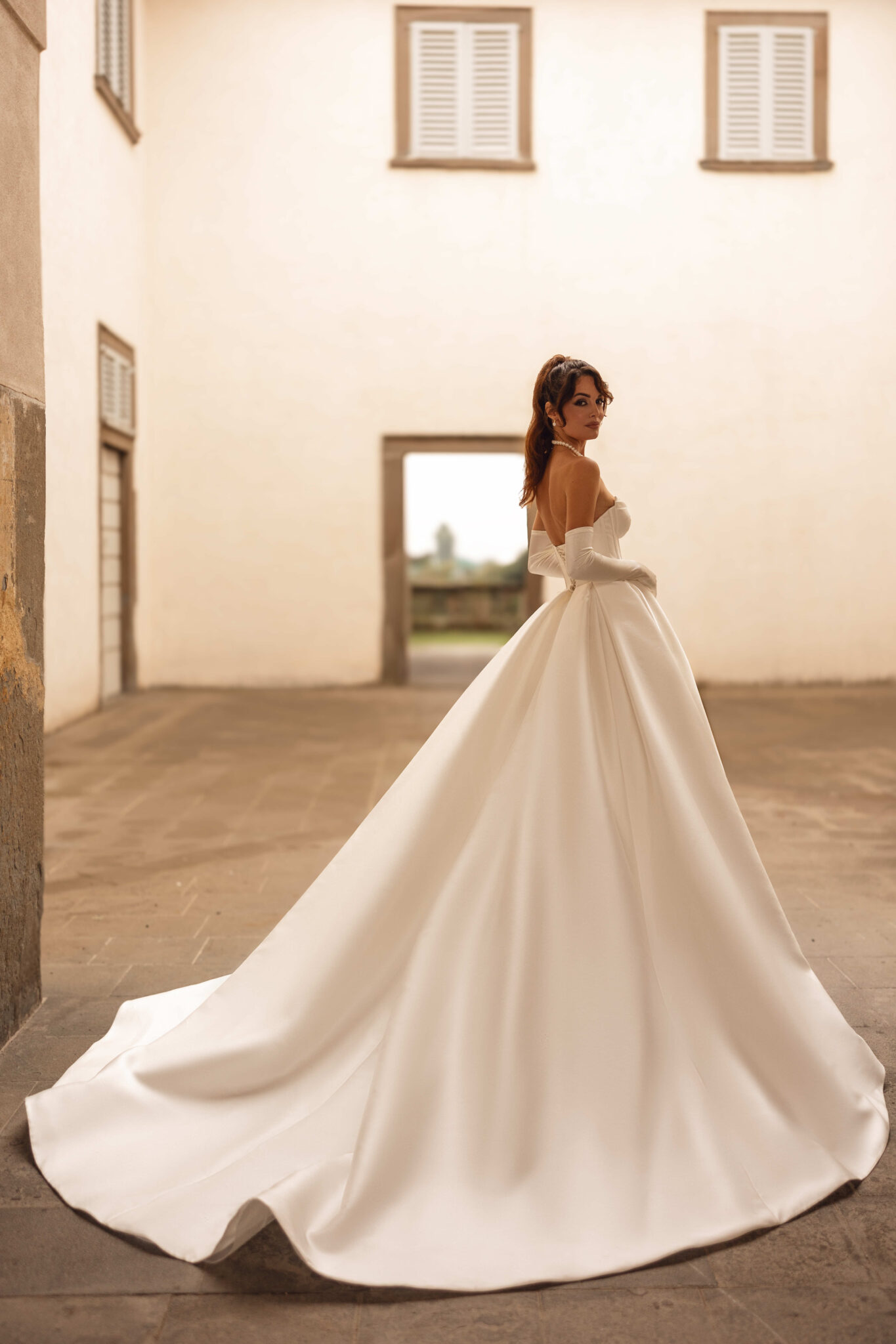 Cleane Prinzessin von Dominiss - VIVIENNE mit einem Herzausschnitt und einer baskischen Taille. Das Kleid in Gr. 36 passte gut: Unser Model ist 1,78 m, trägt Gr. 36/38 und hat Körbchengröße: 75E mit den Maßen: B: 89cm, T:66cm, H:97cm.