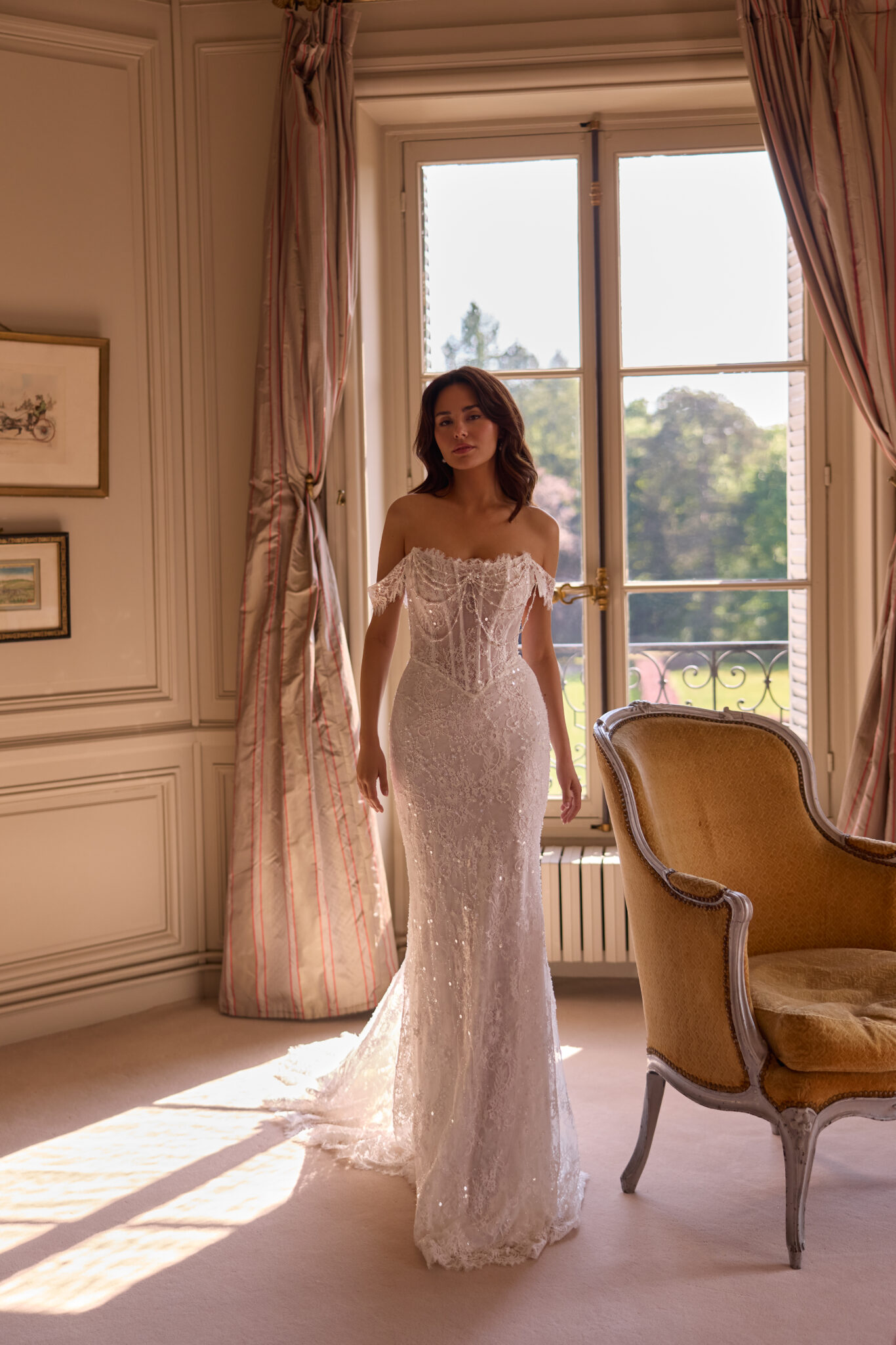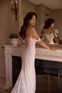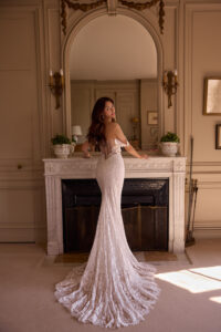 Fit and Flare von Elizabeth Passion - KLARA aus allover Chantilly-Spitze, mit fallenden Carmen-Trägern und Perlenverzierung im Ausschnitt. Das Kleid in Gr. 42 war zu groß: Unser Model ist 1,78 m, trägt Gr. 36/38 und hat Körbchengröße: 75E mit den Maßen: B: 89cm, T:66cm, H:97cm.