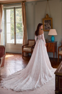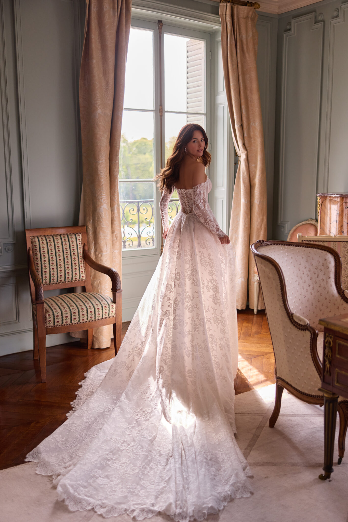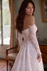 A-Linie von Elizabeth Passion - NOELLE mit allover Spitze, transparentem Korsett-Oberteil und sichtbaren Stäben. Das Kleid in Gr. 44 war zu groß: Unser Model ist 1,78 m, trägt Gr. 36/38 und hat Körbchengröße: 75E mit den Maßen: B: 89cm, T:66cm, H:97cm.