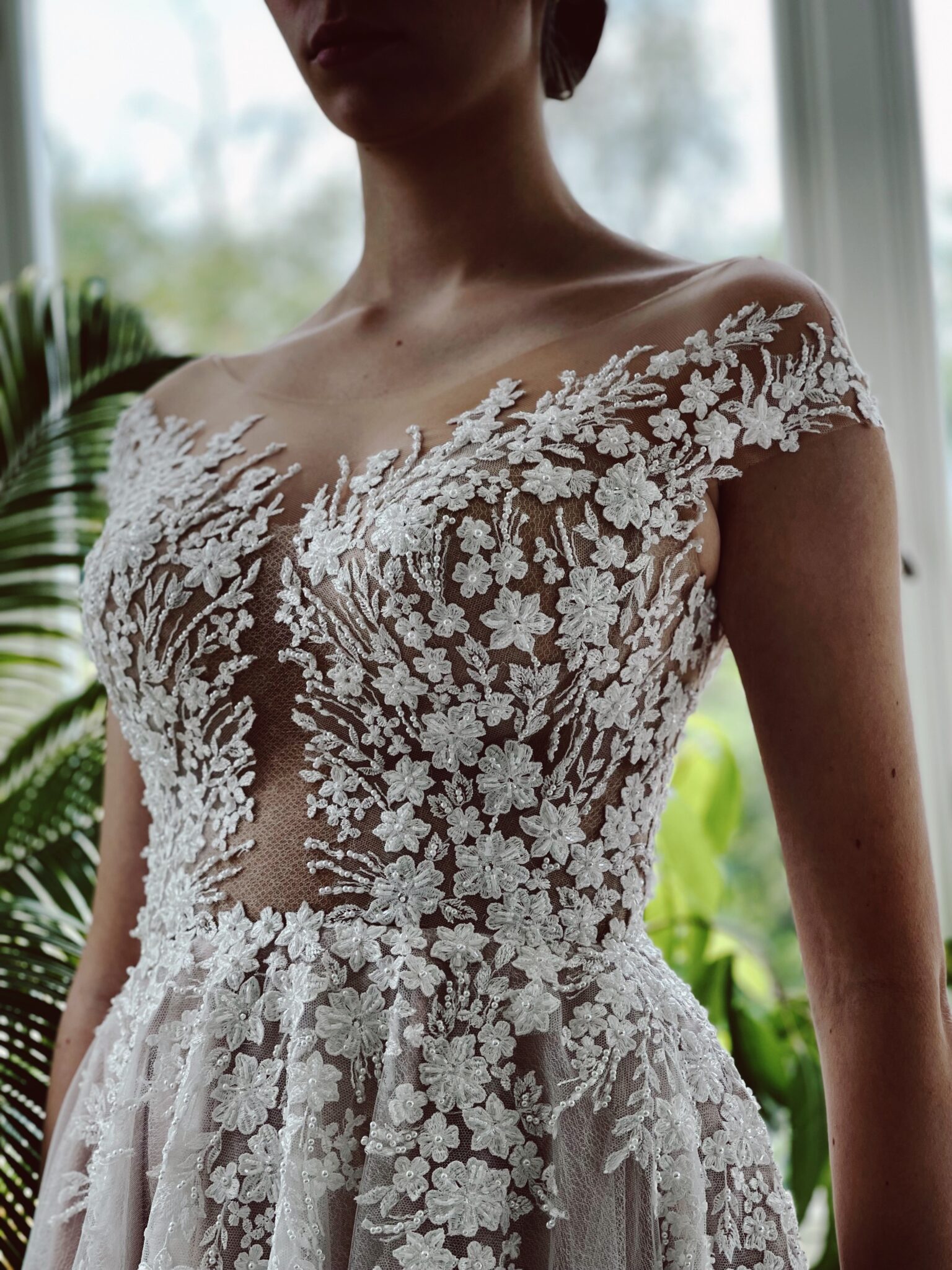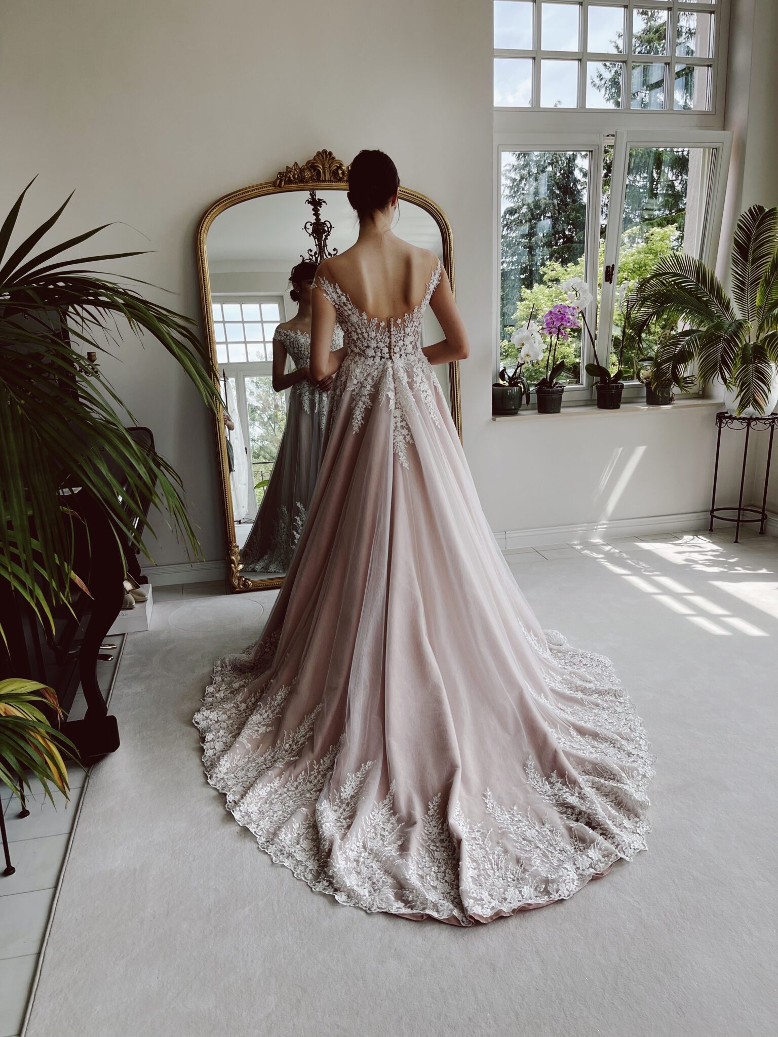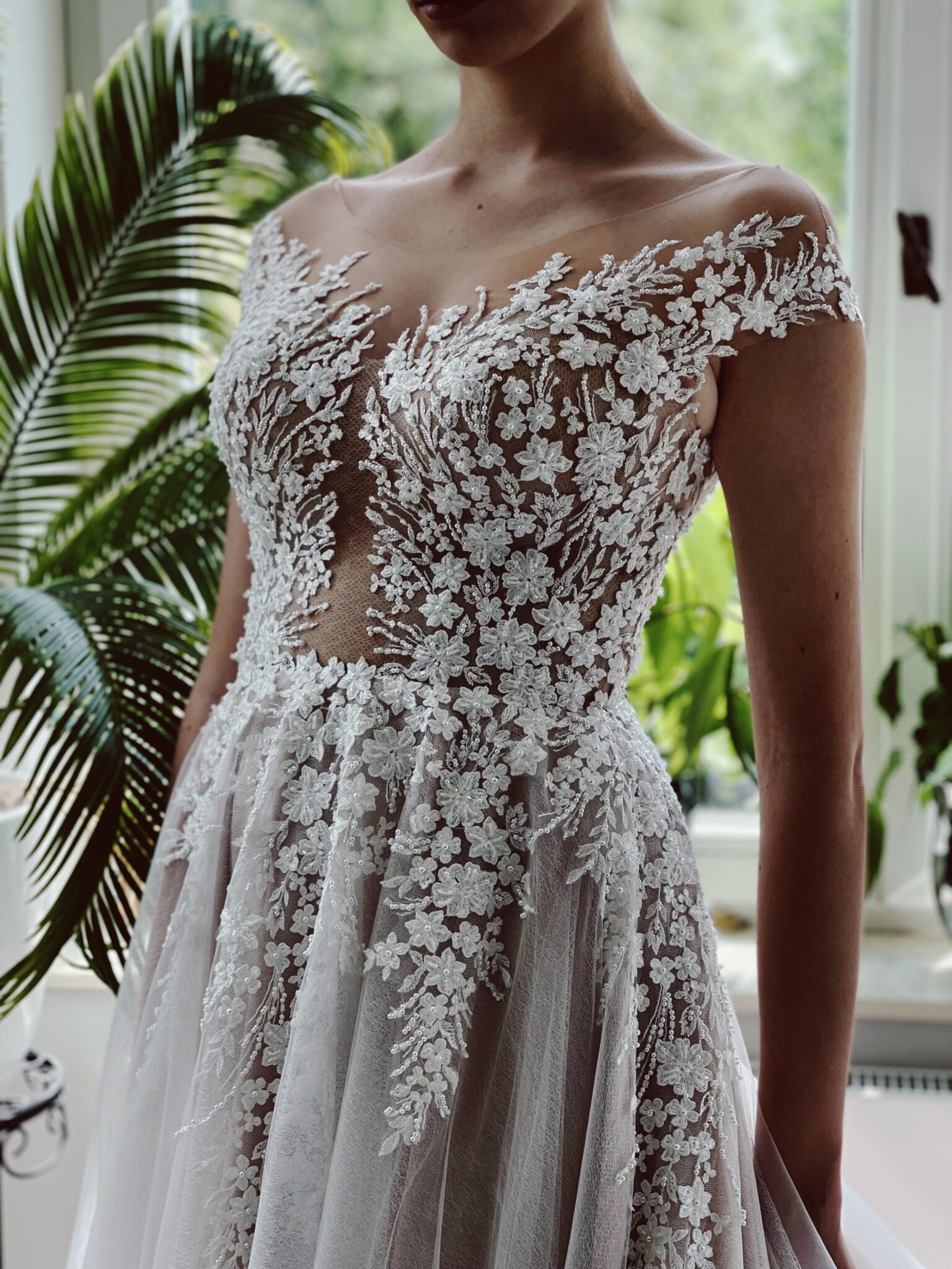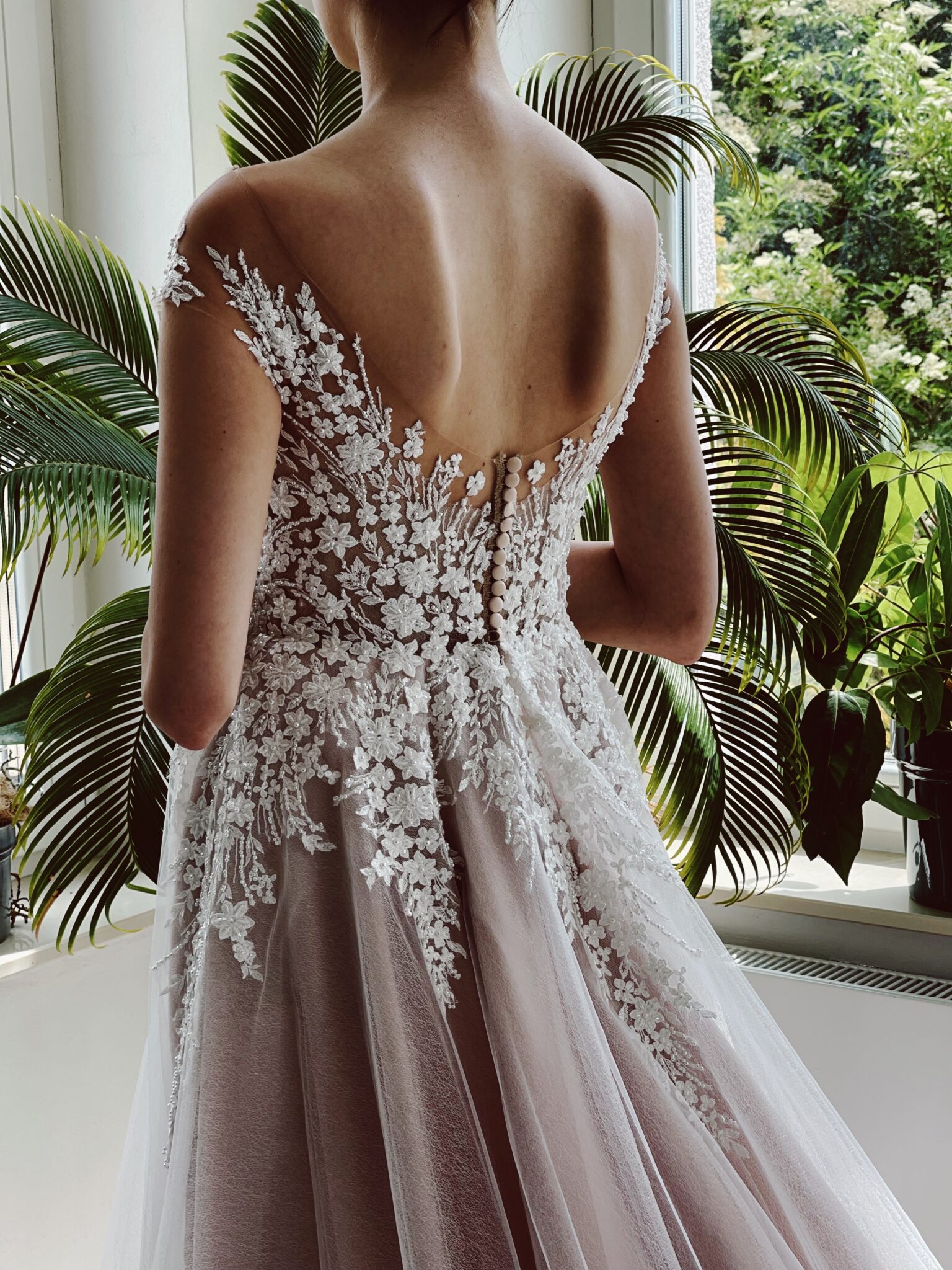 A-Linie mit floralen Glitzer-Spitzenapplikationen, Cut Out im Dekolleté, Tattoo-Effekt in der Korsage & sensationeller Schleppe. Must try! Das Kleid fällt klein aus und die Gr. 38 passt gut: Unser Model ist 1,78 m, trägt Gr. 36/38 und hat Körbchengröße: 75E mit den Maßen: B: 89cm, T: 66cm, H:97cm.