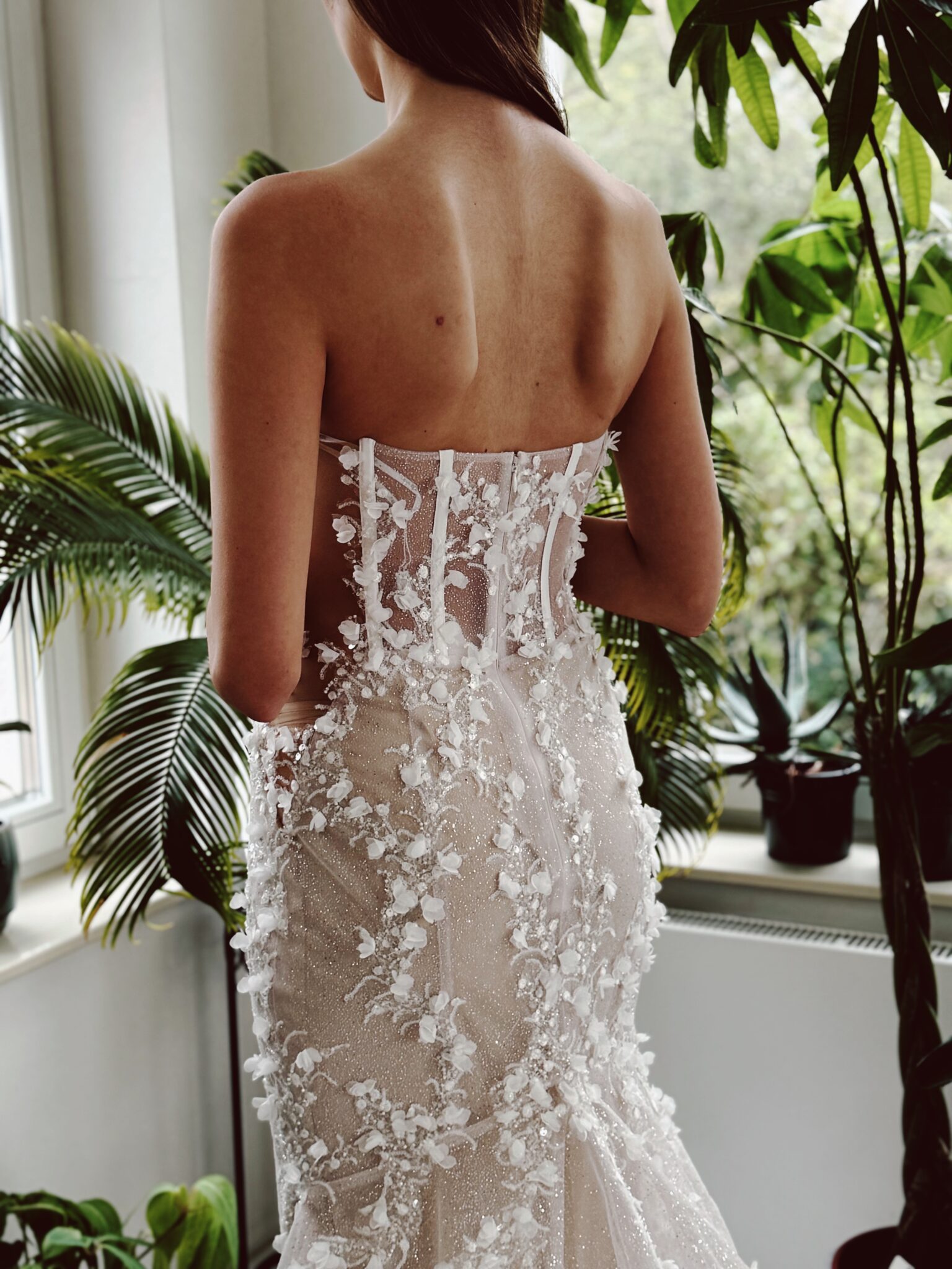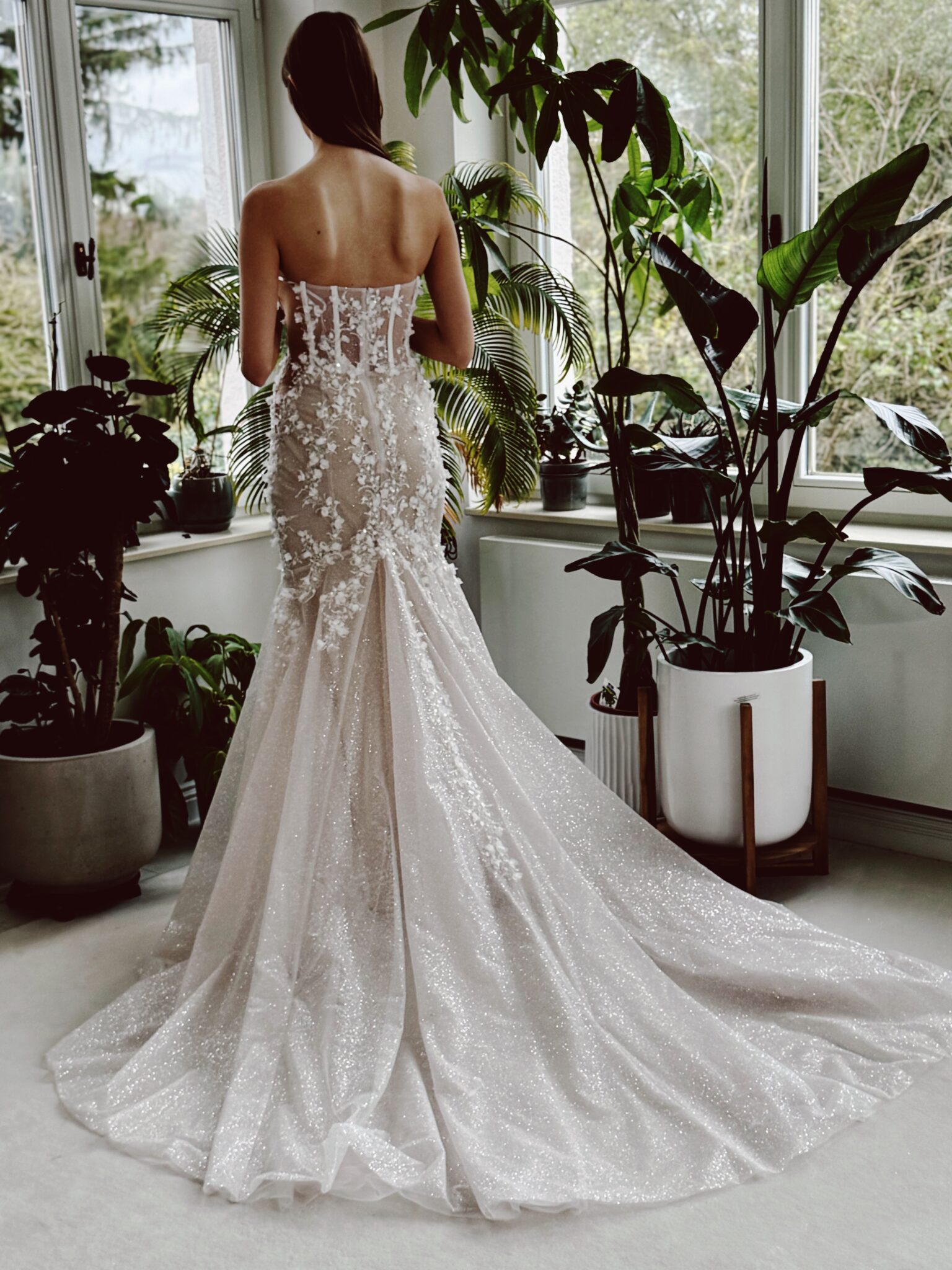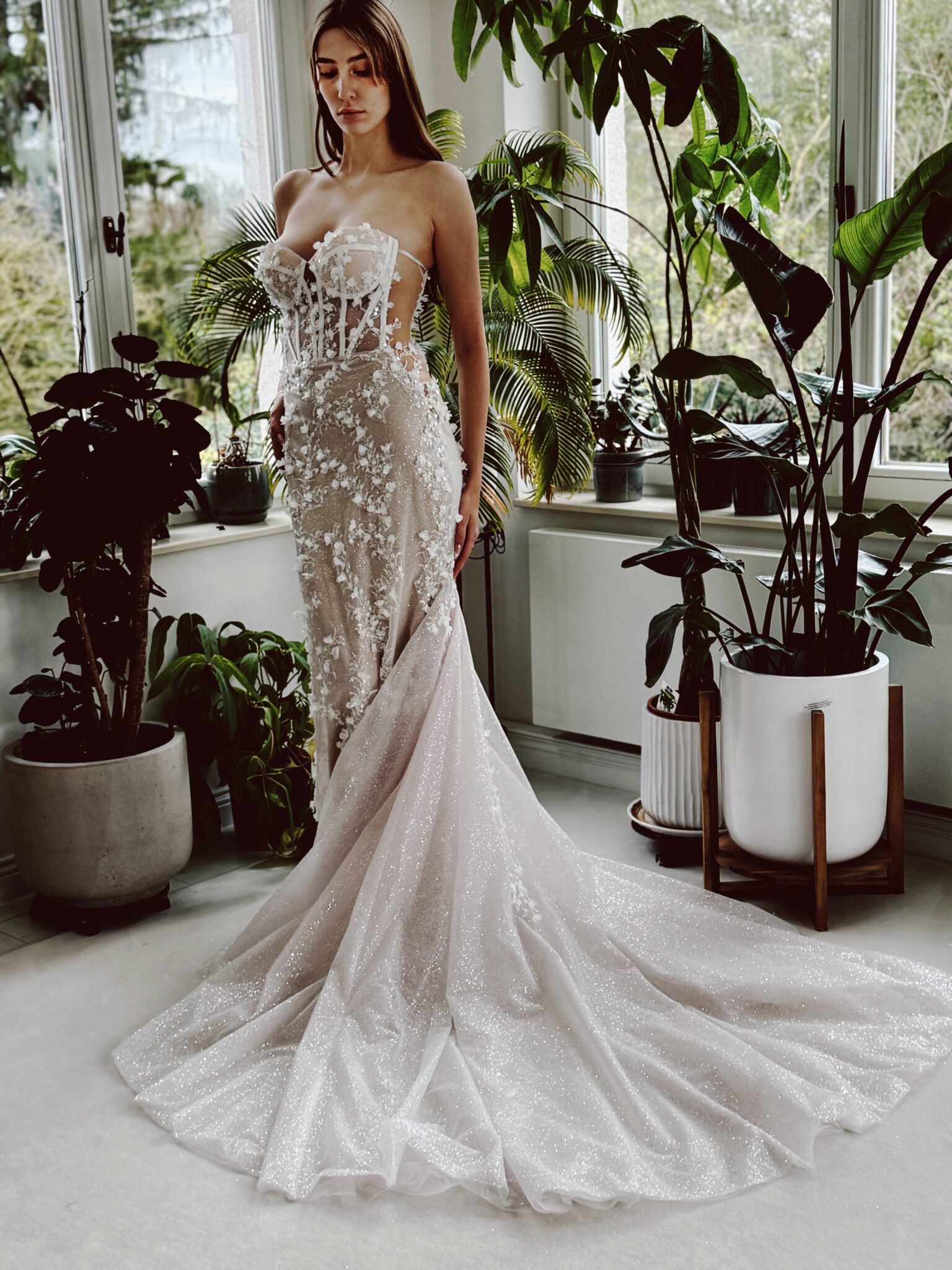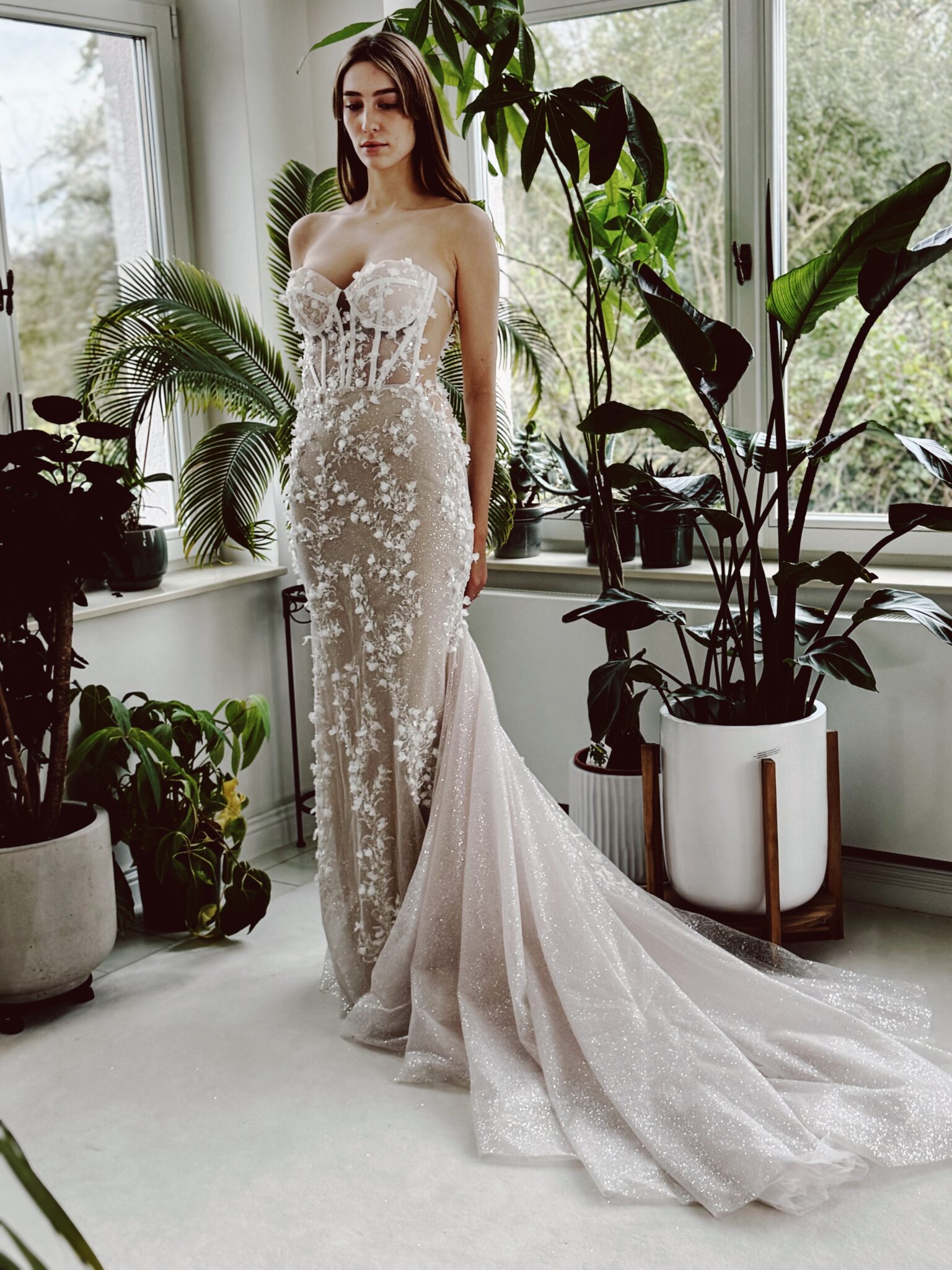 Fit & flare Brautkleid im Lingerie-Effekt, Glitzertüll in der 2. Lage und floralen 3D-Spitzen-Applikationen & abnehmbaren Ärmeln. Die Gr. 36 sitzt gut ist allerdings nicht für große Oberweite geeignet: Farbe: ivory/sand. Unser Model ist 1,78 m, trägt Gr. 36/38 und hat Körbchengröße: 75E mit den Maßen: B: 89cm, T: 66cm, H:97cm.