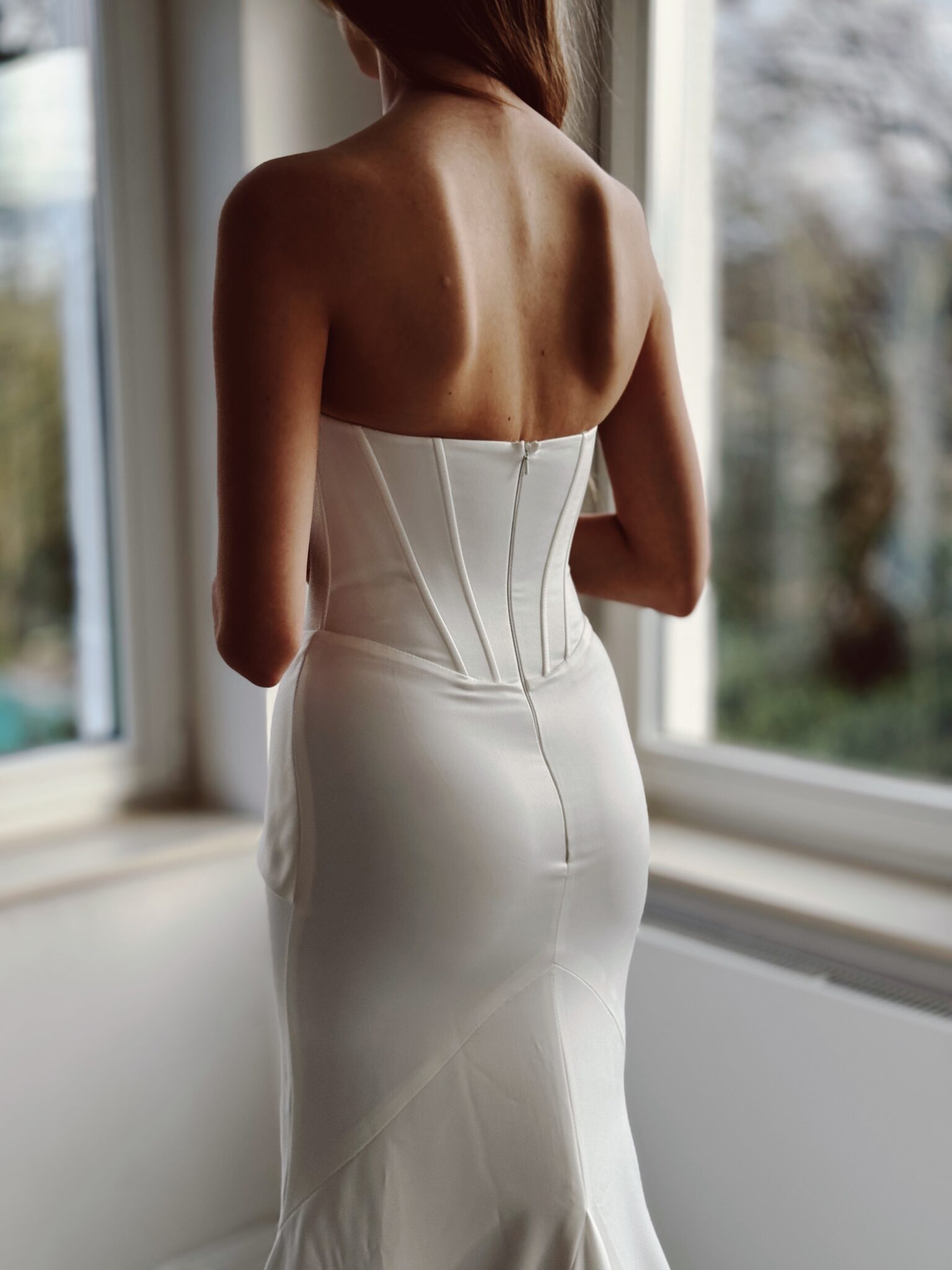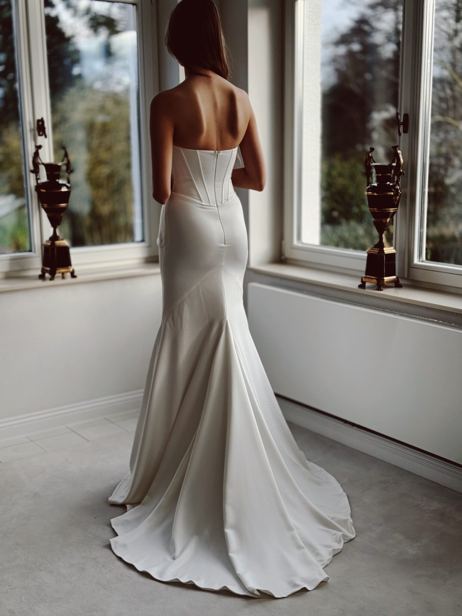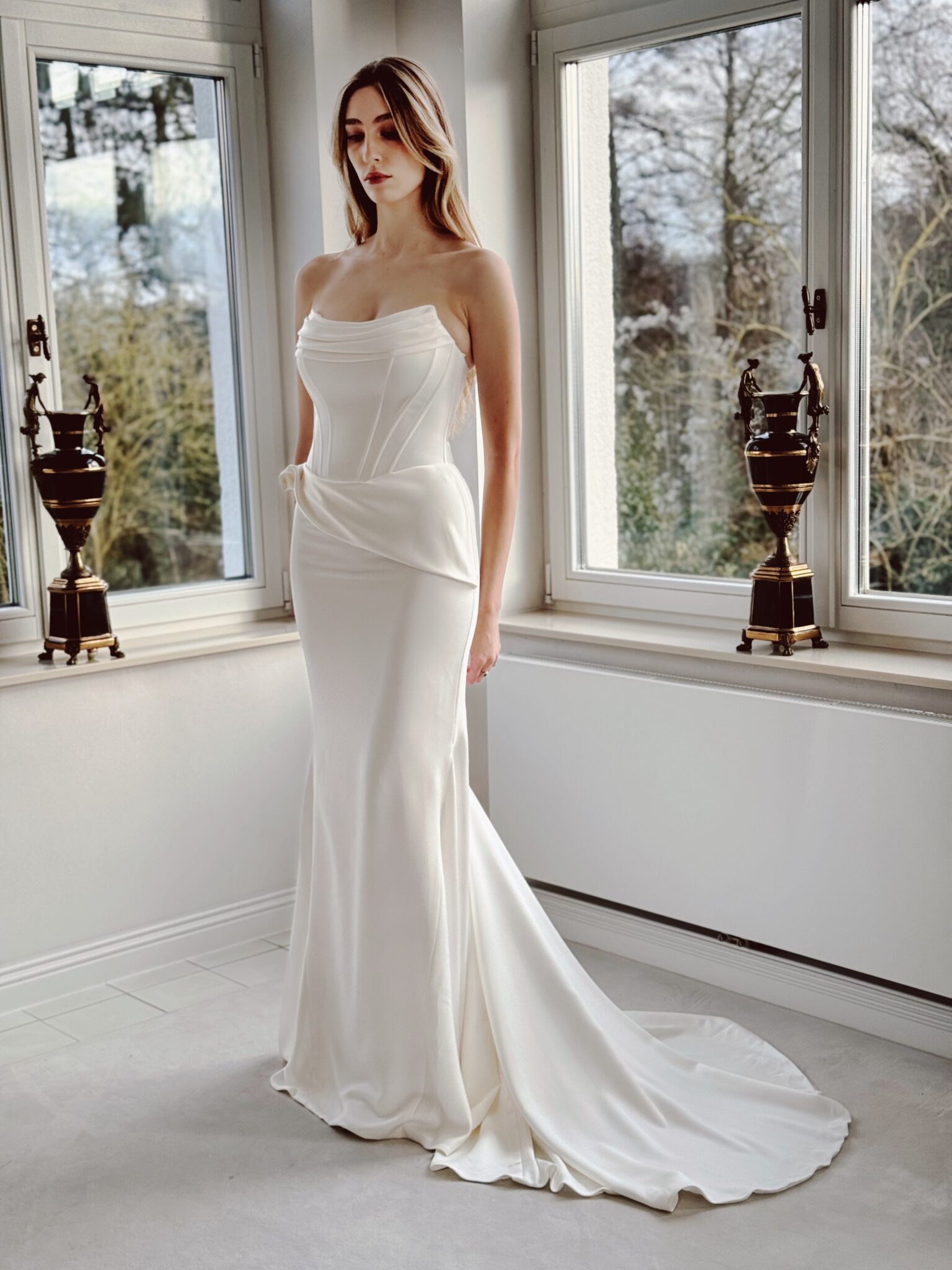 Cleanes Designer fit & flare Brautkleid aus Strech-Satin mit leichtem Lingerie-Effekt, figurschmeichelnder Raffung & Beinschlitz. Das Kleid in Gr. 36 passte perfekt: Unser Model ist 1,78 m, trägt Gr. 36/38 und hat Körbchengröße: 75E mit den Maßen: B: 89cm, T: 66cm, H:97cm.