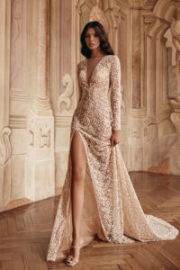 Schmale A-Linie / fit & flare Variante in nude mit Glitzer-Blätter-Applikationen, langen Ärmeln, Beinschlitz & Schlüsselloch-Ausschnitt im Rücken. Die Gr. 38 fällt großzügig aus. Das Kleid wurde leicht abgesteckt: Unser Model ist 1,78 m, trägt Gr. 36/38 und hat Körbchengröße: 75E mit den Maßen: B: 89cm, T: 66cm, H:97cm.