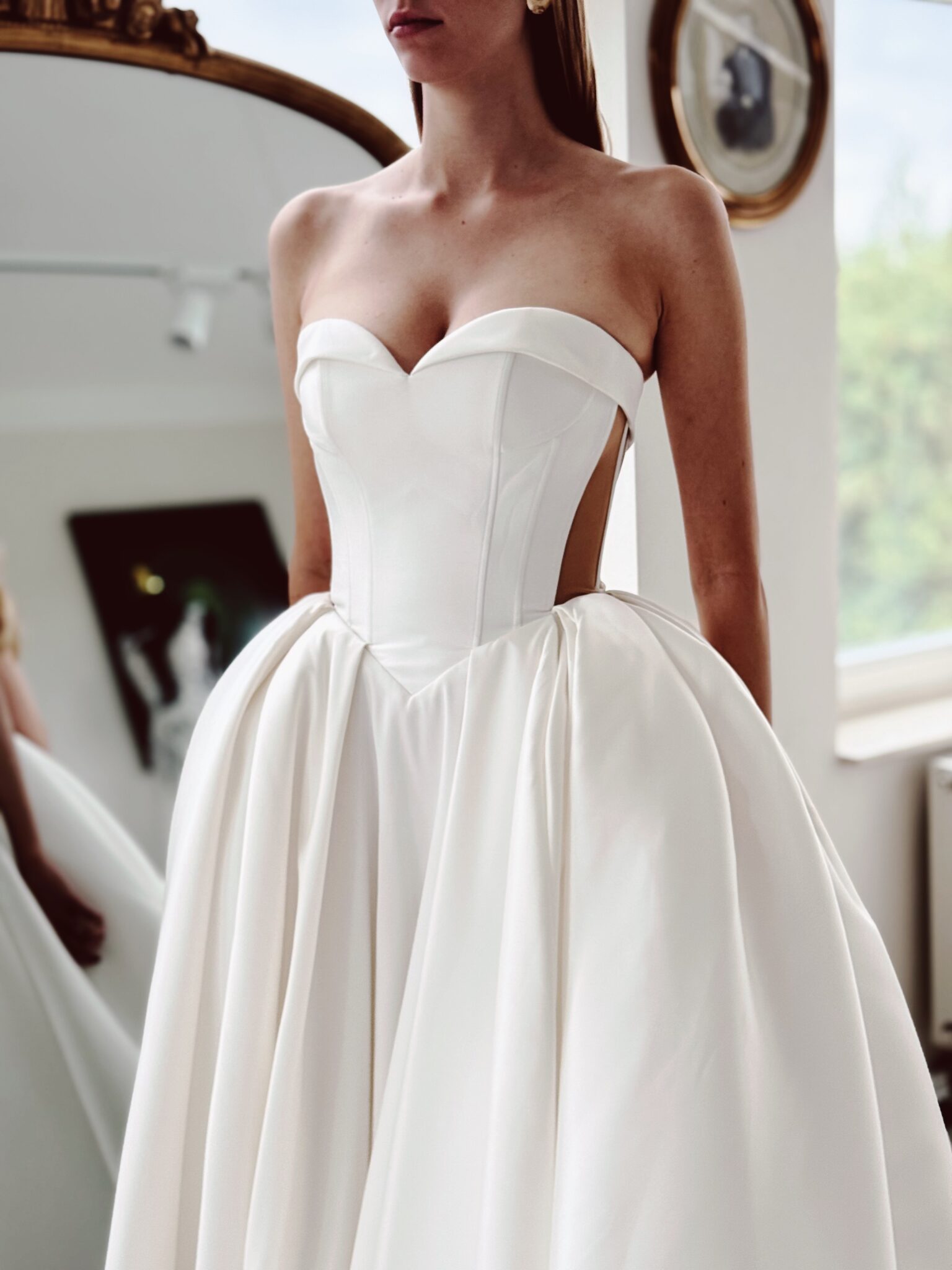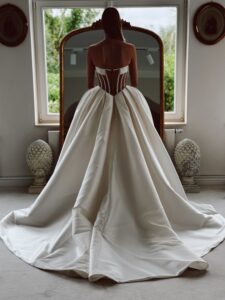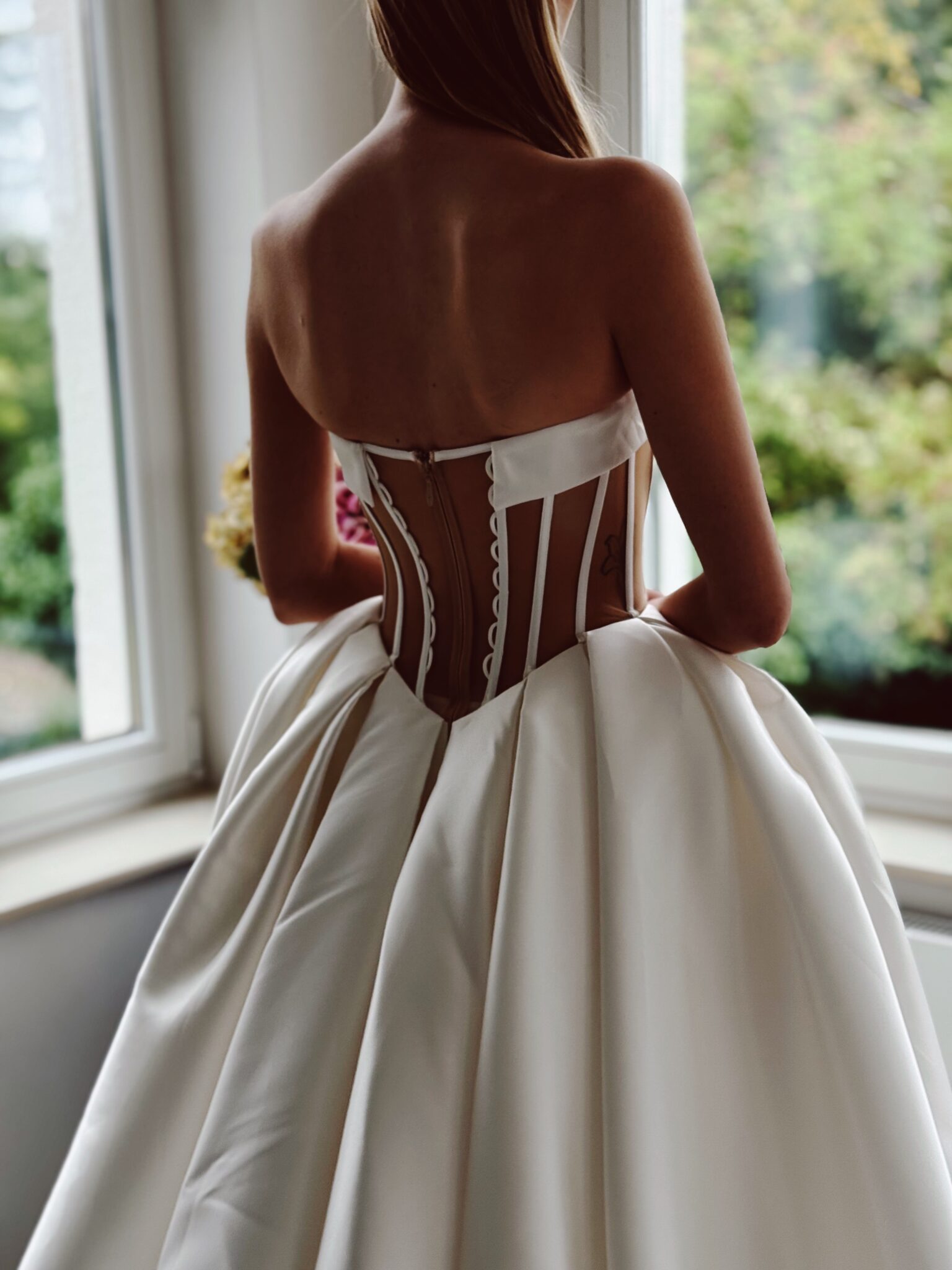 Cleane Prinzessin mit einem Herz-Ausschnitt, baskischer Taille und transparentem Rücken. Das Kleid in Gr. 36 passte: Unser Model ist 1,78 m, trägt Gr. 36/38 und hat Körbchengröße: 75E mit den Maßen: B: 89cm, T: 66cm, H:97cm.