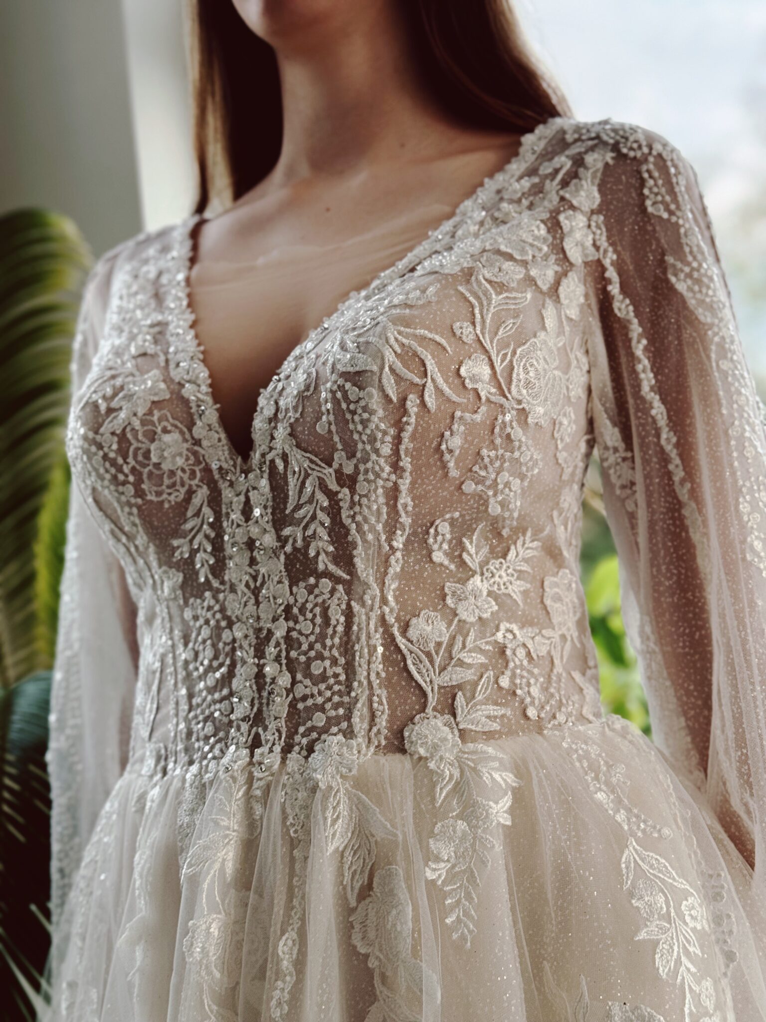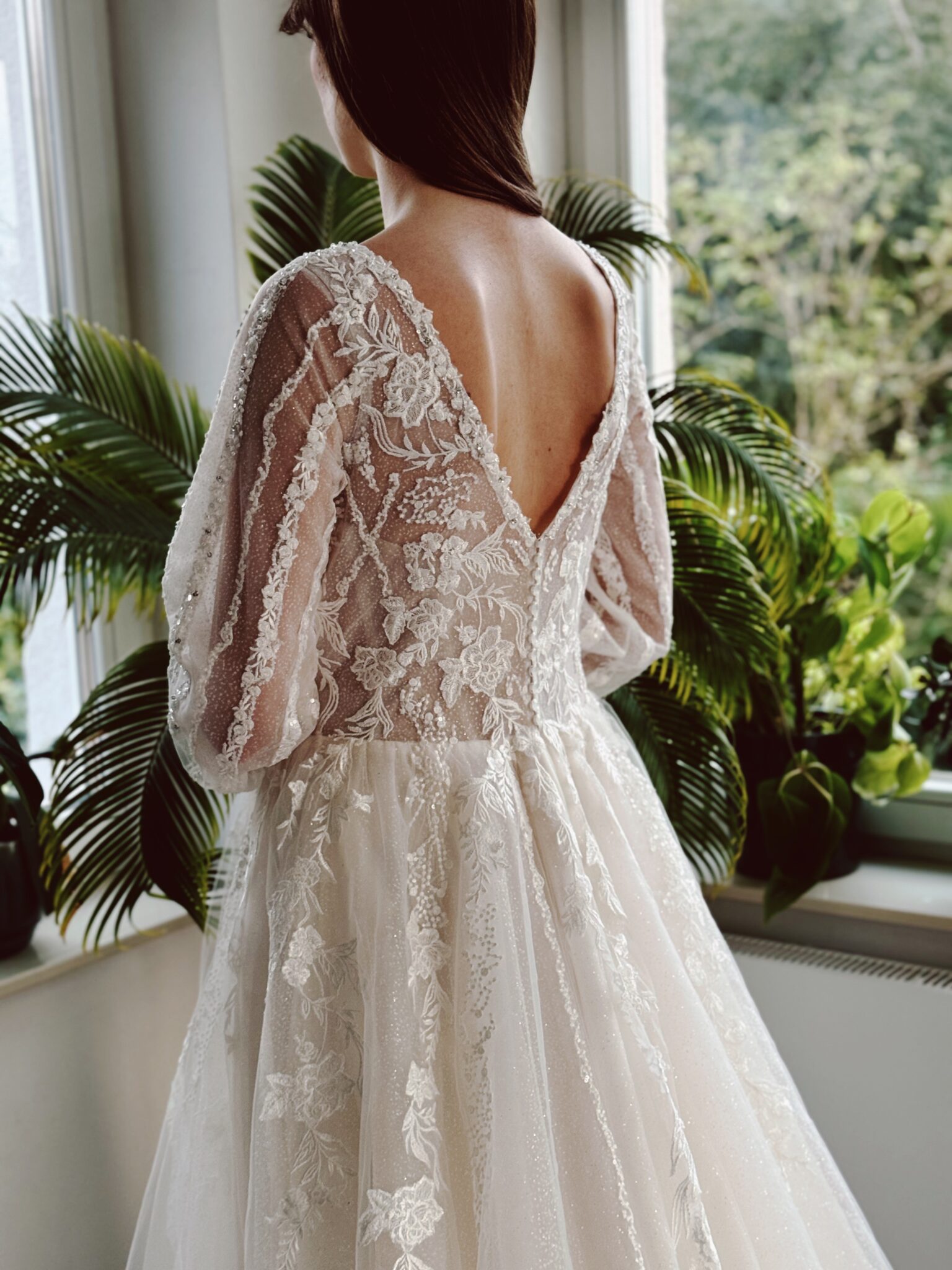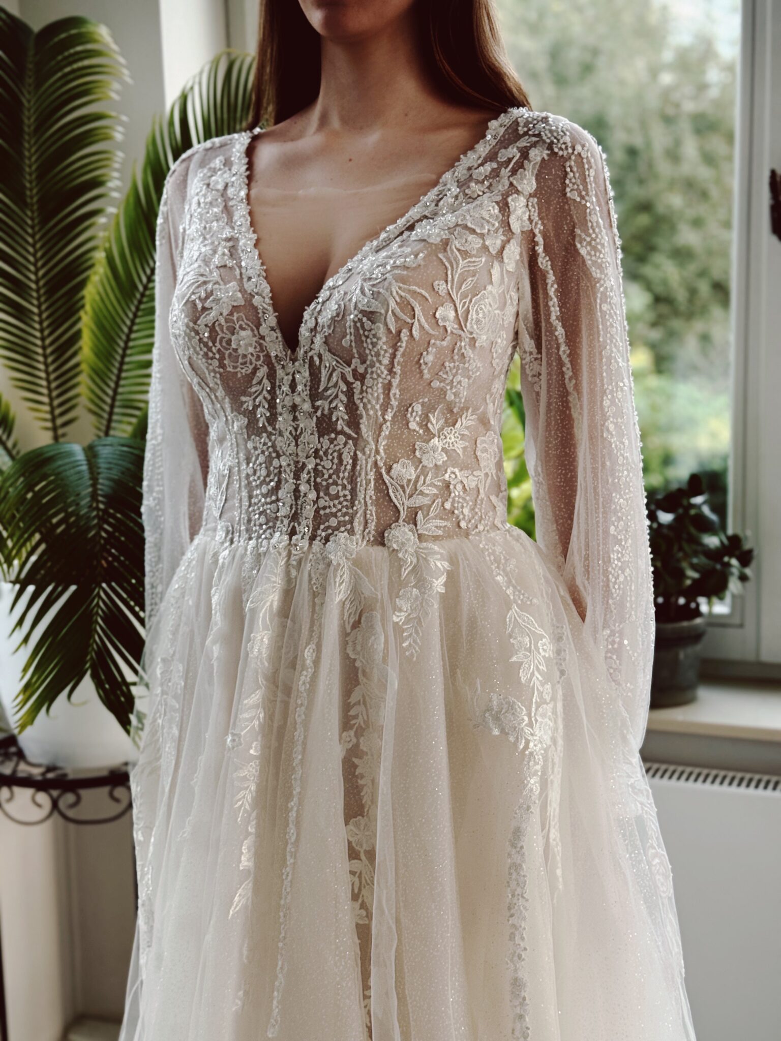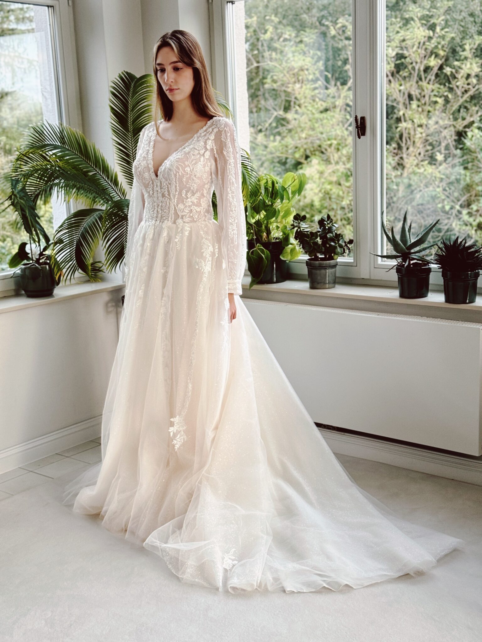 A-Linie Brautkleid mit floralen Glitzer-Spitzenapplikationen, Glitzertüll in der 2. Lage & langen Ärmeln. Farbe: ivory/champ. Das Kleid wurde entsprechend abgesteckt: Unser Model ist 1,78 m, trägt Gr. 36/38 und hat Körbchengröße: 75E mit den Maßen: B: 89cm, T: 66cm, H:97cm.