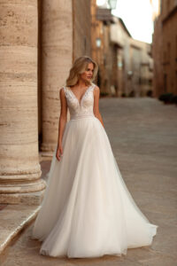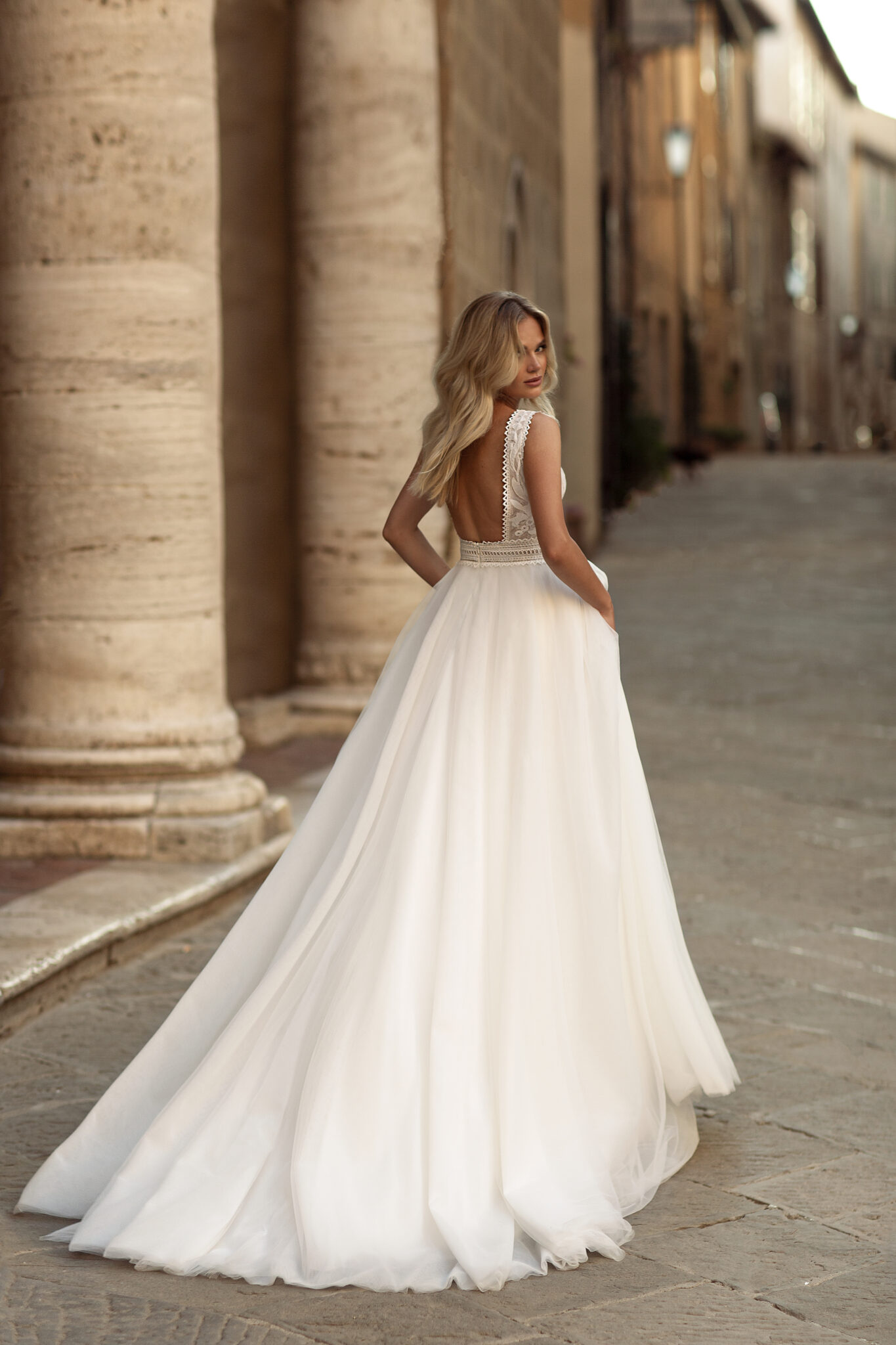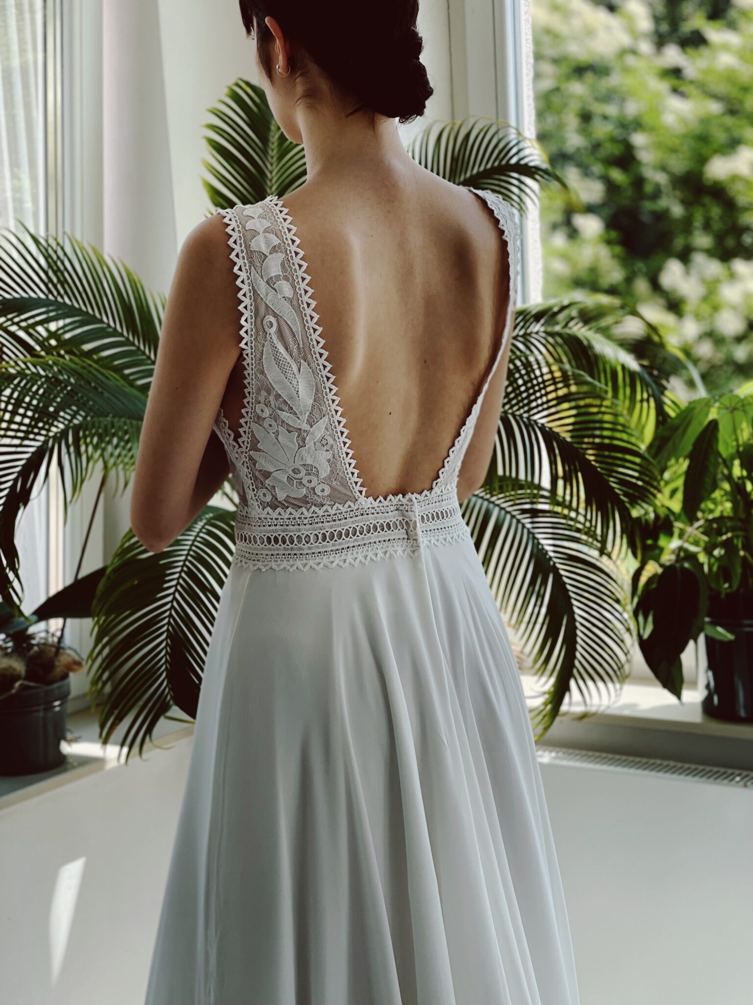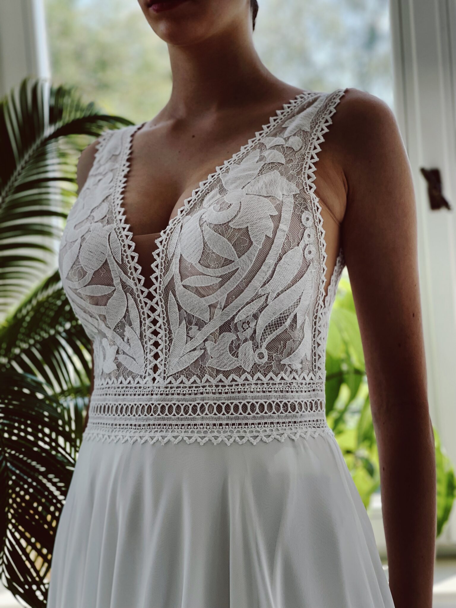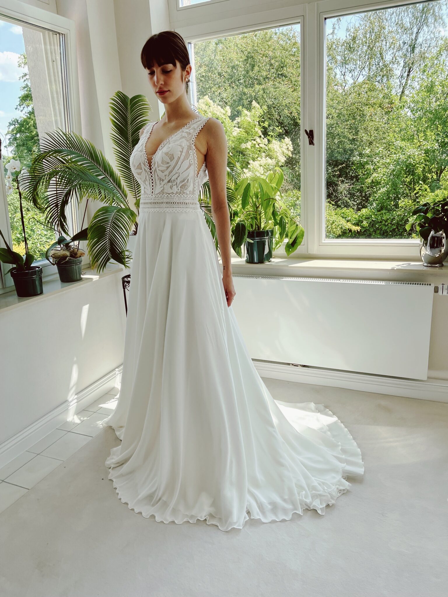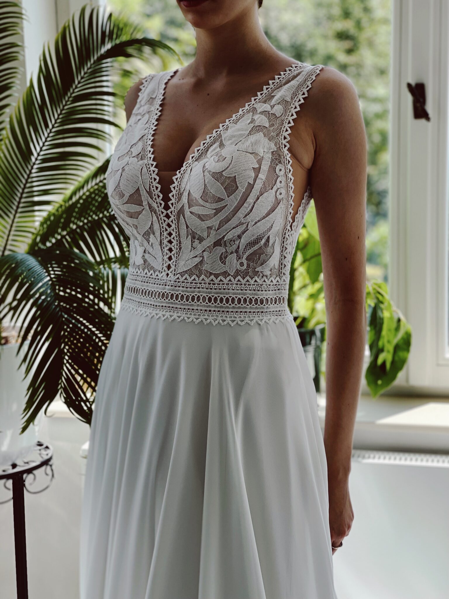 Leicht fallende Chiffon-A-Linie mit Boho-Spitzenapplikationen in der Korsage & V-Ausschnitt im. Das Kleid ist zu groß und wurde entsprechend abgesteckt: Unser Model ist 1,78 m, trägt Gr. 36/38 und hat Körbchengröße: 75E mit den Maßen: B: 89cm, T: 66cm, H:97cm.