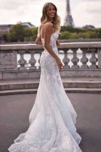 Fit & flare Brautklei von Milla Nova JENNA mit floralen 3D-Glitzer-Spitzenapplikationen, leichtem Lingerie-Effekt, Struktur-Glitzertüll & Tüll-Schnürung in der Korsage. Die Gr. 38 war ein wenig weit: Unser Model ist 1,58 m, trägt Gr. 36 und hat Körbchengröße: 75B mit den Maßen: B: 84cm, T: 71cm, H:96cm.