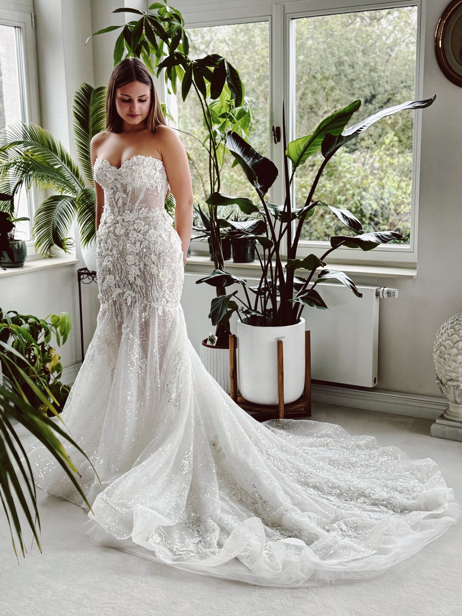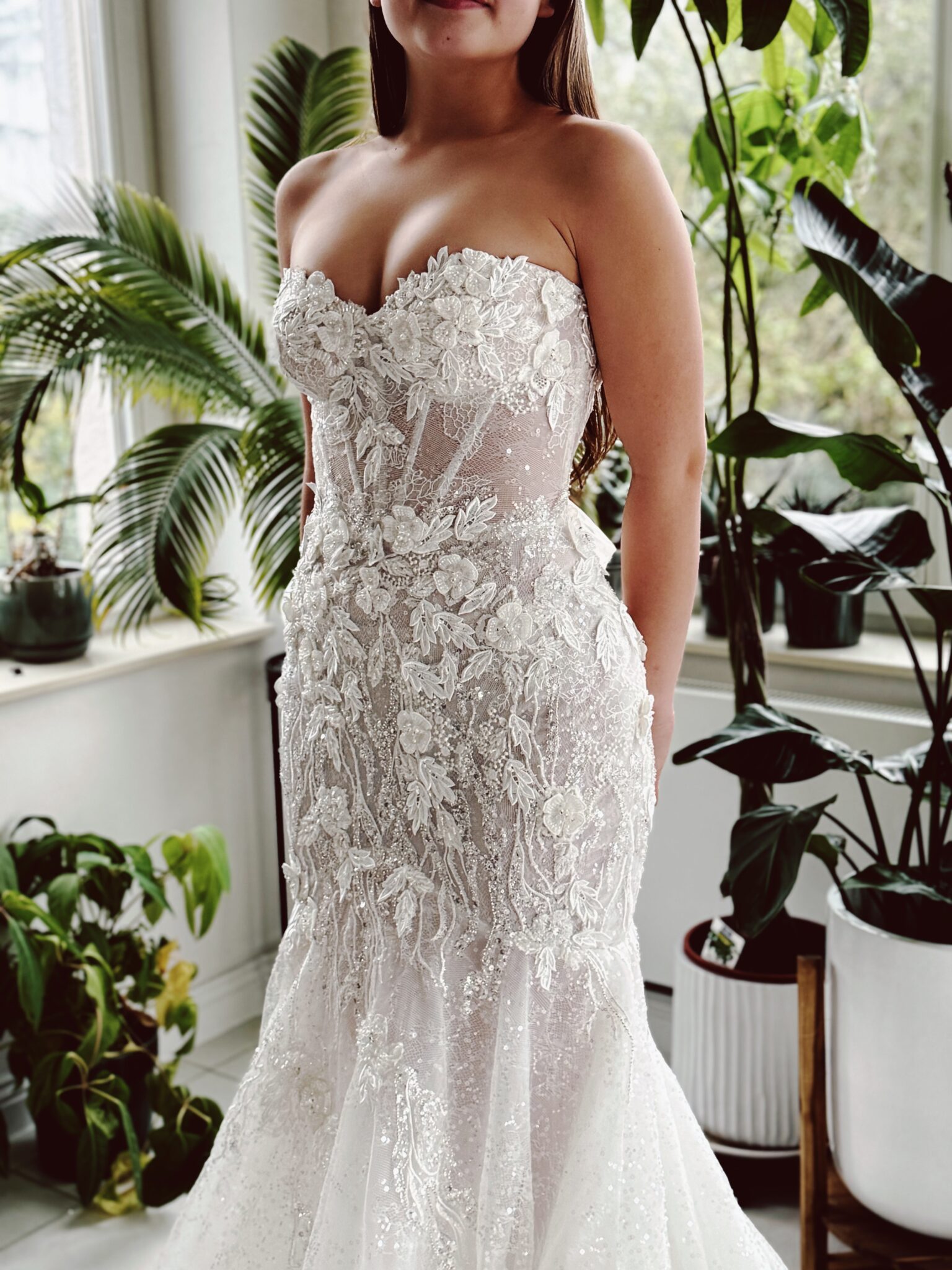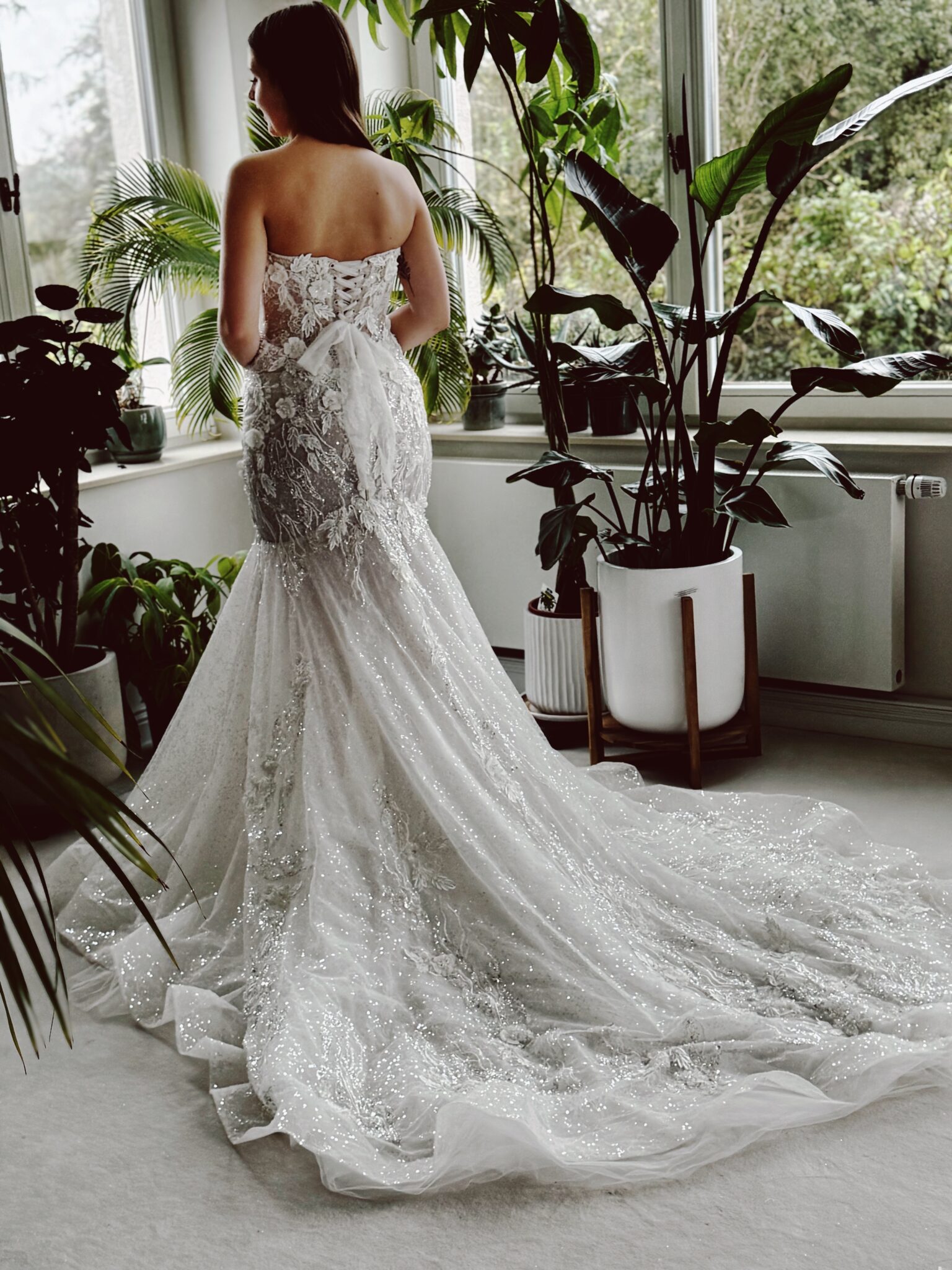 Fit & flare Brautklei von Milla Nova JENNA mit floralen 3D-Glitzer-Spitzenapplikationen, leichtem Lingerie-Effekt, Struktur-Glitzertüll & Tüll-Schnürung in der Korsage. Die Gr. 38 war ein wenig weit: Unser Model ist 1,58 m, trägt Gr. 36 und hat Körbchengröße: 75B mit den Maßen: B: 84cm, T: 71cm, H:96cm.