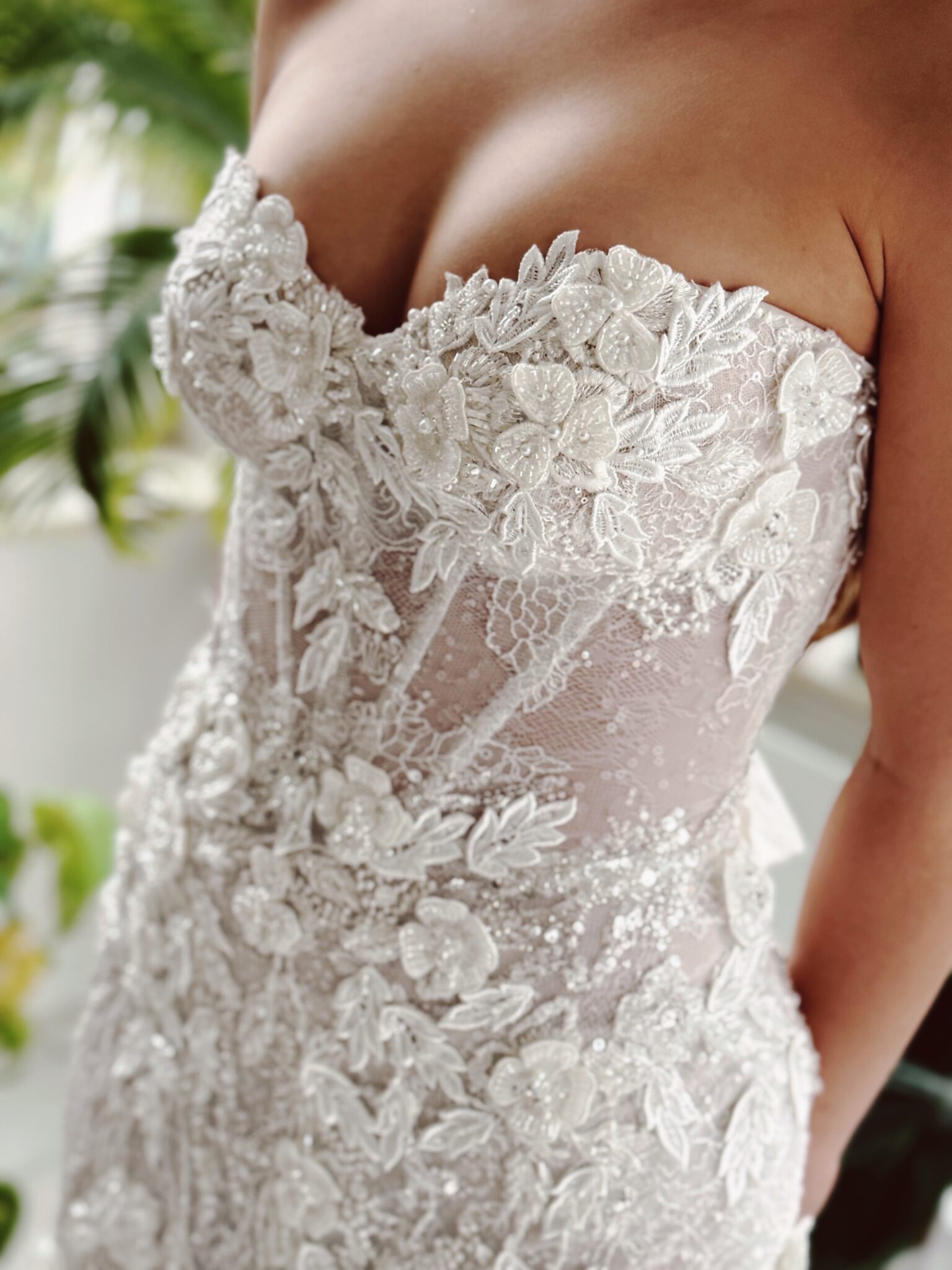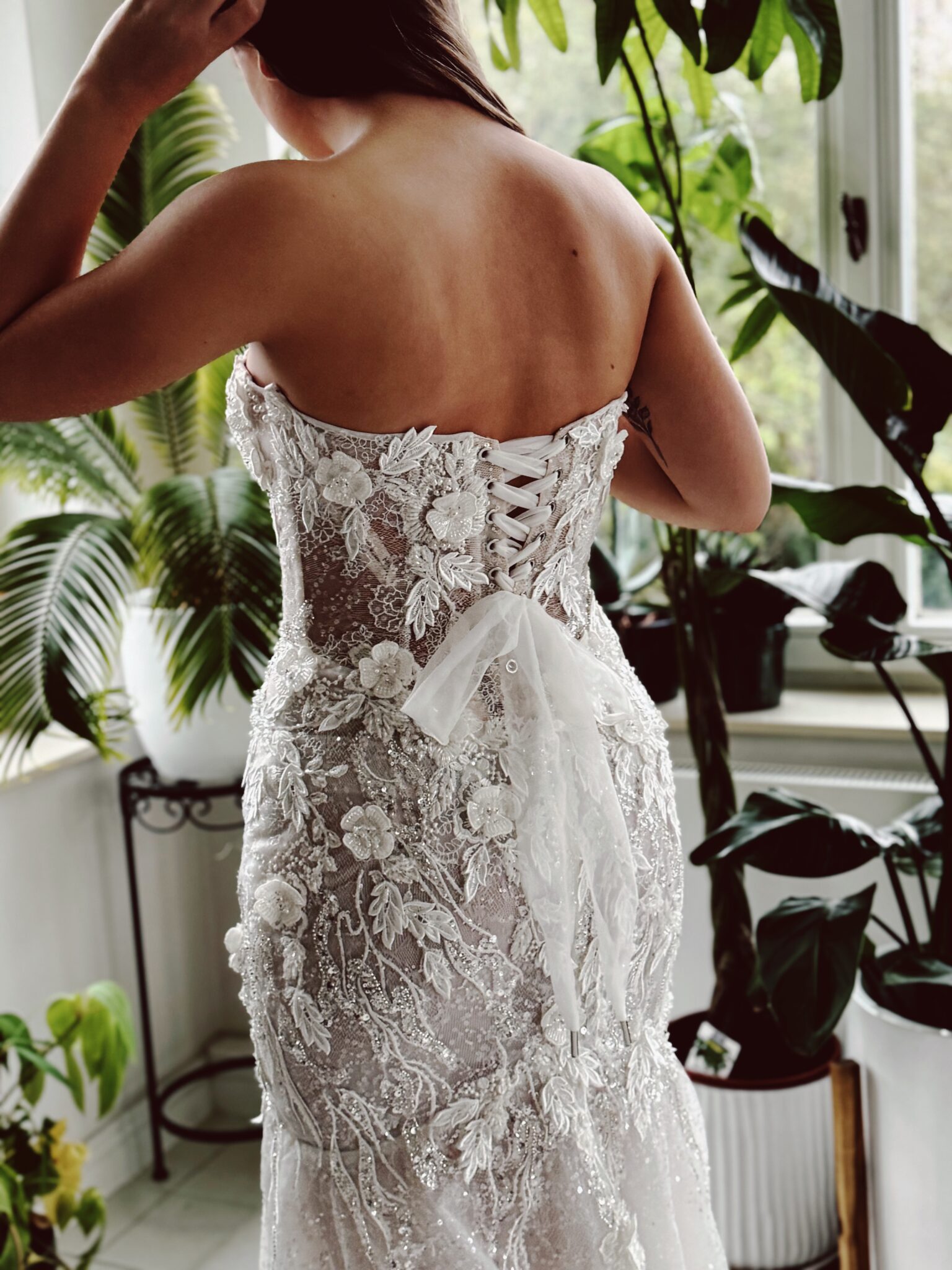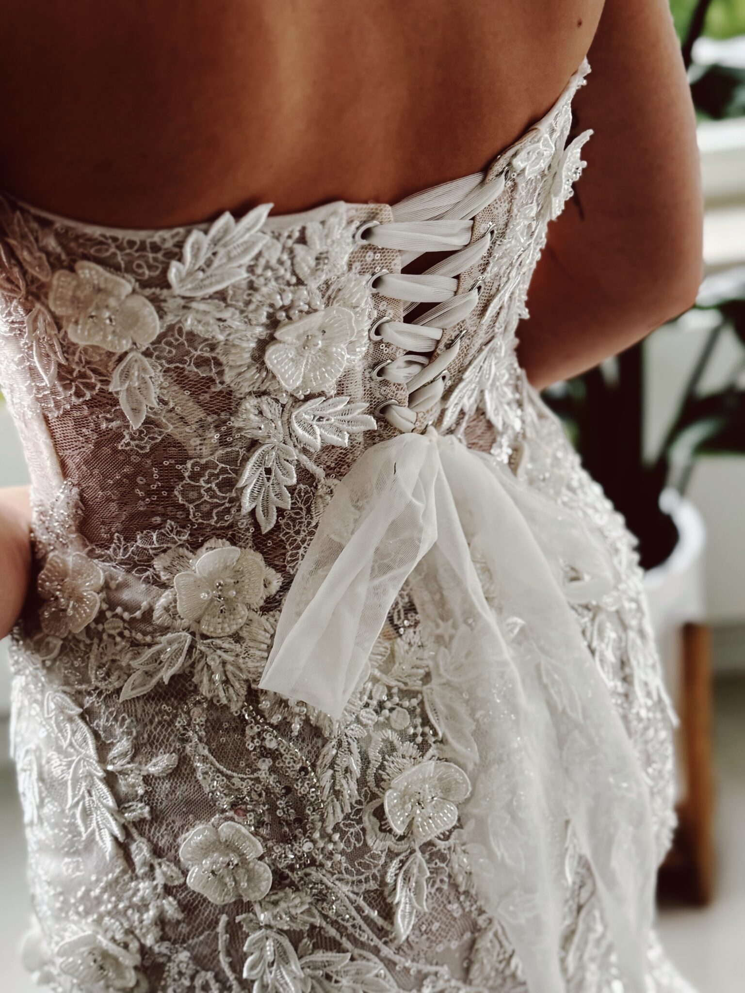 Fit & flare Brautklei von Milla Nova JENNA mit floralen 3D-Glitzer-Spitzenapplikationen, leichtem Lingerie-Effekt, Struktur-Glitzertüll & Tüll-Schnürung in der Korsage. Die Gr. 38 war ein wenig weit: Unser Model ist 1,58 m, trägt Gr. 36 und hat Körbchengröße: 75B mit den Maßen: B: 84cm, T: 71cm, H:96cm.