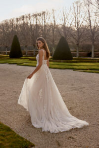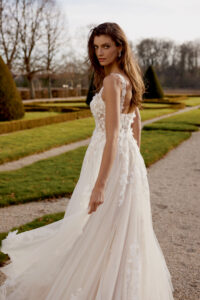 Designer A-Linie von Justin Alexander - JUPITER mit 3D-Blüten, geradem Ausschnitt & leichtem Lingerie Effekt in der Korsage. Das Kleid in Gr. 38 war zu groß: Unser Model ist 1,78 m, trägt Gr. 36/38 und hat Körbchengröße: 75E mit den Maßen: B: 89cm, T: 66cm, H:97cm.
