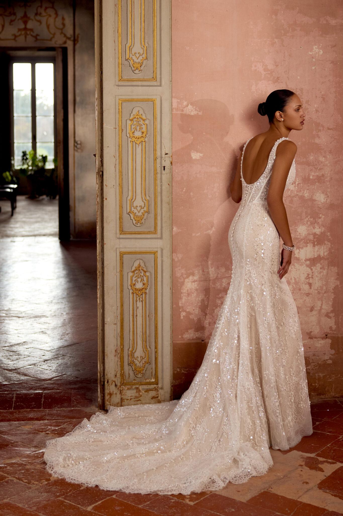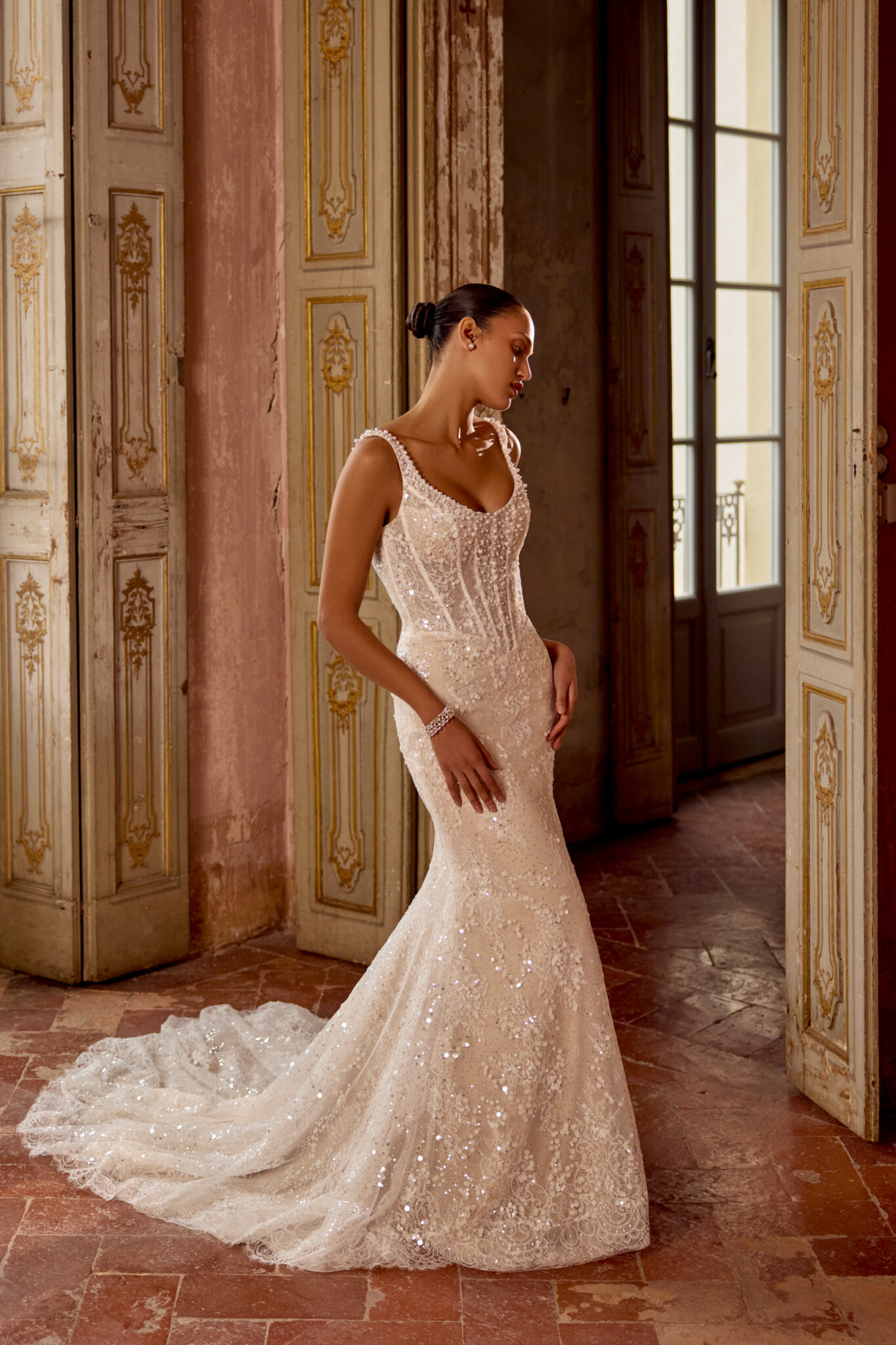 Fit and Flare von Justin Alexander - KYLIE aus Pailetten und Chantilly-Spitze mit einer Korsett-Taille. Das Kleid in Gr. 38 war zu groß: Unser Model ist 1,78 m, trägt Gr. 36/38 und hat Körbchengröße: 75E mit den Maßen: B: 89cm, T:66cm, H:97cm.