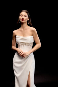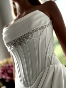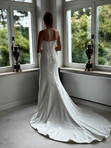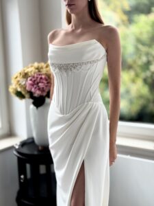 Cleanes fit and flare von Justin Alexander - LAYLA mit sichbaren Stäben in der Korsage, einem Strassdetail im Dekolleté und einem Beinschlitz. Das Kleid in Gr. 36 war ein wenig zu groß: Unser Model ist 1,78 m, trägt Gr. 36/38 und hat Körbchengröße: 75E mit den Maßen: B: 89cm, T: 66cm, H:97cm.