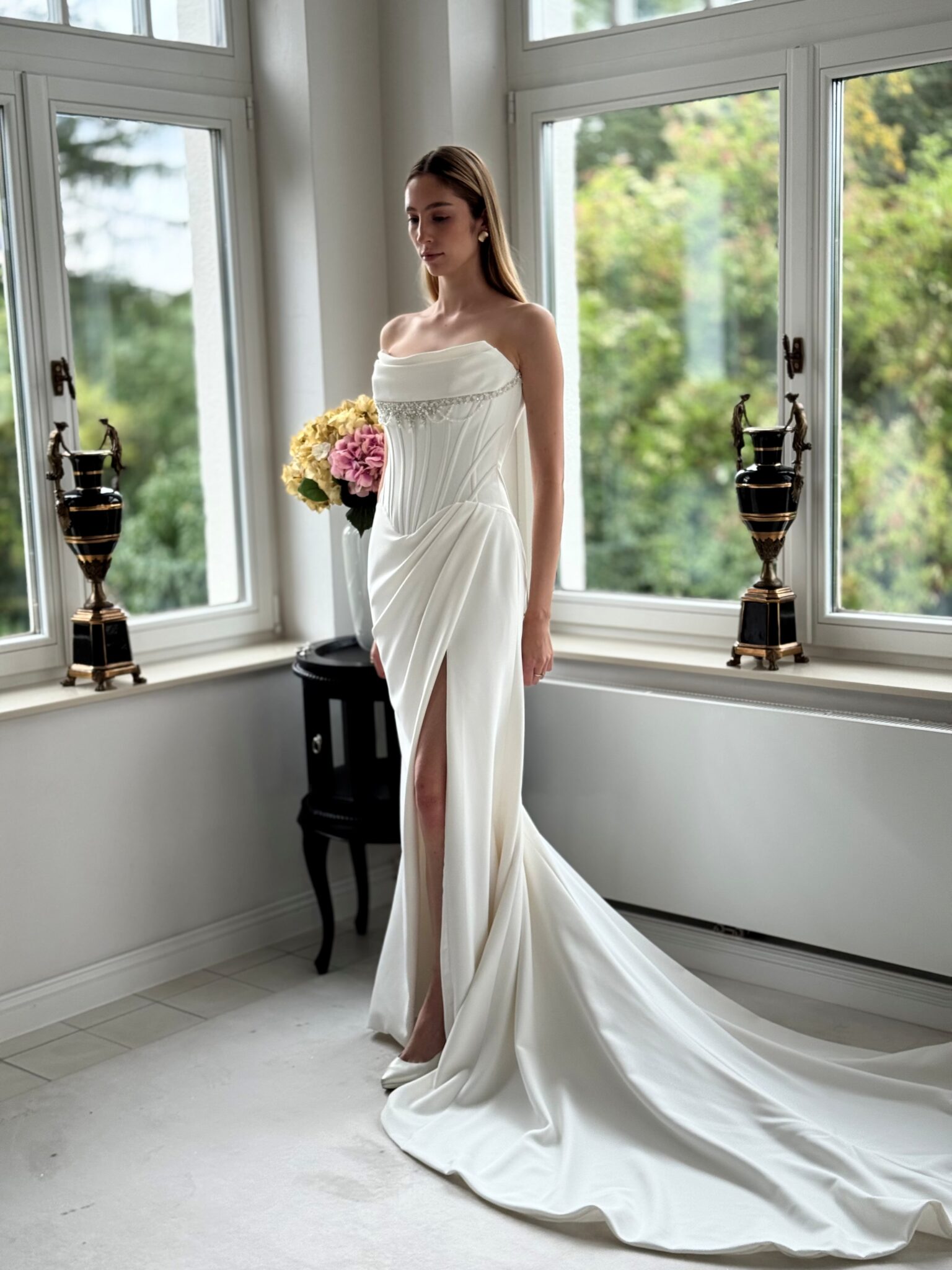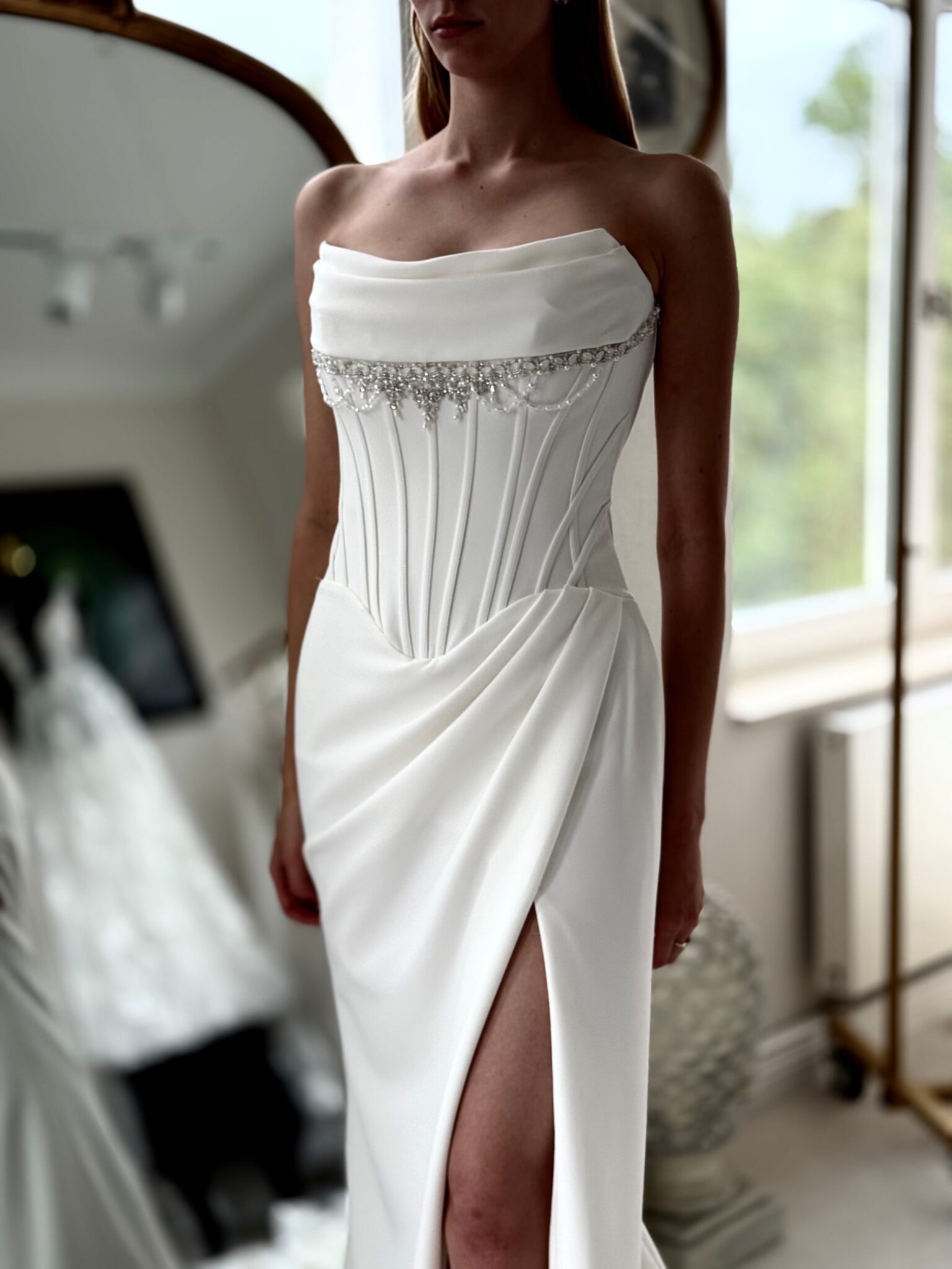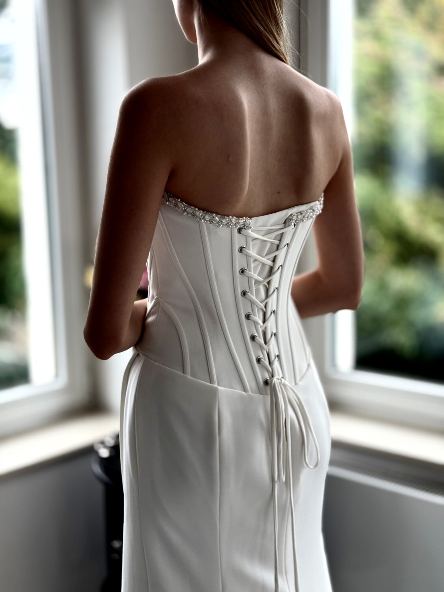 Cleanes fit and flare von Justin Alexander - LAYLA mit sichbaren Stäben in der Korsage, einem Strassdetail im Dekolleté und einem Beinschlitz. Das Kleid in Gr. 36 war ein wenig zu groß: Unser Model ist 1,78 m, trägt Gr. 36/38 und hat Körbchengröße: 75E mit den Maßen: B: 89cm, T: 66cm, H:97cm.
