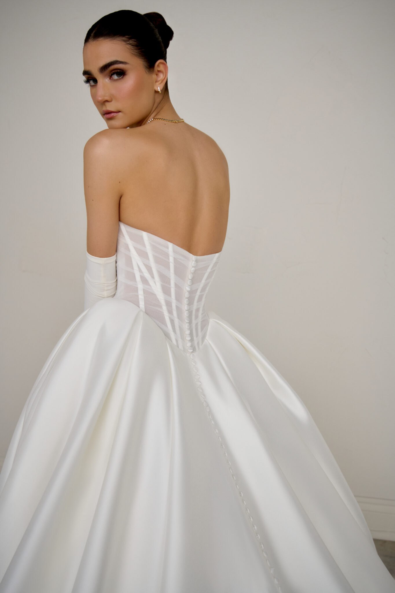 Prinzessin von Justin Alexander - MONARCH mit transparentem Tülloberteil, sichtbaren Stäben, einer baskischen Taille und einem cleanen Rock. Das Kleid in Gr. 38 war ein wenig zu groß: Unser Model ist 1,78 m, trägt Gr. 36/38 und hat Körbchengröße: 75E mit den Maßen: B: 89cm, T: 66cm, H:97cm.