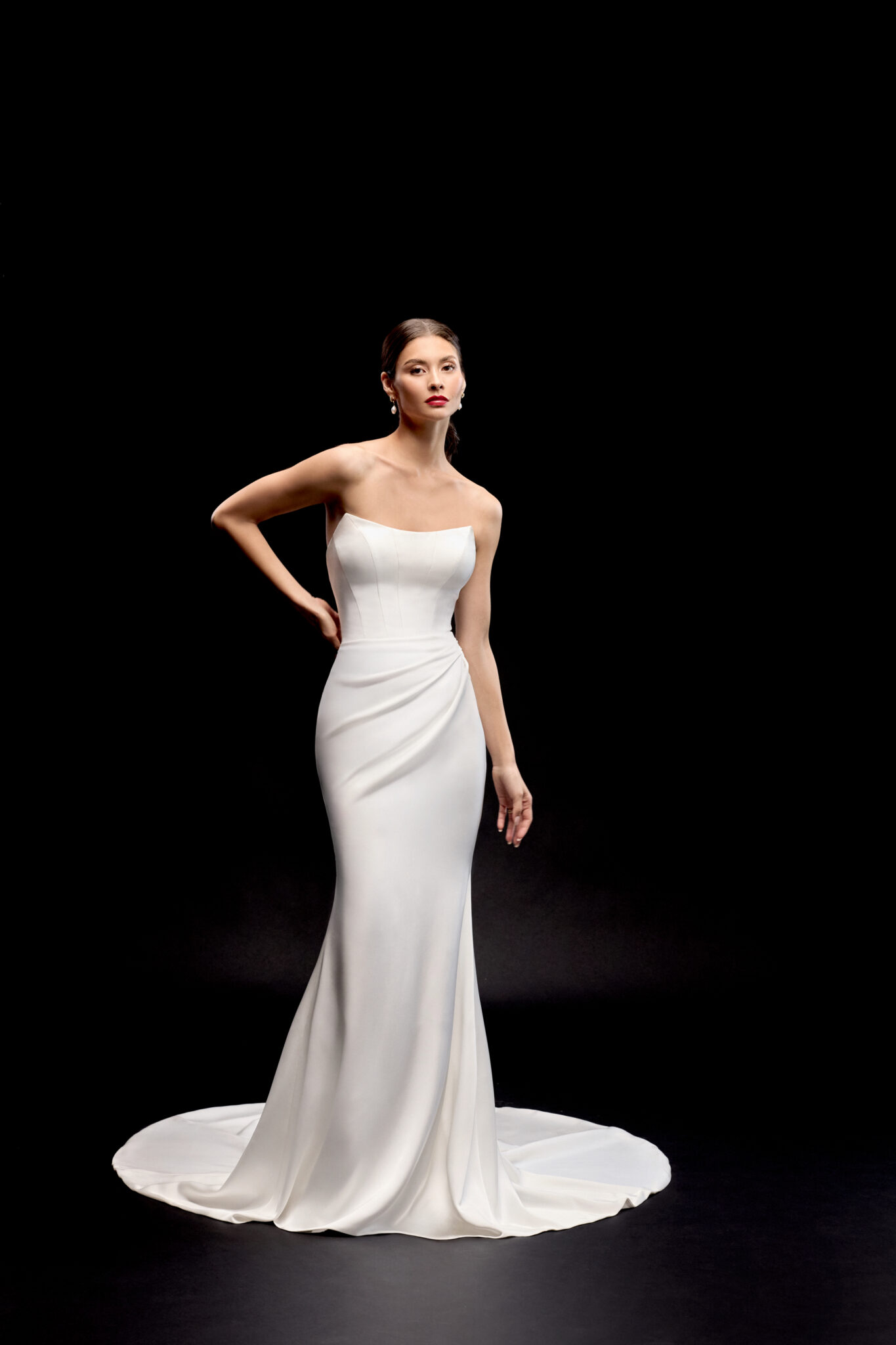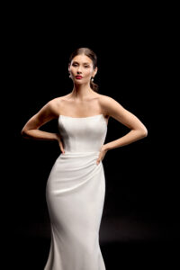 Fit and Flare von Justin Alexander - IVERSON mit trägerlosem Corsagen-Oberteil, einem U-Ausschnitt und einer langen Knopfleiste bis zum Ende der Schleppe. Das Kleid in Gr. 34 passte gut: Unser Model ist 1,78 m, trägt Gr. 36/38 und hat Körbchengröße: 75E mit den Maßen: B: 89cm, T: 66cm, H:97cm.