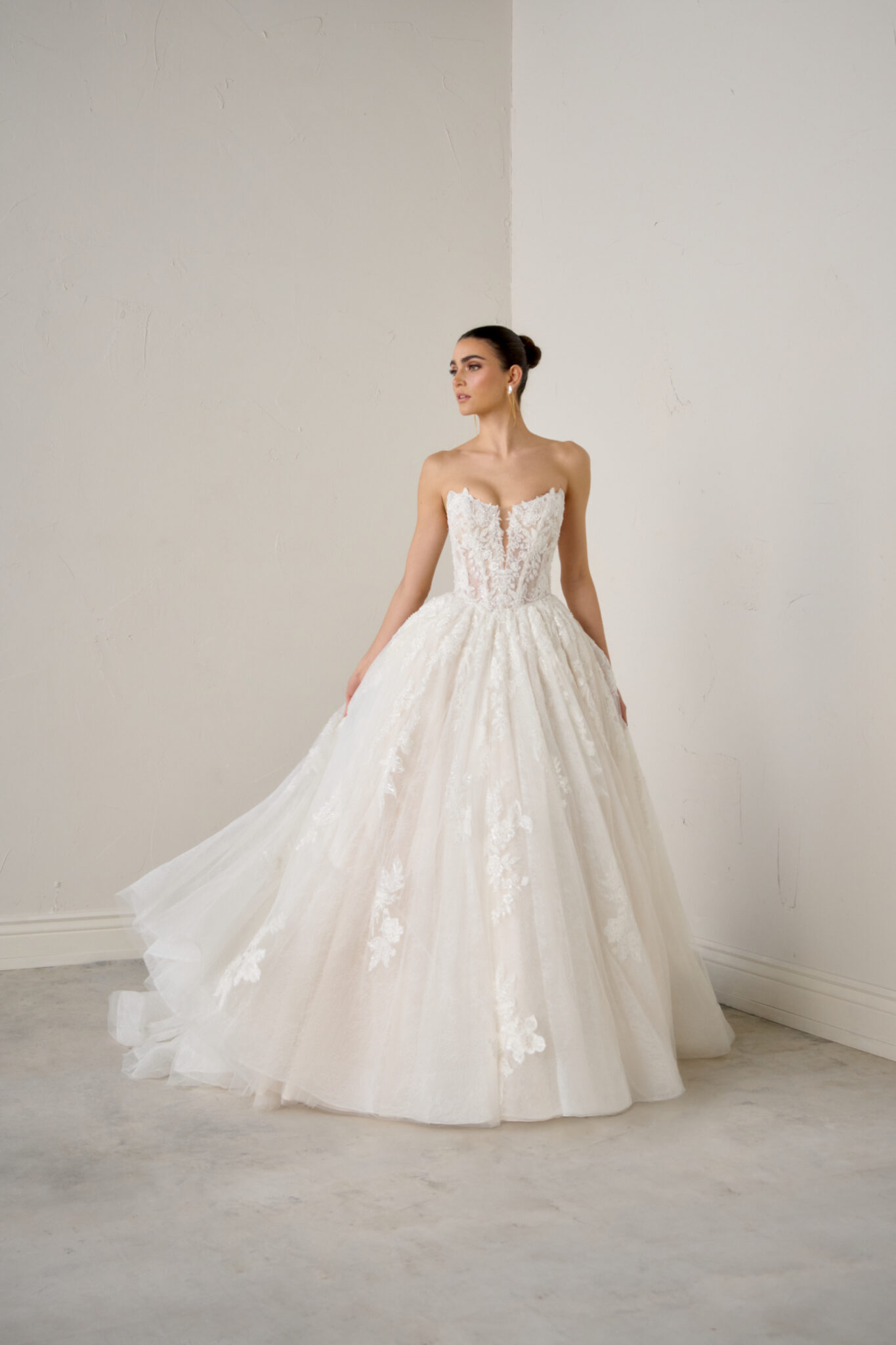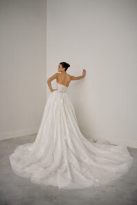Prinzessin von Justin Alexander - VALENTINA aus durchgehender Spitze mit einer baskischen Taille. Das Kleid in Gr. 38 war ein wenig zu groß: Unser Model ist 1,78 m, trägt Gr. 36/38 und hat Körbchengröße: 75E mit den Maßen: B: 89cm, T: 66cm, H:97cm.