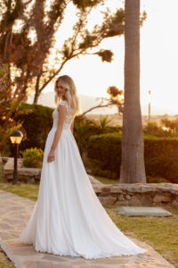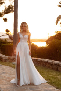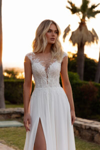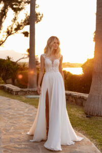 Chiffon A-Linie mit einem kleinem Cut Out im geschlossenem Dekolleté, Blätter-Glitzer-Spitzenapplikationen in der Korsage, Beinschlitz und einem geschlossenem Rückenausschnitt. Das Kleid in Gr. 44 wurde entsprechend abgesteckt: Unser Model ist 1,78 m, trägt Gr. 36/38 und hat Körbchengröße: 75E mit den Maßen: B: 89cm, T: 66cm, H:97cm.