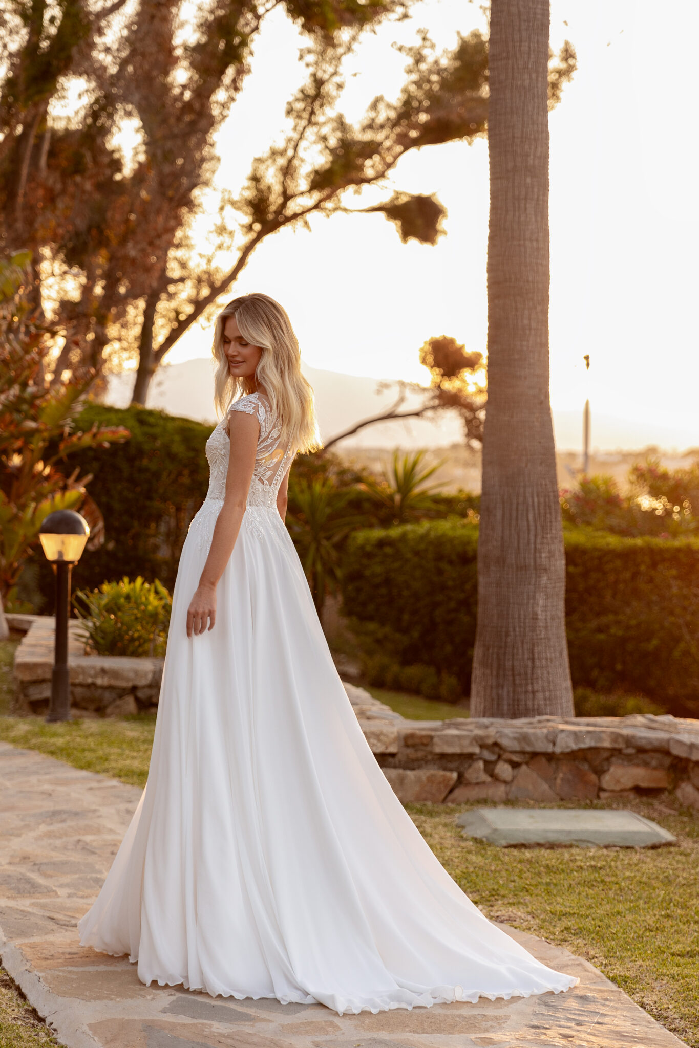 Chiffon A-Linie mit einem kleinem Cut Out im geschlossenem Dekolleté, Blätter-Glitzer-Spitzenapplikationen in der Korsage, Beinschlitz und einem geschlossenem Rückenausschnitt. Das Kleid in Gr. 44 wurde entsprechend abgesteckt: Unser Model ist 1,78 m, trägt Gr. 36/38 und hat Körbchengröße: 75E mit den Maßen: B: 89cm, T: 66cm, H:97cm.