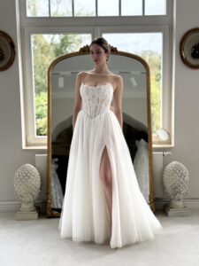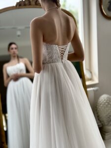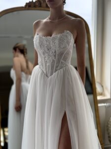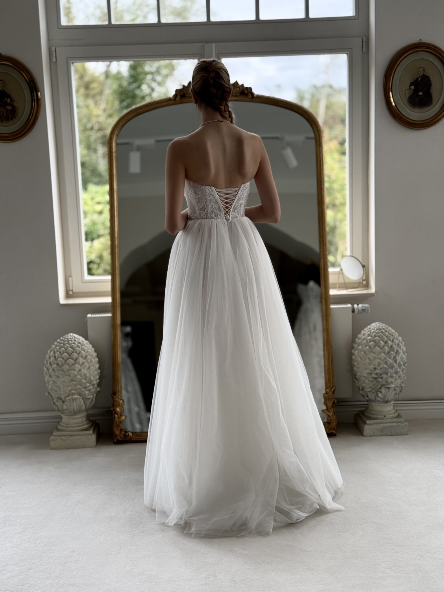 Leichte Prinzessin aus zarter Spitze, einer baskischen Taille und einer Schnürung im Rücken. Das Kleid hat sehr viel Halt in der Korsage und ist auch für eine größere Oberweite geeignet.