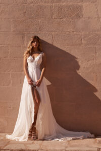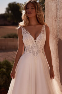Chiffon A-Linie mit einem Cut Out im Dekolleté, einem Rücken im Tattoo-Effekt und Blätter-Spitzenapplikationen in der Corsage. Das Kleid in Gr. 36 passte gut: Unser Model ist 1,78 m, trägt Gr. 36/38 und hat Körbchengröße: 75E mit den Maßen: B: 89cm, T: 66cm, H:97cm.