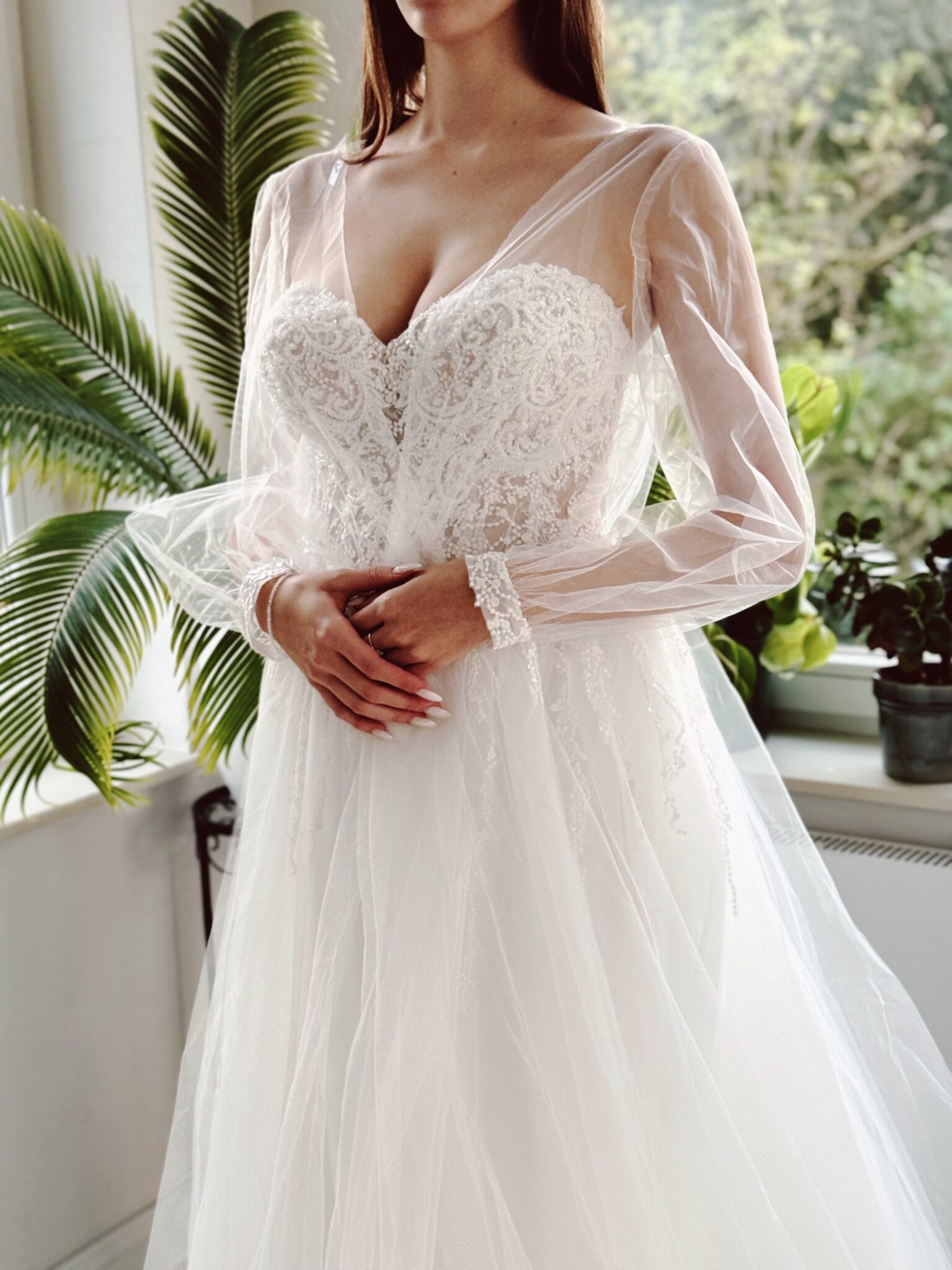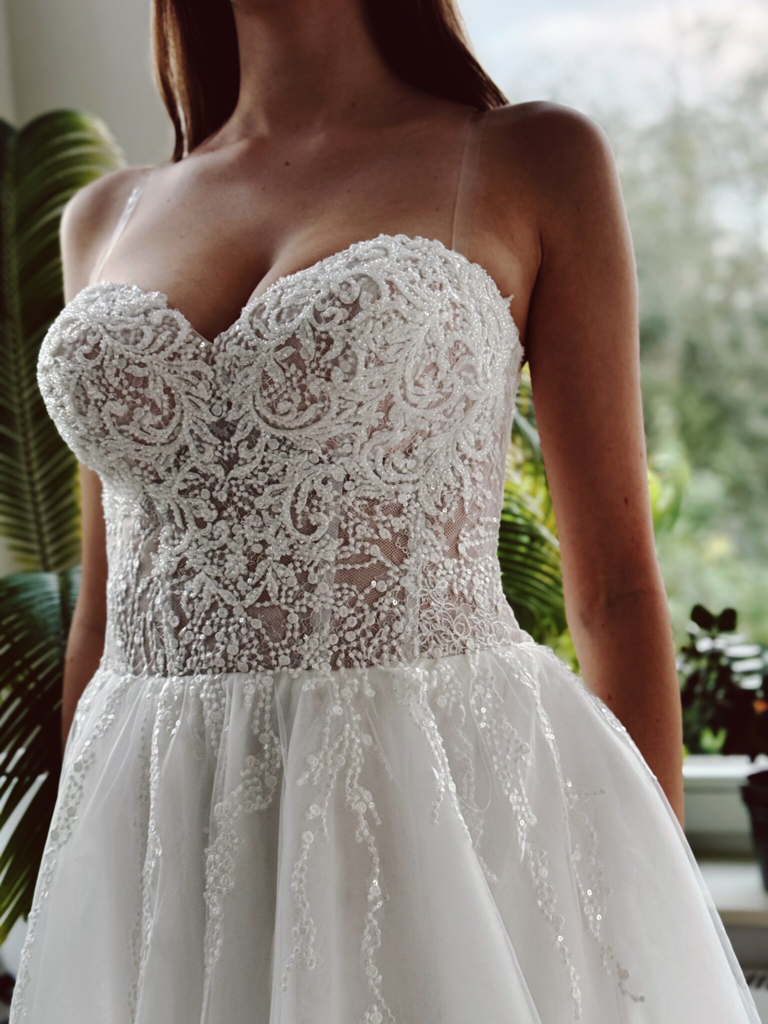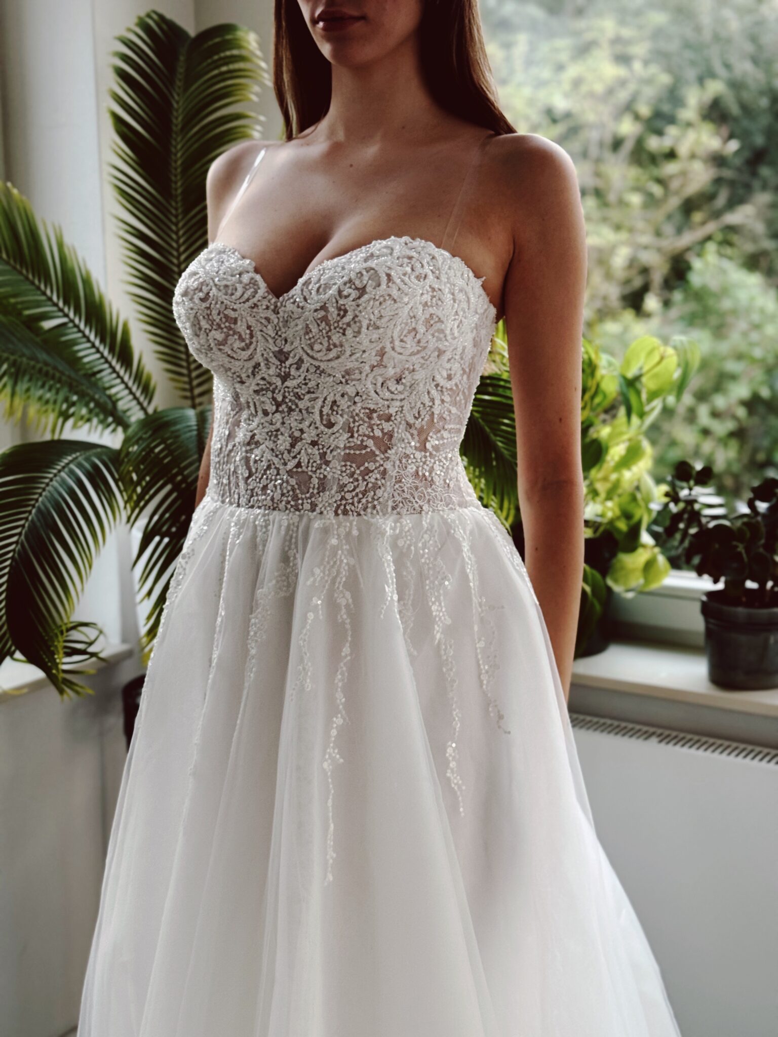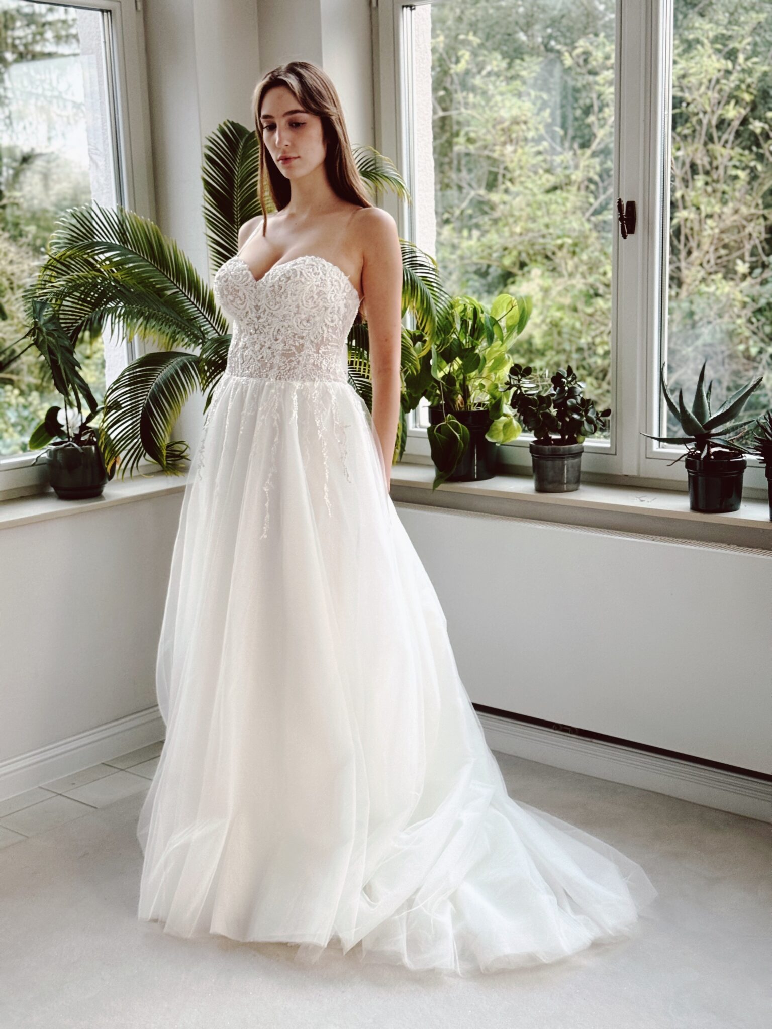 A-Linie Brautkleid mit Glitzer-Spitzenapplikationen, Schnürung in der Korsage & passender Tüll-Jacke. Farbe: ivory. Das Kleid wurde entsprechend abgesteckt: Unser Model ist 1,78 m, trägt Gr. 36/38 und hat Körbchengröße: 75E mit den Maßen: B: 89cm, T: 66cm, H:97cm.
