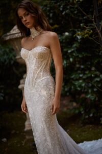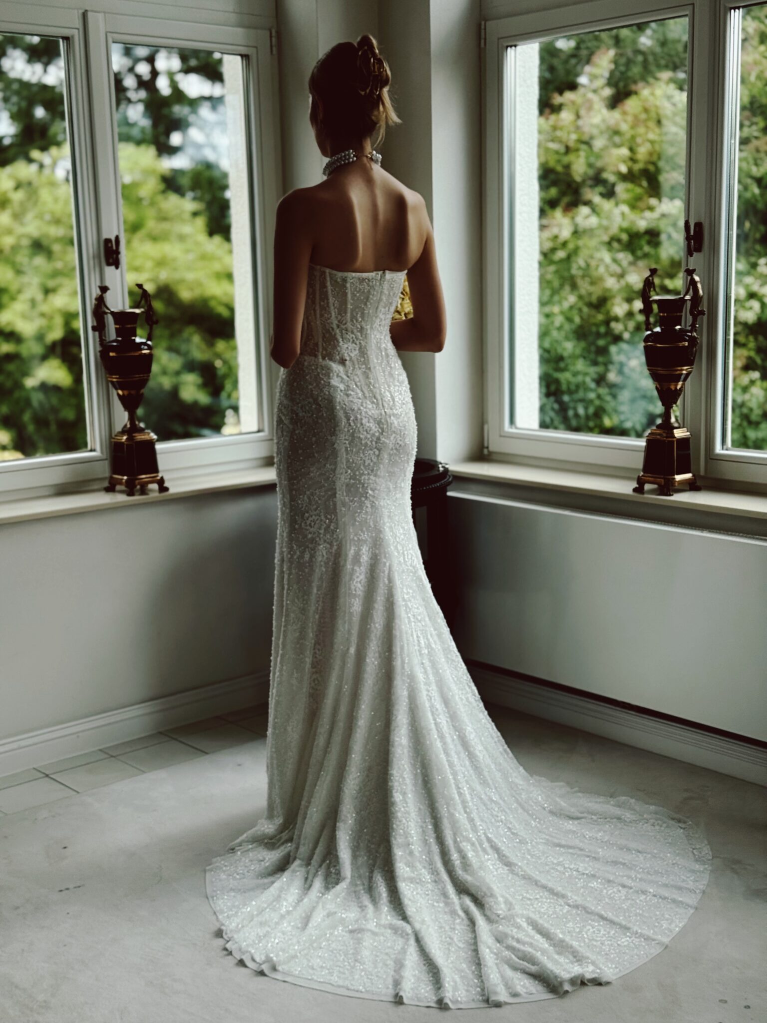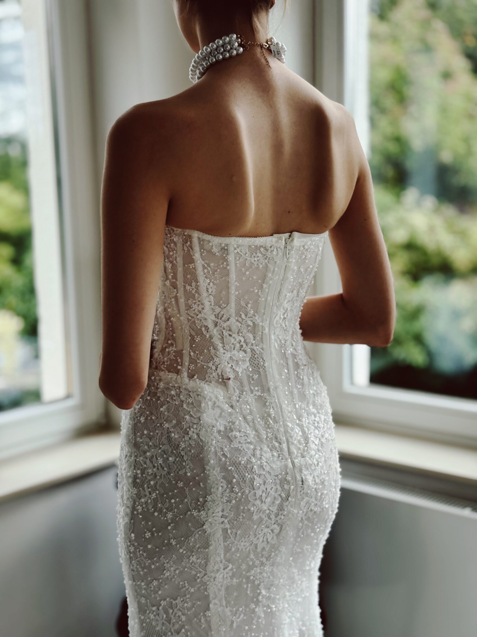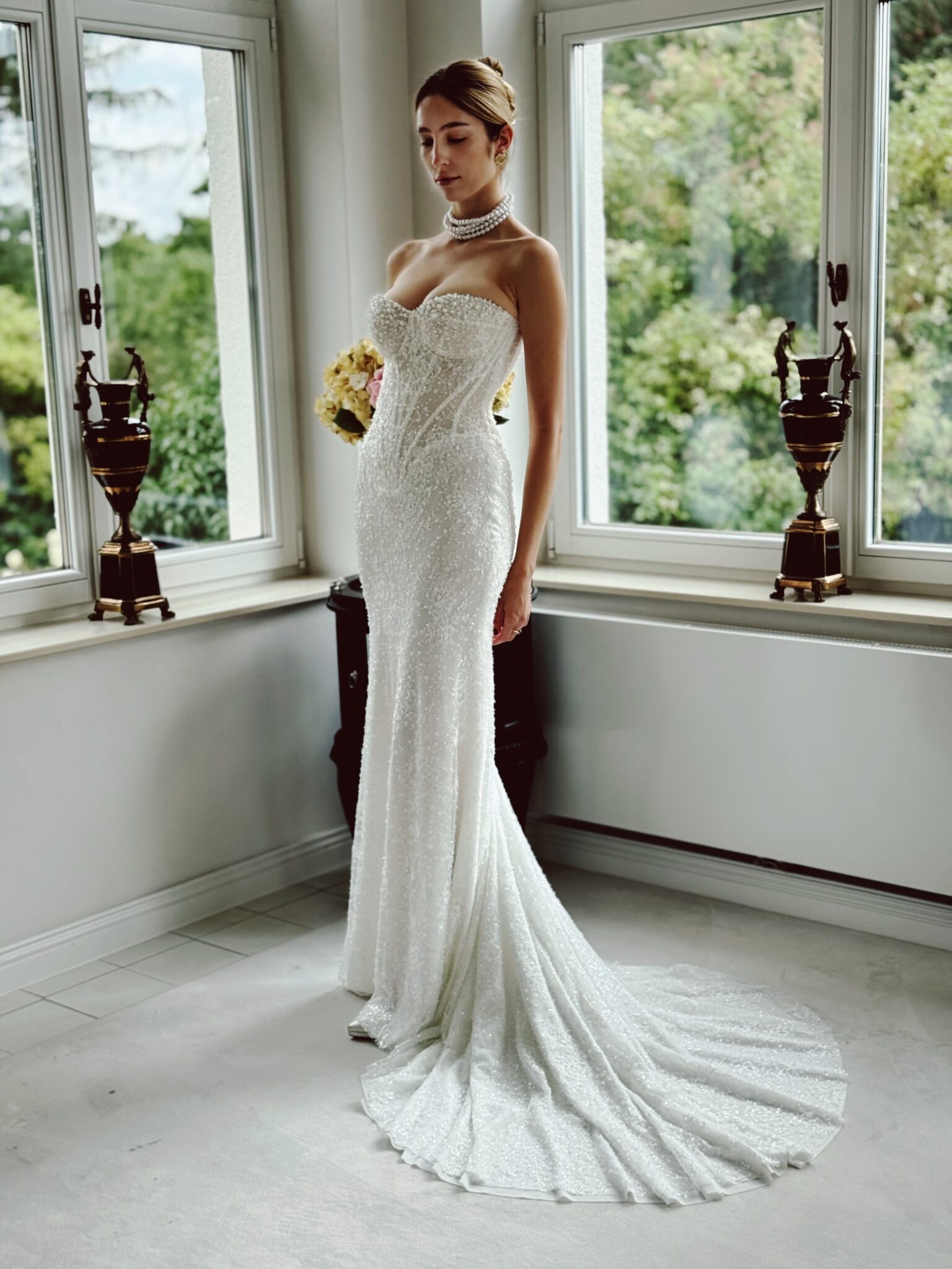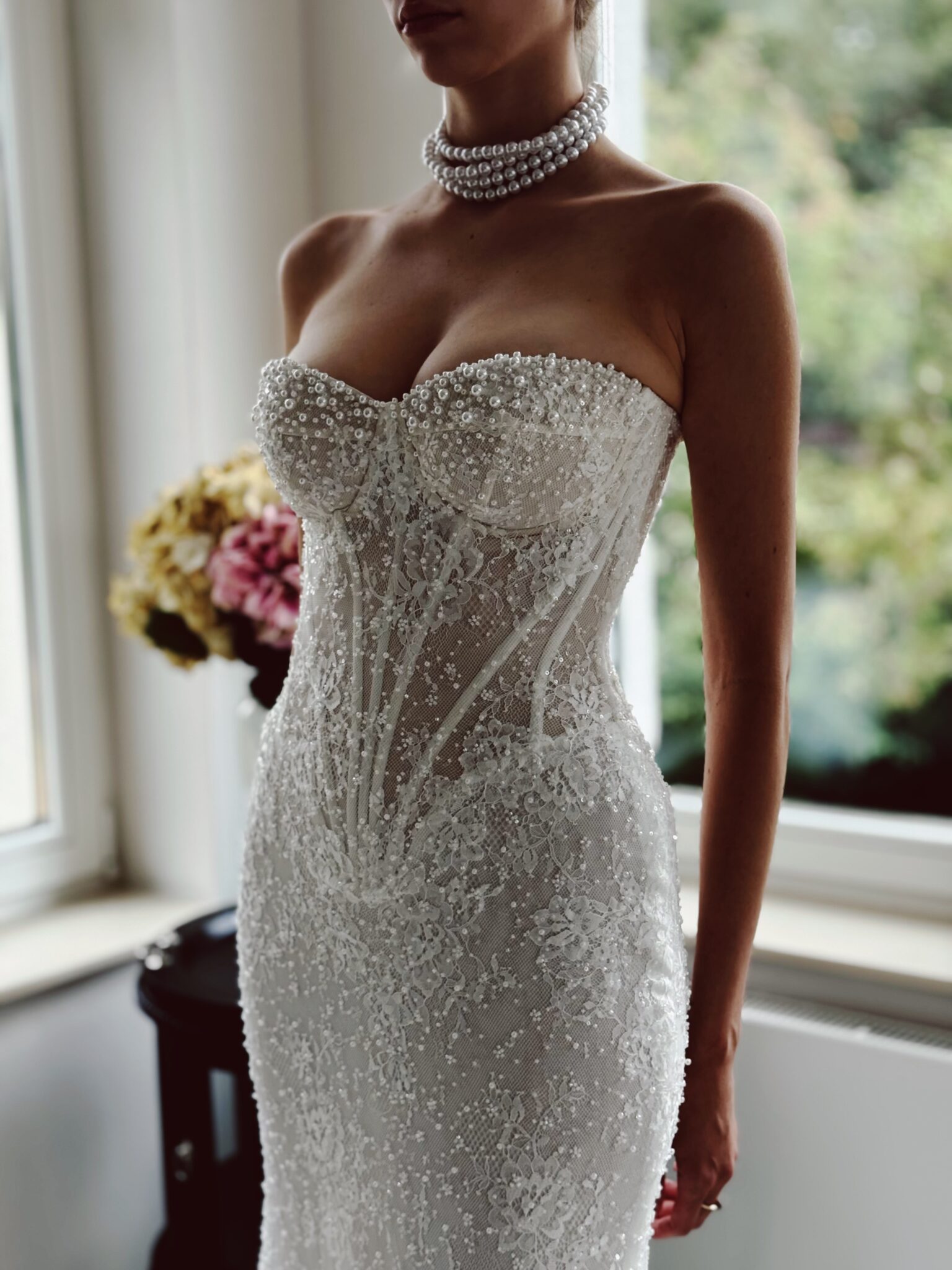 Fit & flare von Milla Nova - BELEN mit einer transparenten Korsage, einem Herzausschnitt und allover Perlen-Spitzenapplikationen. Das Kleid in Gr. 36 passte gut. Unser Model ist 1,78 m, trägt Gr. 36/38 und hat Körbchengröße: 75E mit den Maßen: B: 89cm, T: 66cm, H:97cm.