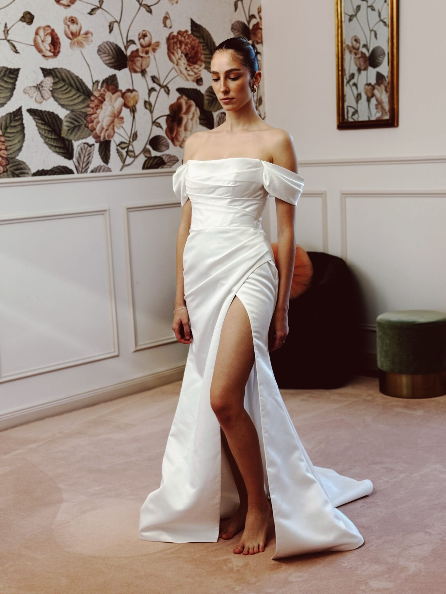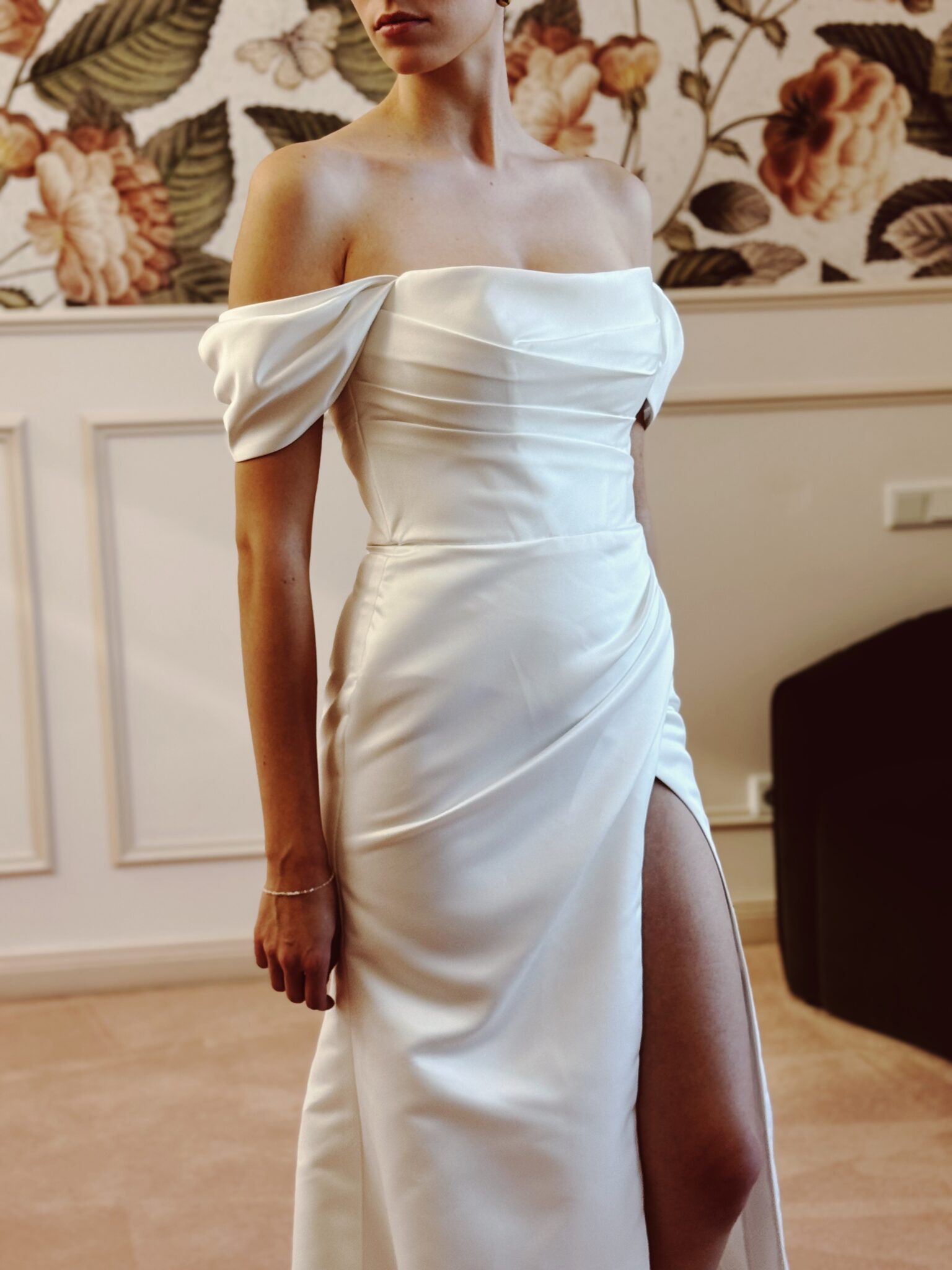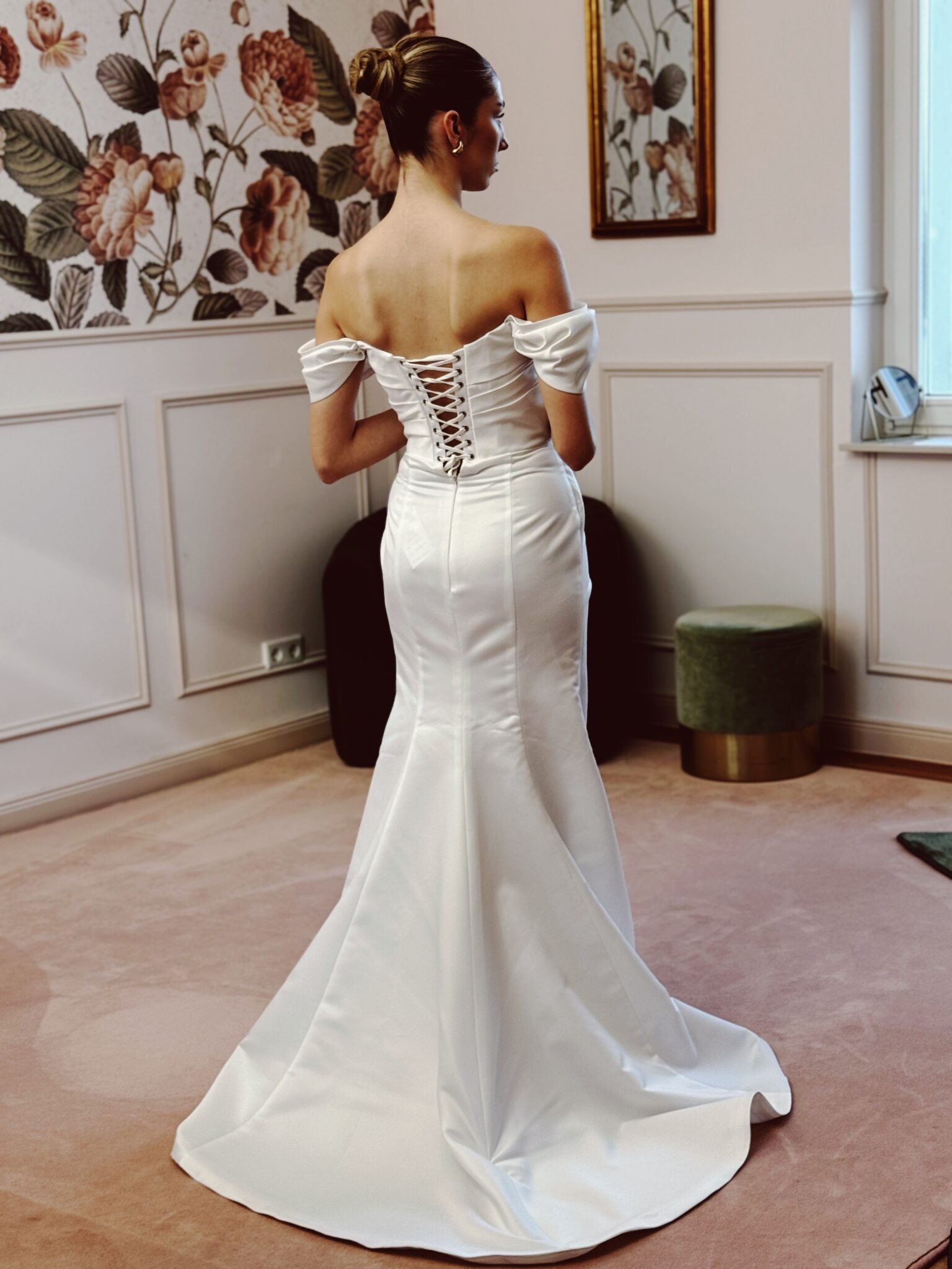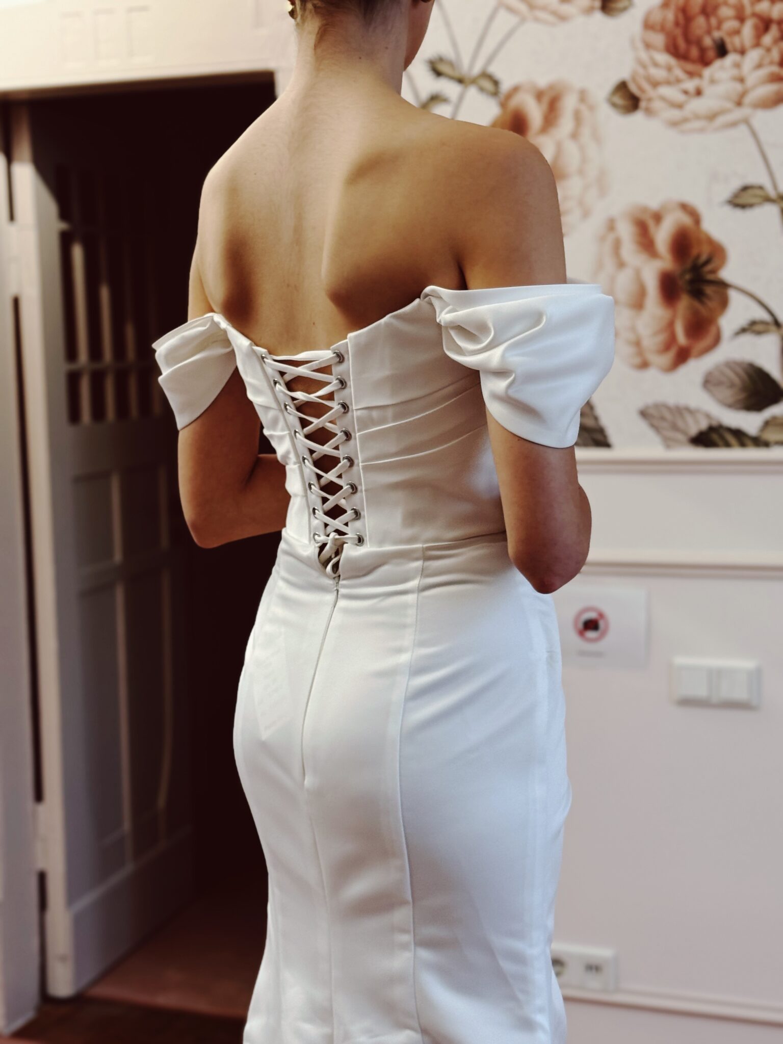Fit & flare Kleid aus Satin: Milla Nova - ERNA mit Schnürung im Rücken, Beinschlitz & Carmenträgern. Das Kleid in Gr. 36 saß in der Hüfte ein wenig eng: Unser Model ist 1,78 m, trägt Gr. 36/38 und hat Körbchengröße: 75E mit den Maßen: B: 89cm, T: 66cm, H:97cm.