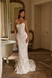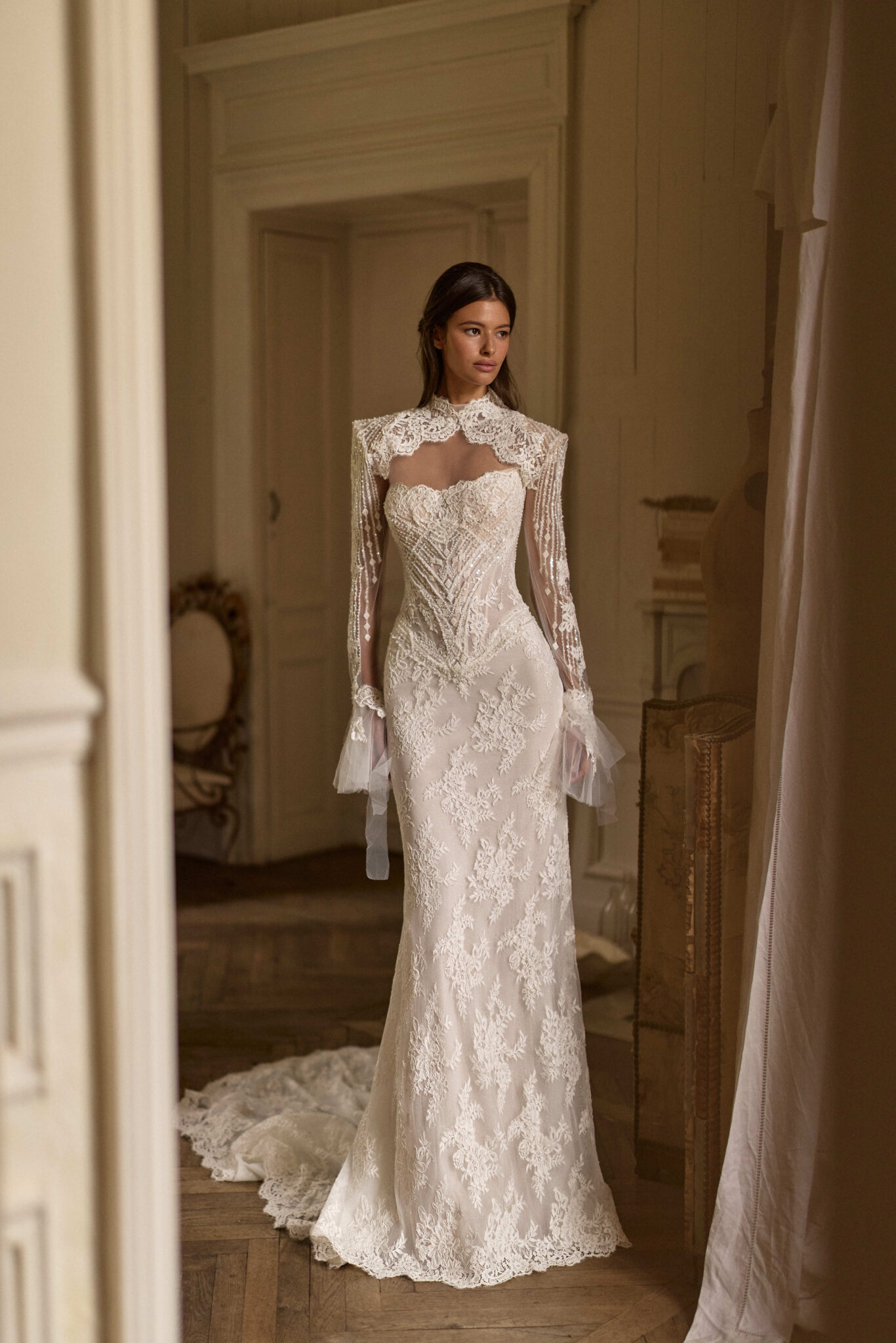 Meerjungfrauen-Brautkleid aus kunstvoll verzierter Chantilly-Spitze. Die trägerlose Silhouette schmiegt sich perfekt an den Körper und ist aufwendig von Hand mit schimmernder Perlenstickerei veredelt. Ergänzt wird das Design durch einen abnehmbaren Bolero aus Spitze mit langen Ärmeln und hohem Kragen, der einen nahtlosen Übergang von der Trauung zur Feier ermöglicht.