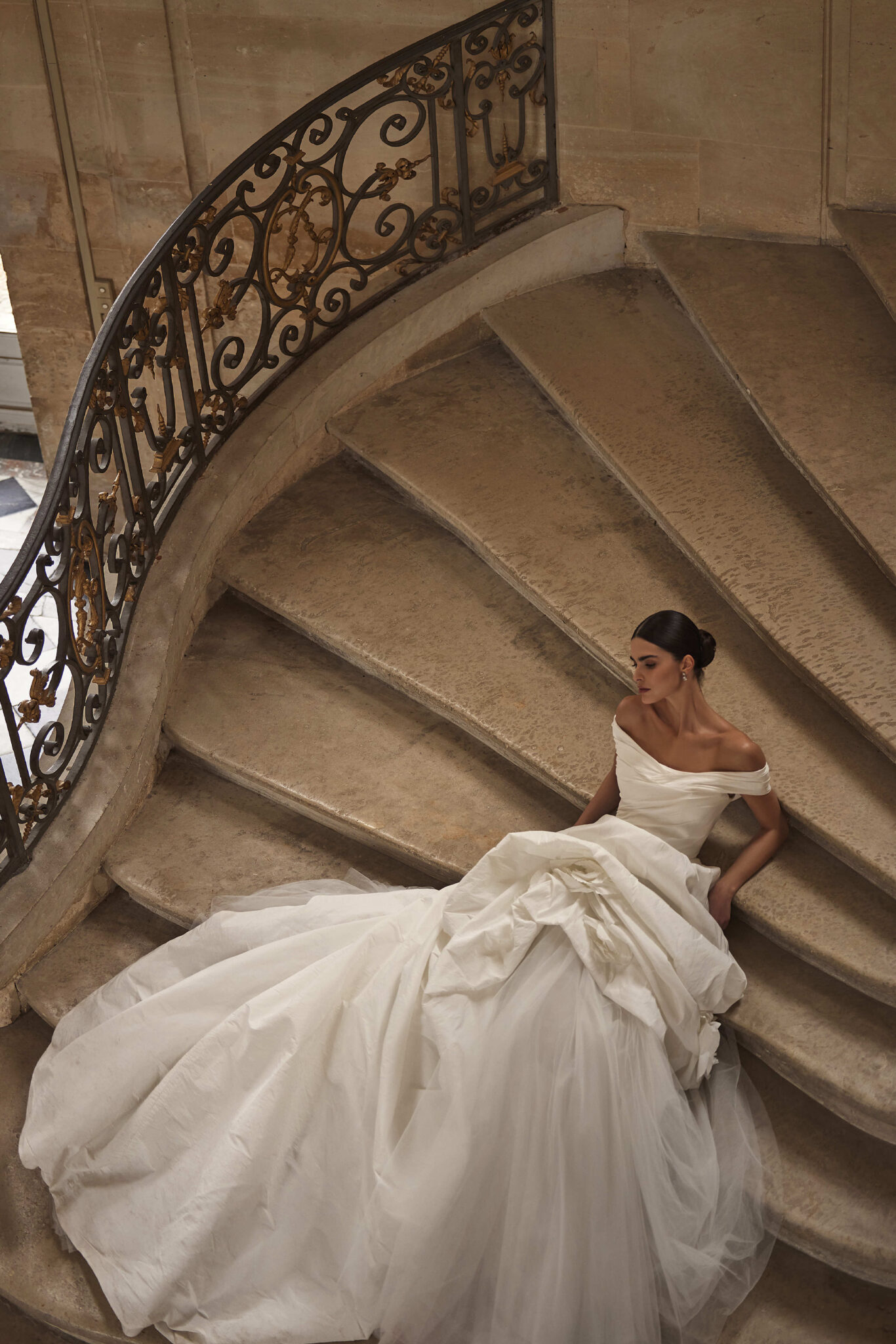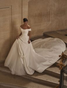 Designer A-Linie Kleid aus Crash-Satin: Milla Nova - HARVEY mit 3D-Blüten, Carmenträgern & Tüll-Einsatz im Rock. Das Kleid in Gr. 38 war ein wenig groß: Unser Model ist 1,78 m, trägt Gr. 36/38 und hat Körbchengröße: 75E mit den Maßen: B: 89cm, T: 66cm, H:97cm.