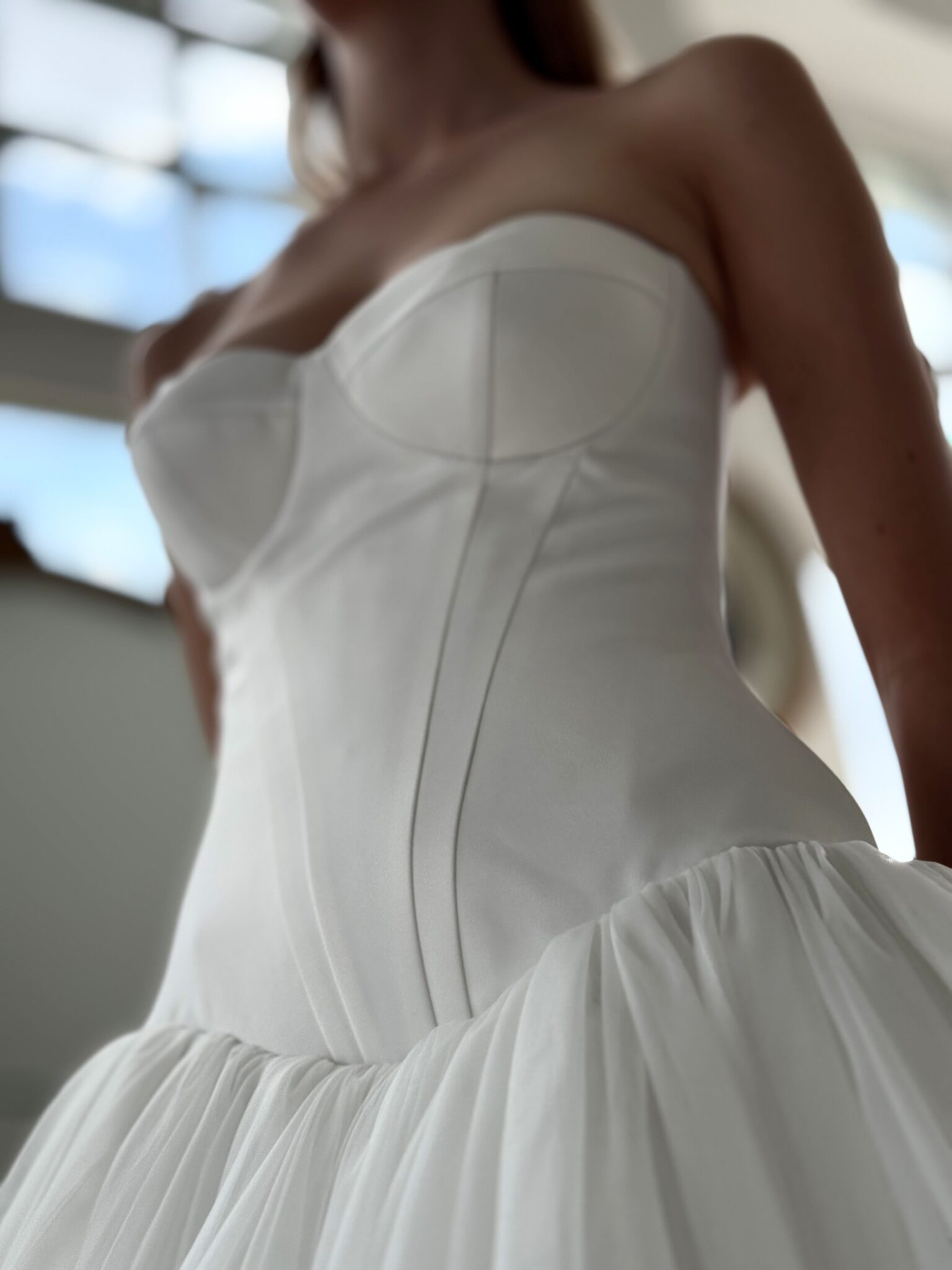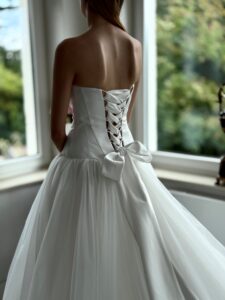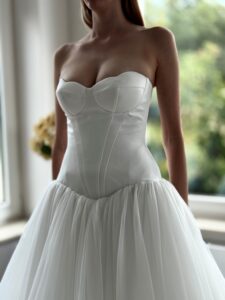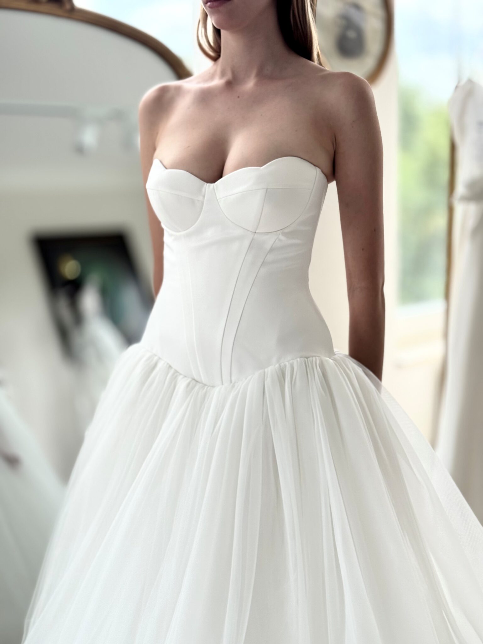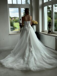 Prinzessin von Milla Nova - LUMIERE mit tief angesetztem Korsett aus Satin, muschelförmigem/herzförmigem Ausschnitt und voluminösem Rock aus Tüll. Das Kleid in Gr. 36 passte gut. Unser Model ist 1,78 m, trägt Gr. 36/38 und hat Körbchengröße: 75E mit den Maßen: B: 89cm, T: 66cm, H:97cm.