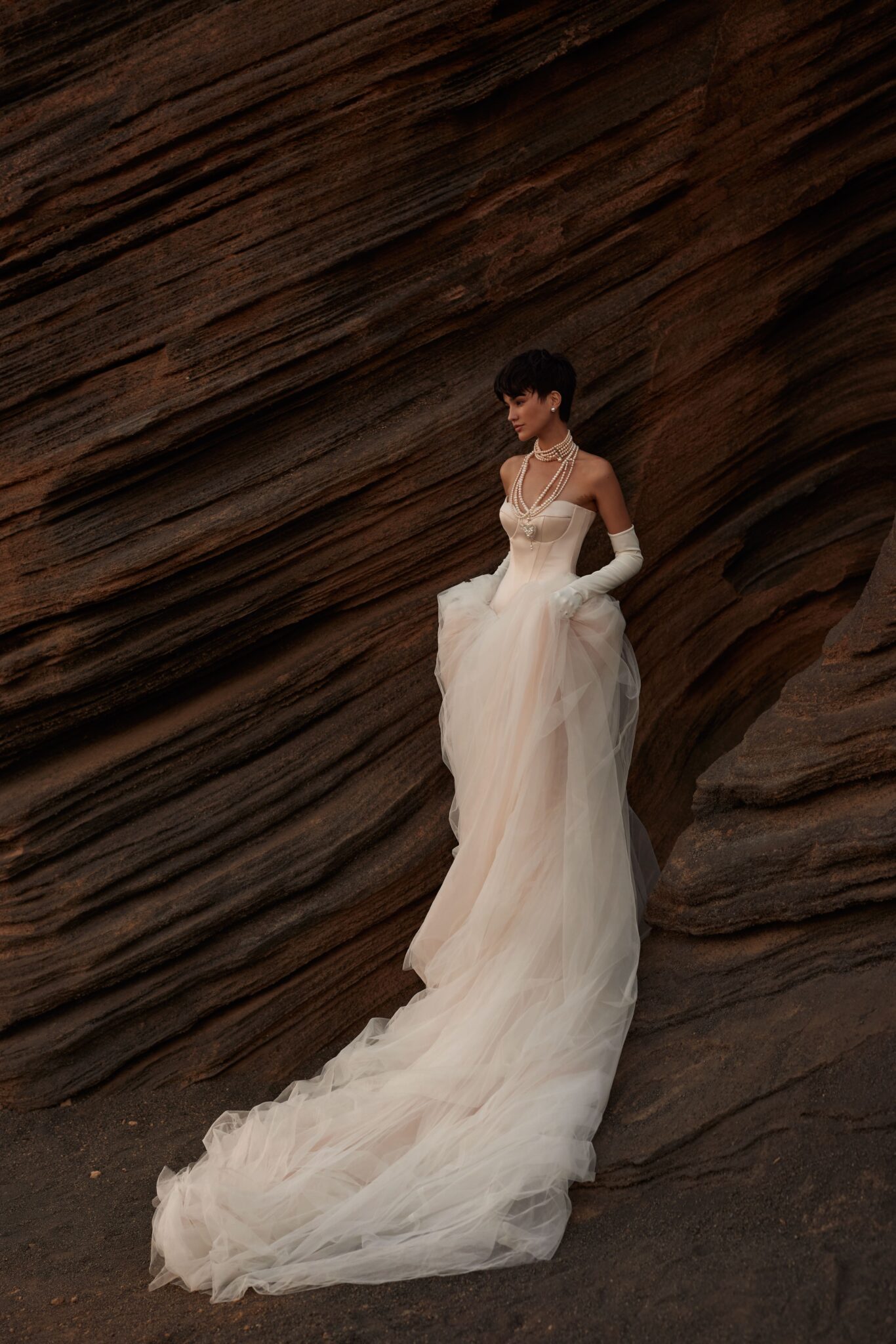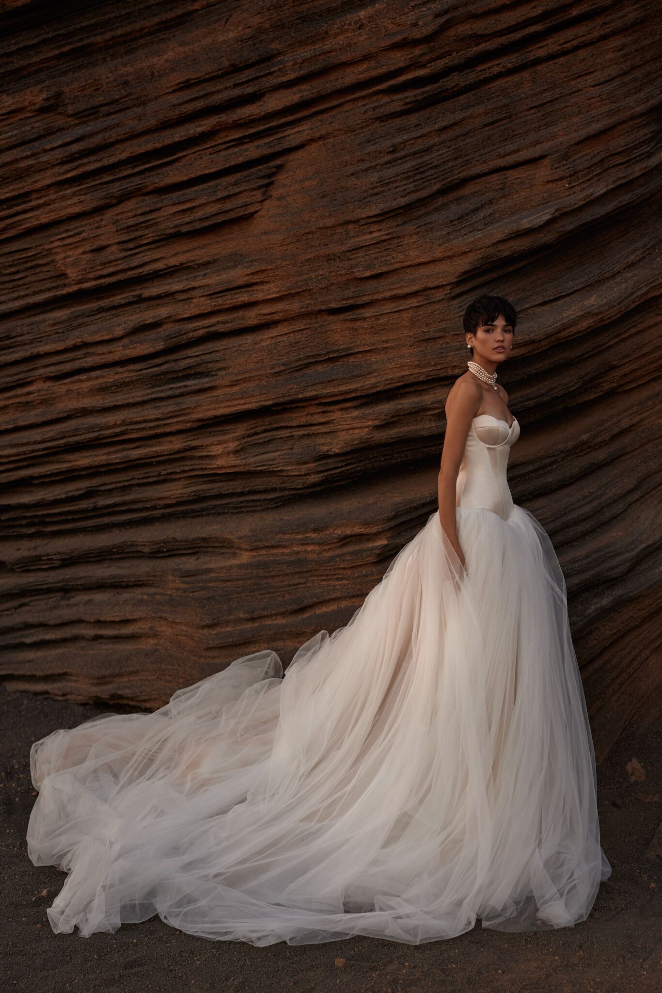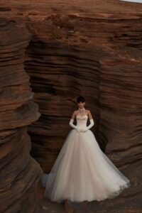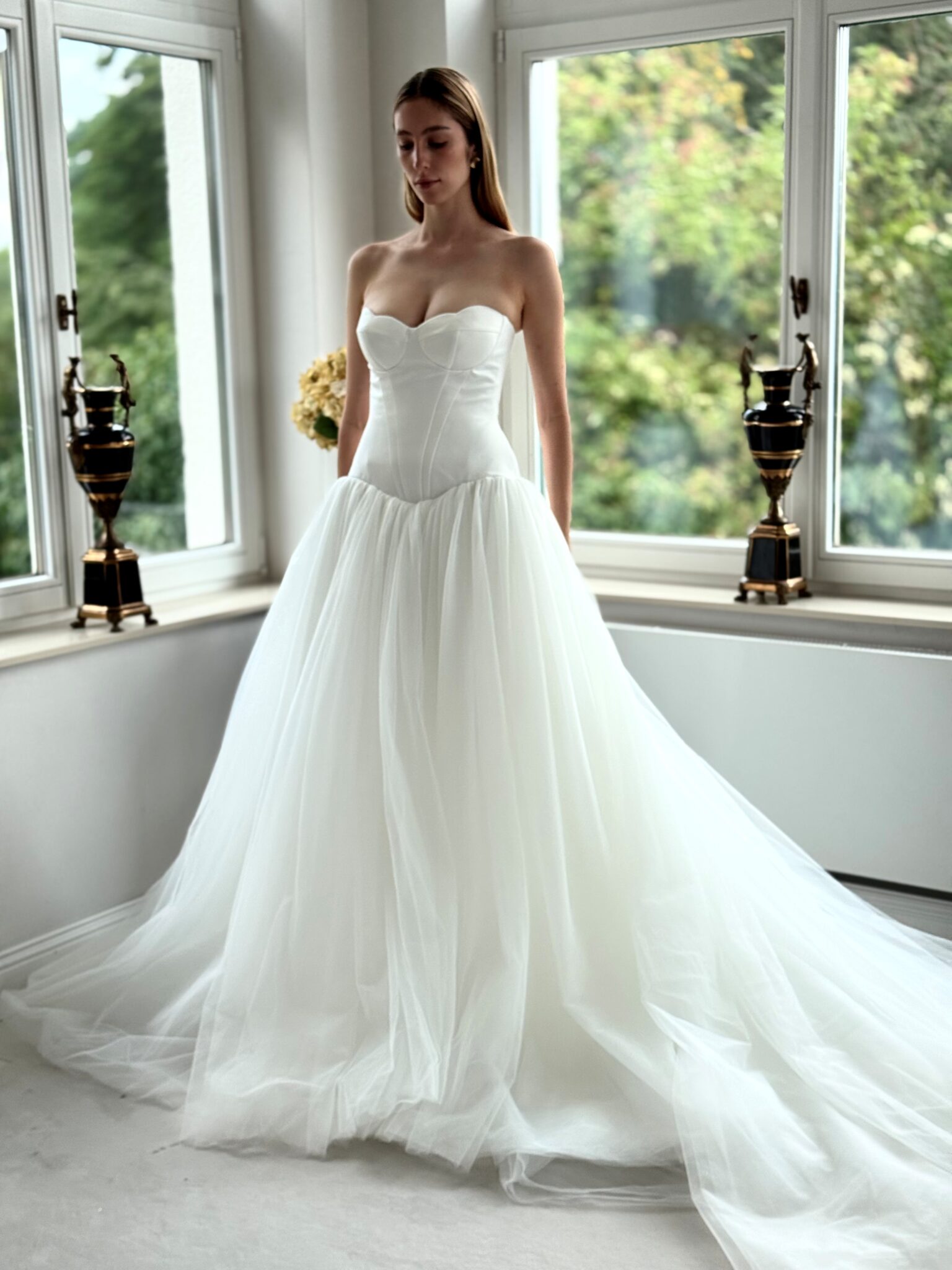 Prinzessin von Milla Nova - LUMIERE mit tief angesetztem Korsett aus Satin, muschelförmigem/herzförmigem Ausschnitt und voluminösem Rock aus Tüll. Das Kleid in Gr. 36 passte gut. Unser Model ist 1,78 m, trägt Gr. 36/38 und hat Körbchengröße: 75E mit den Maßen: B: 89cm, T: 66cm, H:97cm.