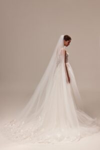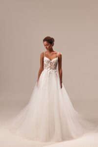 Designer A-Linie von Milla Nova - MARCIA hat eine transparente Corsage mit Lingerie-Effekt, die leicht mit Spitze bedeckt ist. Das Kleid in Gr. 36 passte. Unser Model ist 1,78 m, trägt Gr. 36/38 und hat Körbchengröße: 75E mit den Maßen: B: 89cm, T: 66cm, H:97cm.