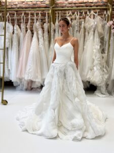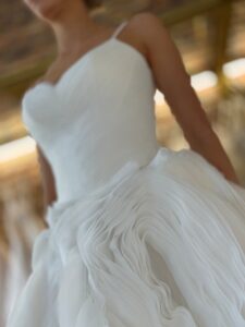 Prinzessin von Milla Nova - MARTEEN mit herzförmigem Corsagen-Oberteil und Spaghettiträgern, Schnürung im Rücken und voluminösem Rock aus organzaähnlichen Lagen mit Federoptik. . Das Kleid in Gr. 36 passte gut: Unser Model ist 1,78 m, trägt Gr. 36/38 und hat Körbchengröße: 75E mit den Maßen: B: 89cm, T: 66cm, H:97cm.