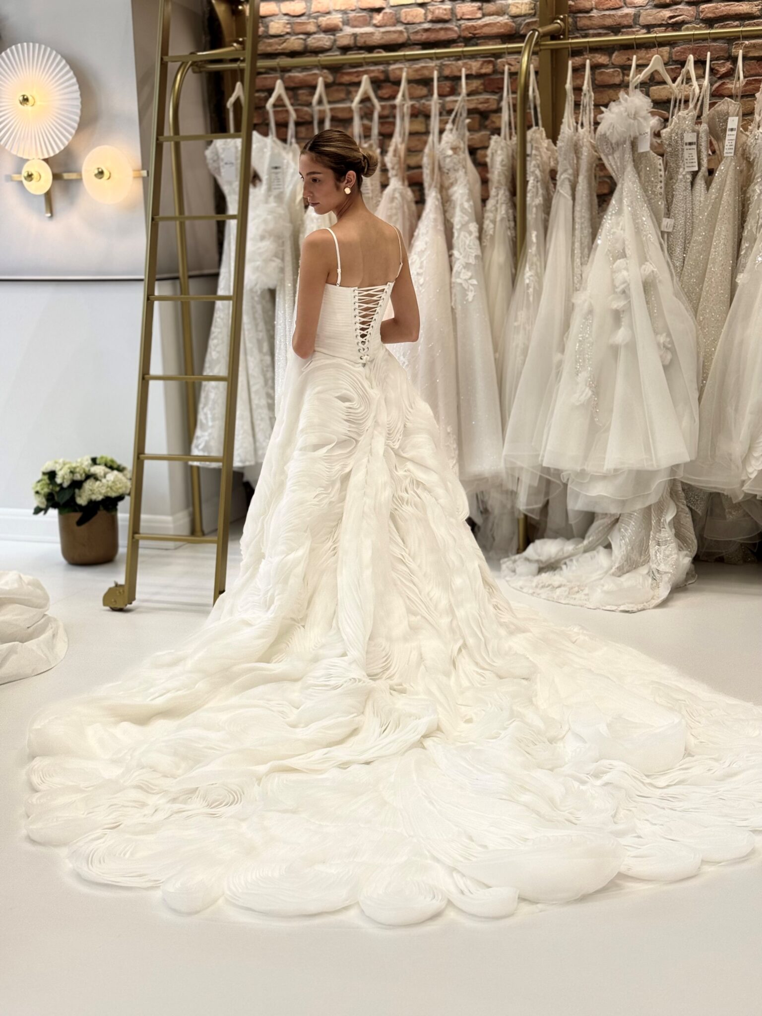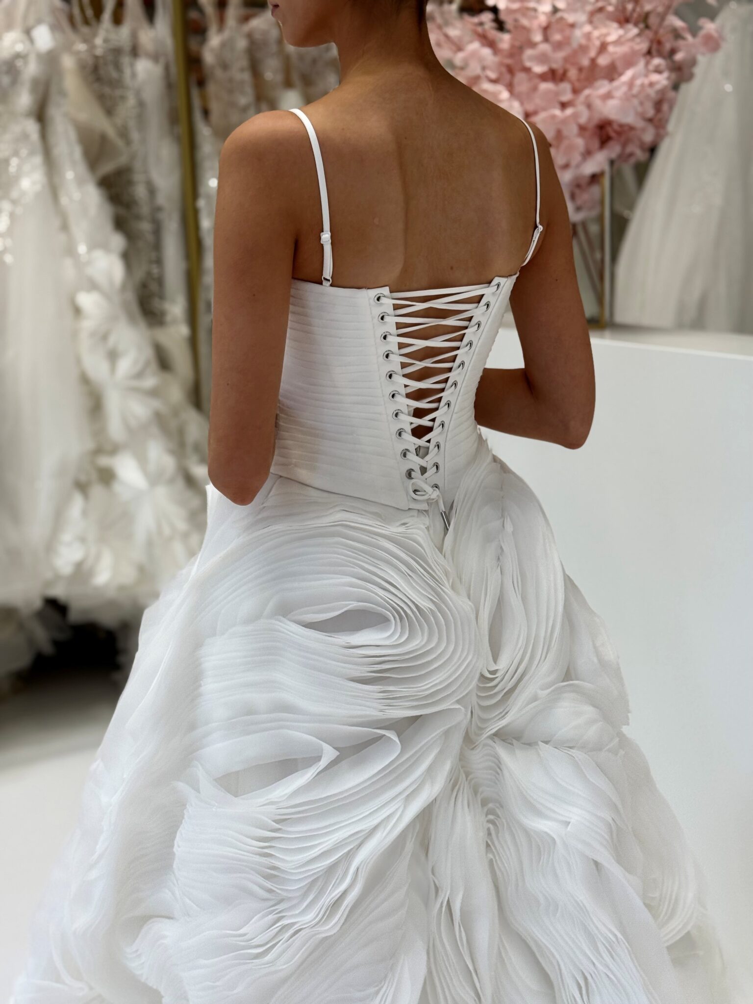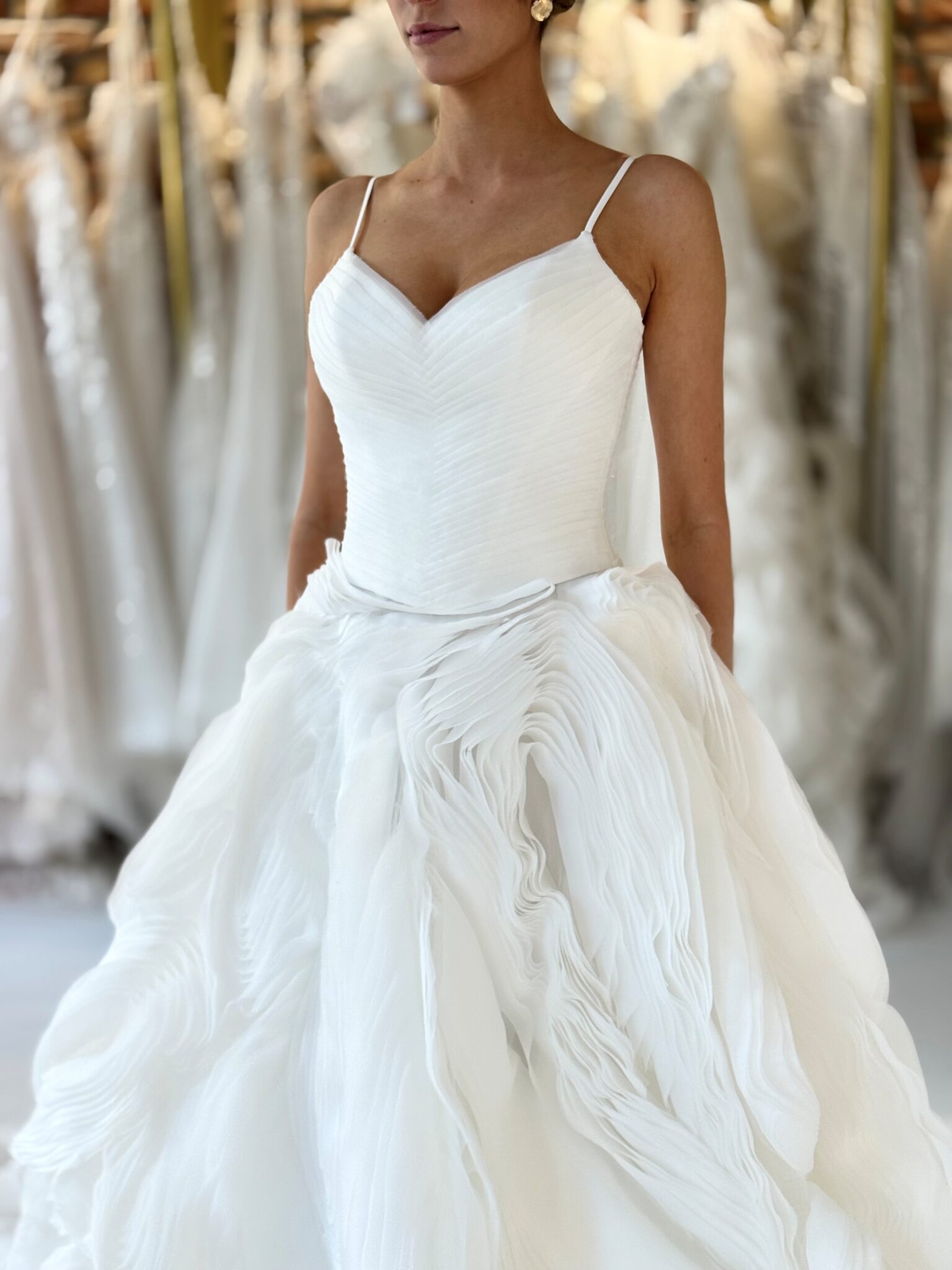 Prinzessin von Milla Nova - MARTEEN mit herzförmigem Corsagen-Oberteil und Spaghettiträgern, Schnürung im Rücken und voluminösem Rock aus organzaähnlichen Lagen mit Federoptik. . Das Kleid in Gr. 36 passte gut: Unser Model ist 1,78 m, trägt Gr. 36/38 und hat Körbchengröße: 75E mit den Maßen: B: 89cm, T: 66cm, H:97cm.