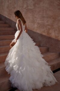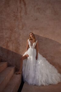 A-Linie Kleid aus Soft-Tüll: Milla Nova - MARYGOLD mit 3D-Blüten im Rock, Raffungen in der Korsage & Schnürung im Rücken. Das Kleid in Gr. 38 war ein wenig locker: Unser Model ist 1,78 m, trägt Gr. 36/38 und hat Körbchengröße: 75E mit den Maßen: B: 89cm, T: 66cm, H:97cm.